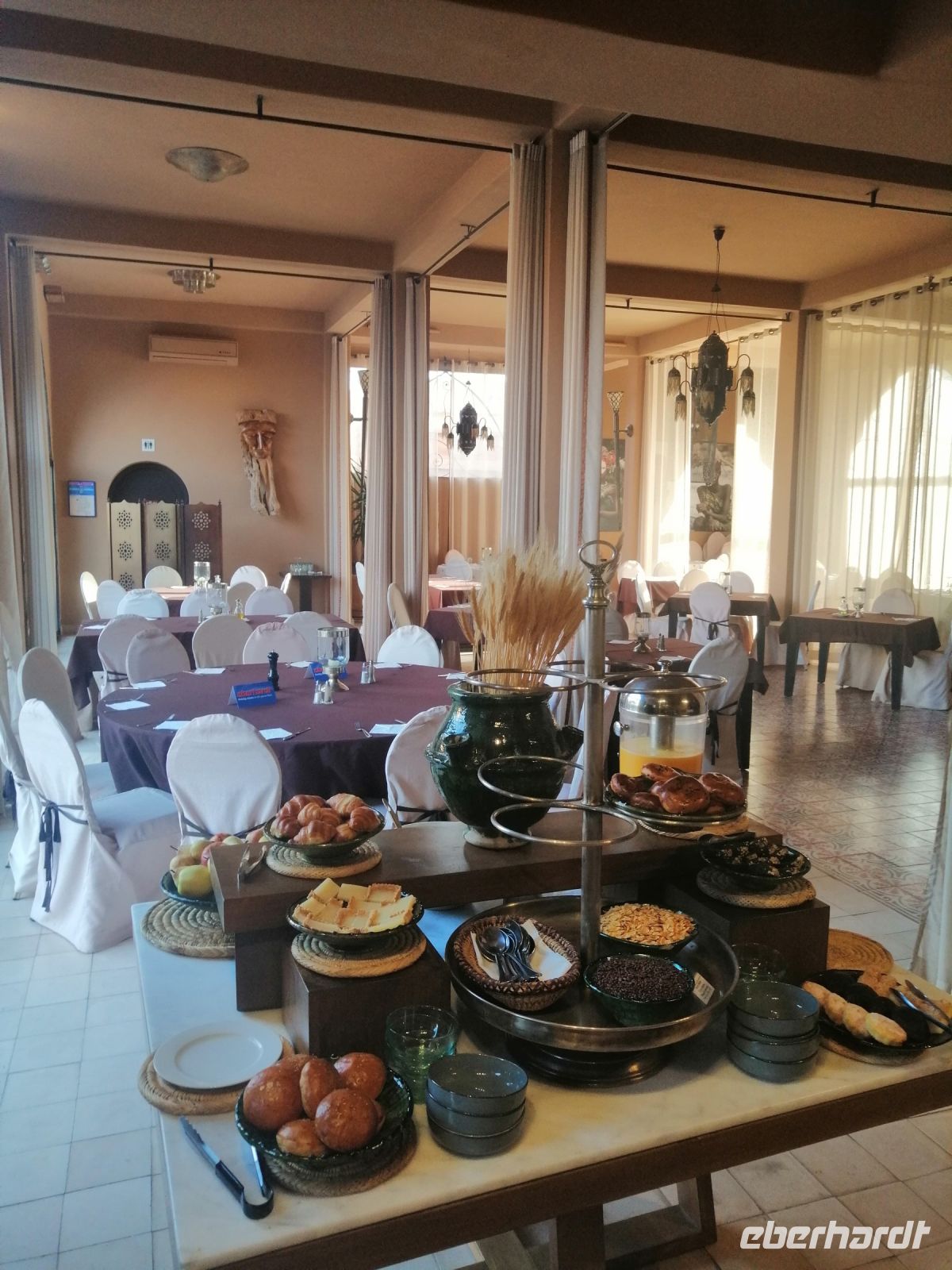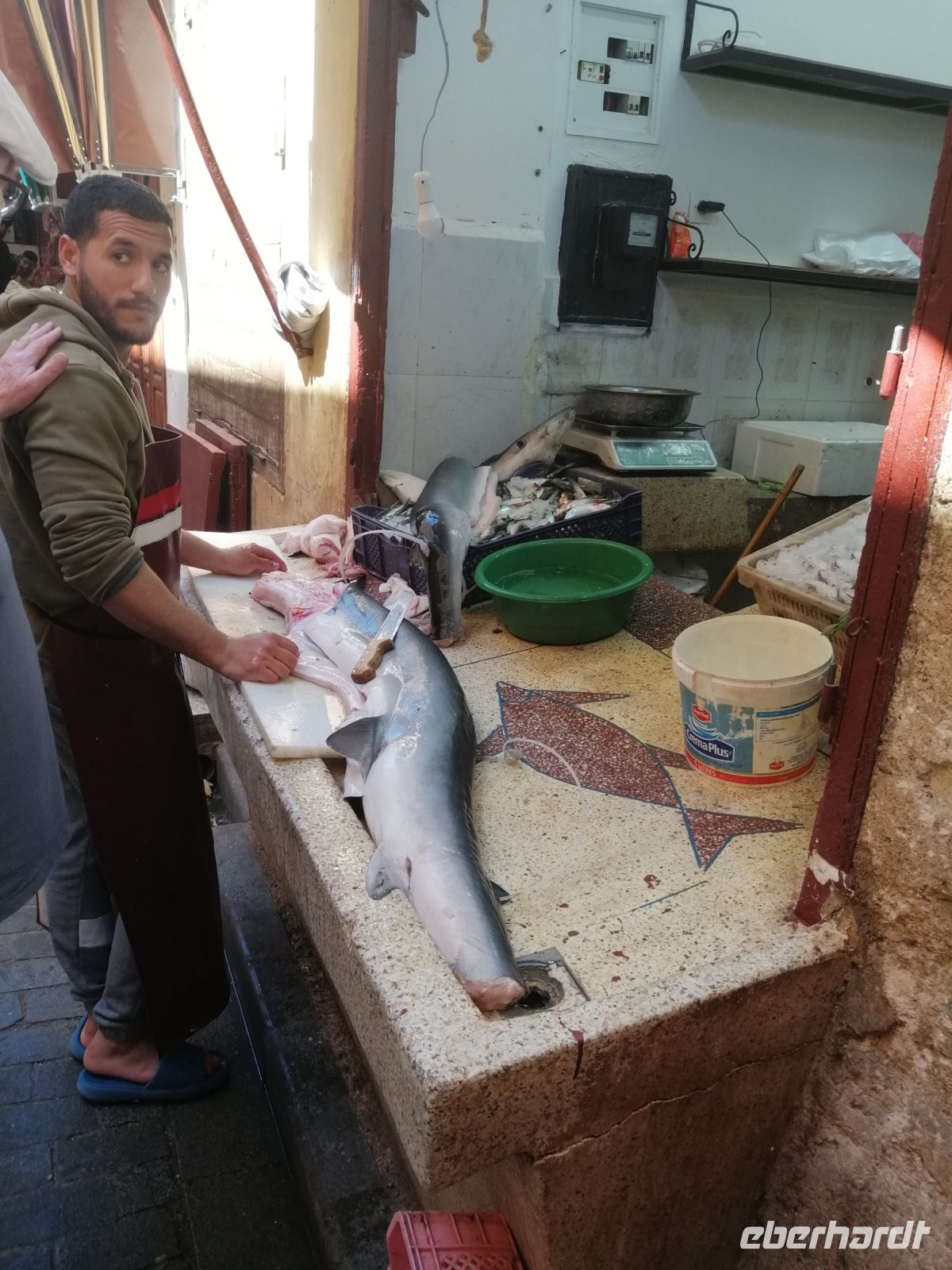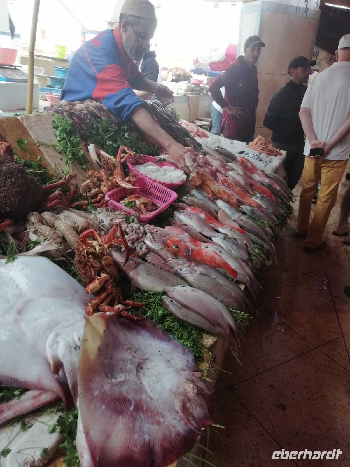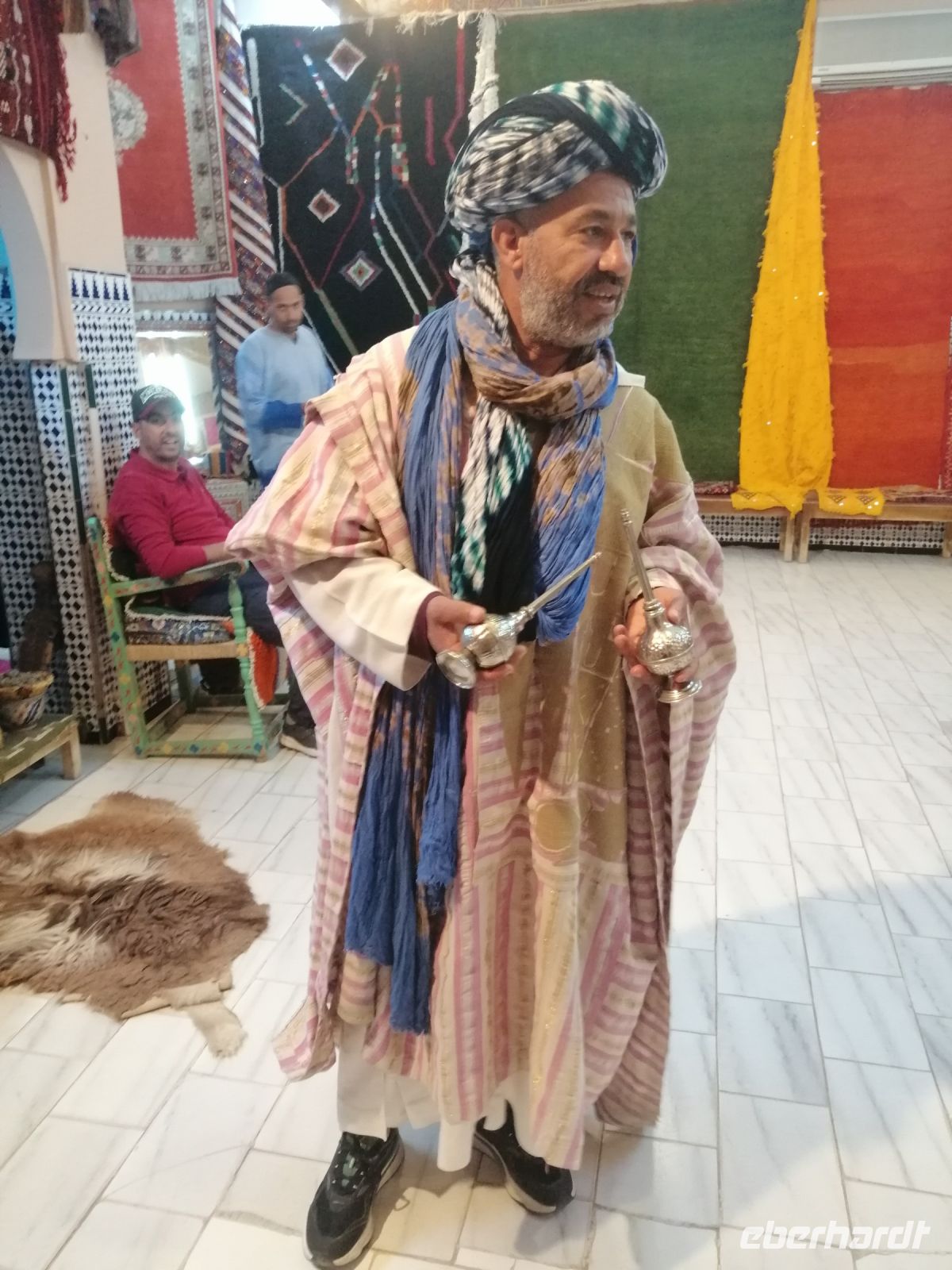 Nach der Ankunft in Essaouira gegen Mittag, unternehmen wir einen Rundgang durch den Hafen und schauten uns das Treiben der Fischer und der Händler an. Anschließend ging es durch das „Tor der Marine“, auf dem alle Religionen abgebildet sind, Richtung Medina von Essaouira. Die Stadt ist für hervorragende und kunstvolle Intarsienarbeiten aus verschiedenen Holzarten, vor allem Zitronenbaum- und Ebenholz sehr bekannt. In einer Holzwerkstatt wurden einige Reisegäste findig und erwarben wunderschöne Holzprodukte. Während der weiteren Erkundung der Altstadt von Essaouira spazierten wir durch die engen Gassen der Medina, mit ihrer vielen Händlern, bis zur Bastion Nord – eine Art Festung an der Küstenpromenade. Der Nachmittag stand dann allen Gästen zur freien Verfügung. Einige nutzten die Zeit für einen Küstenspaziergang und beobachteten viele Kite- und Windsurfer, denn die Region um Essaouira wird vom Passat zwischen April und Anfang Oktober mit Wind versorgt. Das Wasser im Atlantik ist kühl, im Sommer etwa 22° Grad im Frühjahr 18° Grad. Dadurch hat die Region auch im Hochsommer ein angenehmes Klima. Der Temperaturkontrast zwischen Meer und Hinterland sorgt für eine thermische Verstärkung und beschleunigt den Passat hier mit großer Beständigkeit auf 6 – 8 Beaufort (starker Wind), besonders in den Hochsommermonaten Juli und August. Der Wind setzt morgens ab ca. 9 Uhr langsam ein und steigert sich im Laufe des Tages auf Maximalstärke. Die Faustregel in Marokko lautet: im Sommer ist der Wind stark und die Wellen bleiben klein, im Winter ist es umgekehrt.