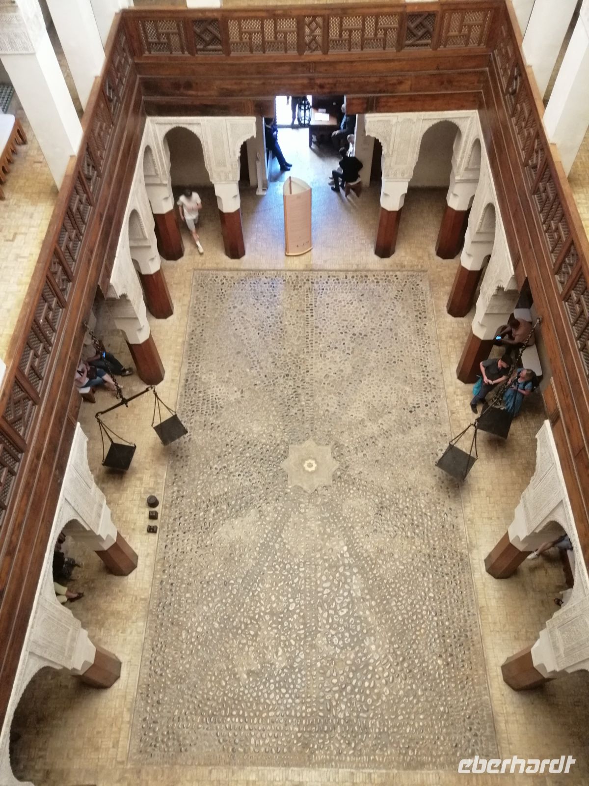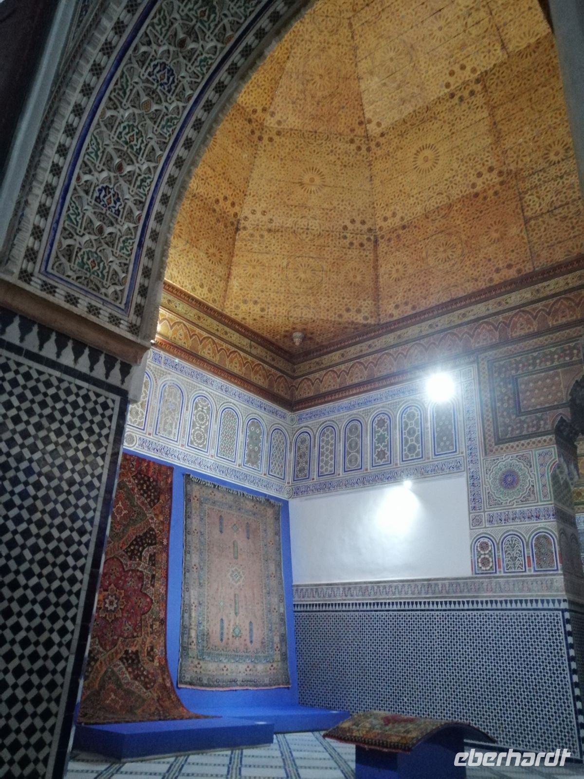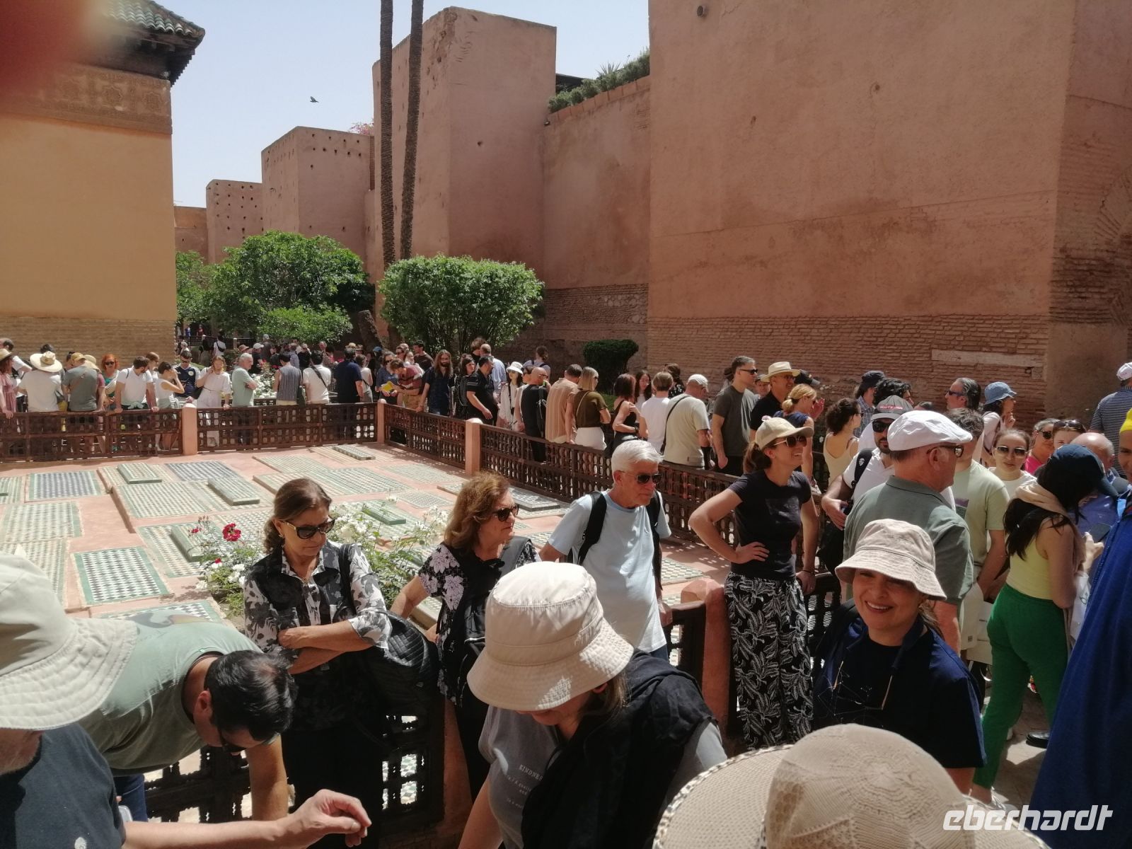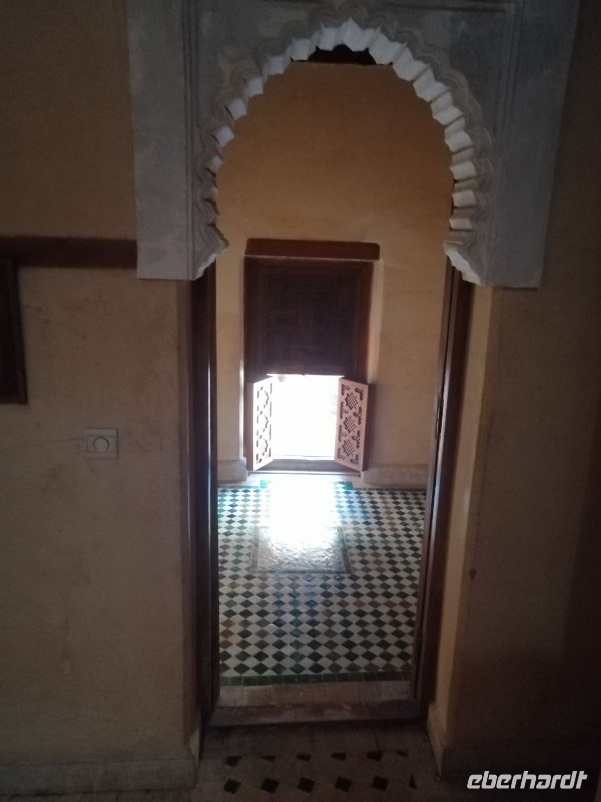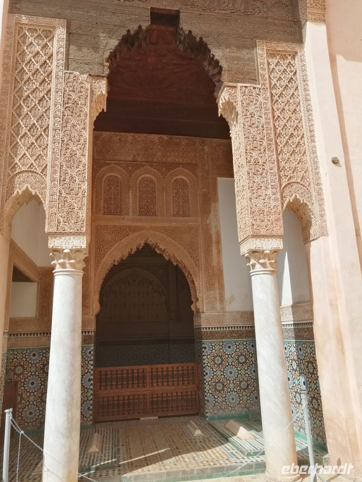 In diesem Mausoleum befinden sich die Gräber mehrerer enger Familienangehöriger und Vertrauter der Saadier-Herrscher. Unter der Traufe des mit grün glasierten Ziegeln bedeckten Daches verläuft ein aus Zedernholz geschnitztes Schriftband. Darunter zieht sich ein breiteres, netzförmiges Band. Im unteren Bereich des Mausoleums sind die Wände mit Fayencemosaiken verziert. Die Kalligraphie-Zeichen symbolisieren die Koranfersen. Im Nordteil des Gebäudes befinden sich auf den beiden gegenüberliegenden Seiten zwei Loggien. Sie werden von prunkvollen Giebelbauten aus Zedernholz überragt, die von je zwei Marmorsäulen gestützt werden. Hinter diesen liegt ein kleiner Gebetsraum. Dort befindet sich das Grab von Lalla Massouda. Die Mutter des Sultans Ahmad el Mansur wurde hier 1591 beigesetzt. Trotz Hitze stellten wir uns in die lange Warteschlange, bestehend aus vielen verschiedenen Touristengruppen aus der ganzen Welt und schauten uns den Saal der Könige (auch „Saal der zwölf Säulen“ genannt) an. Dabei handelte es sich um ein großes Mausoleum, in dem sich auch das Grab von Sultan al-Mansur befindet. Die Kuppel des Mausoleums ist aus Zedernholz geschnitzt und wird von Säulen aus italienischen Carrara Marmor getragen. Der Boden im Mausoleum ist mit Mosaiken bedeckt. In der Grabkammer stehen Särge von mehreren Saadier-Sultanen mit ihren Familienangehörigen.
