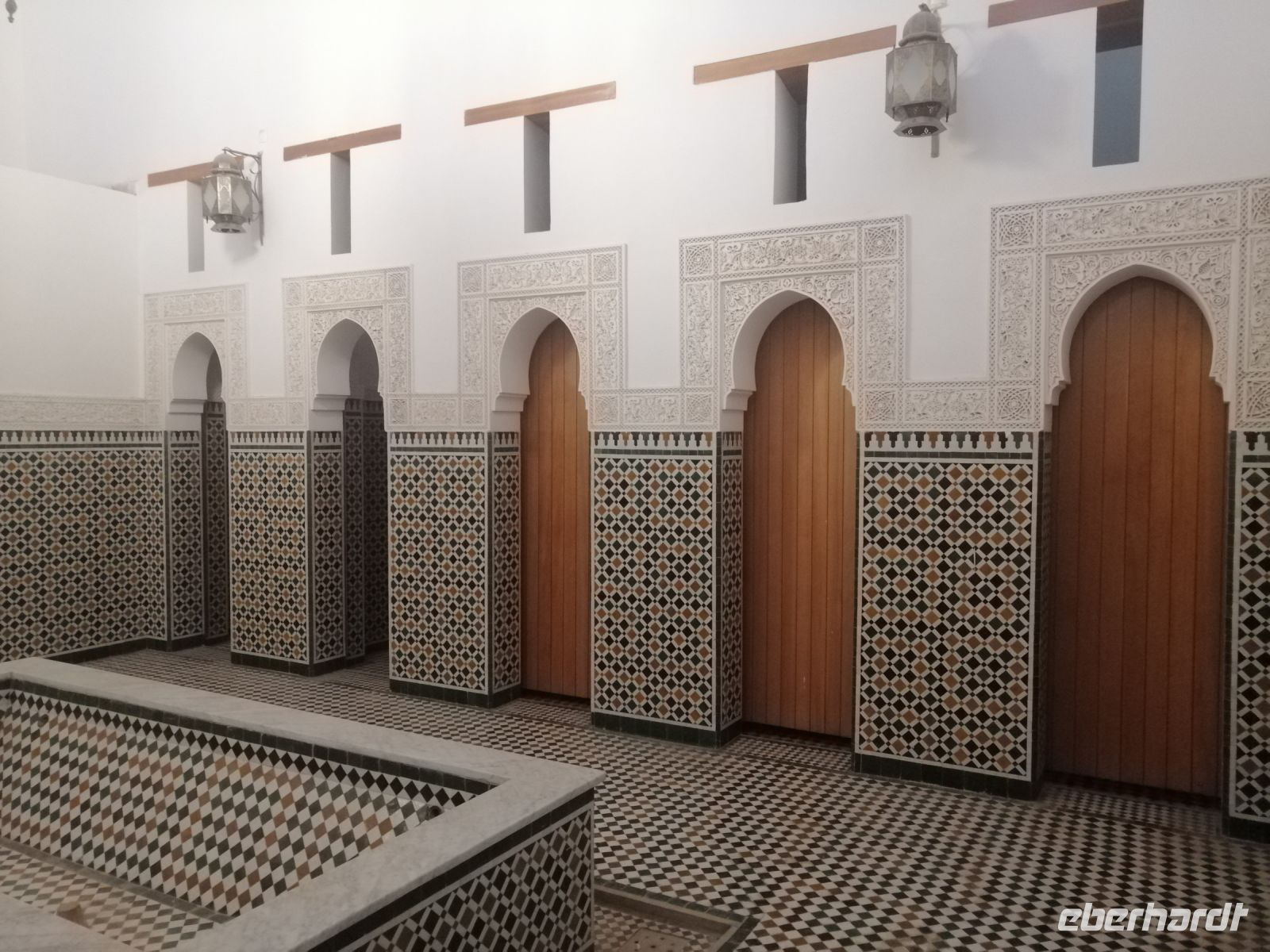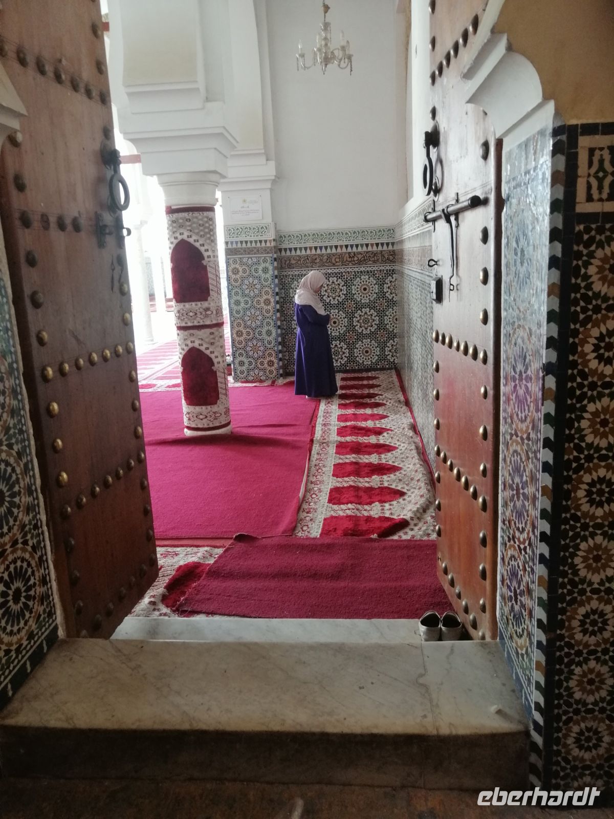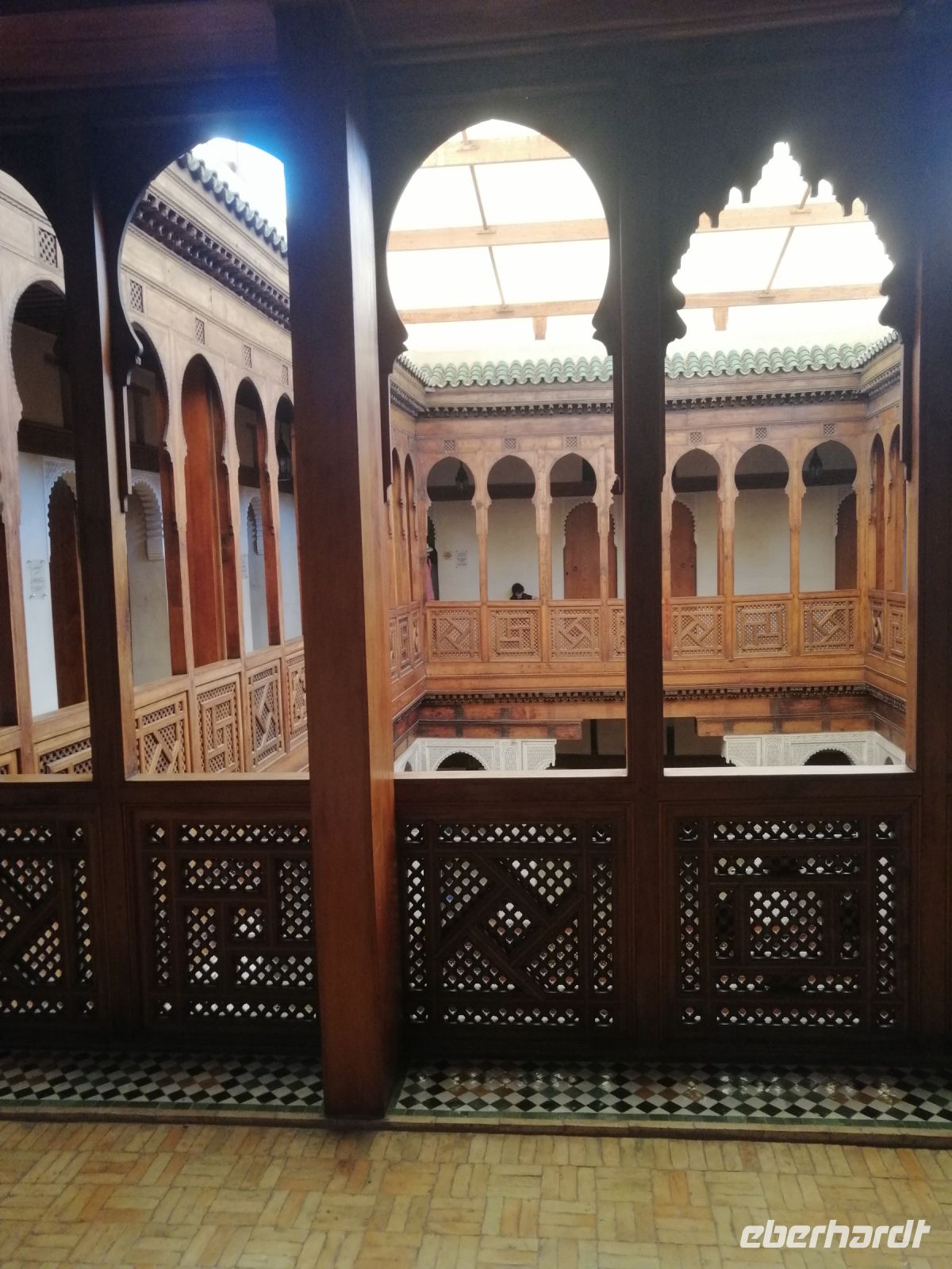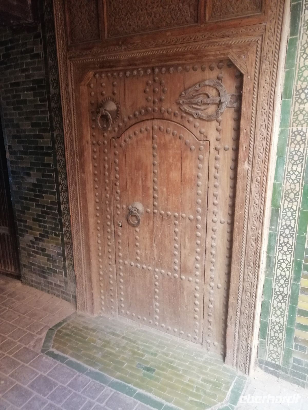 In diesem Mausoleum befinden sich die Gräber mehrerer enger Familienangehöriger und Vertrauter der Saadier-Herrscher. Unter der Traufe des mit grün glasierten Ziegeln bedeckten Daches verläuft ein aus Zedernholz geschnitztes Schriftband. Darunter zieht sich ein breiteres, netzförmiges Band. Im unteren Bereich des Mausoleums sind die Wände mit Fayencemosaiken verziert. Die Kalligraphie-Zeichen symbolisieren die Koranfersen. Im Nordteil des Gebäudes befinden sich auf den beiden gegenüberliegenden Seiten zwei Loggien. Sie werden von prunkvollen Giebelbauten aus Zedernholz überragt, die von je zwei Marmorsäulen gestützt werden. Hinter diesen liegt ein kleiner Gebetsraum. Dort befindet sich das Grab von Lalla Massouda. Die Mutter des Sultans Ahmad el Mansur wurde hier 1591 beigesetzt. Trotz Hitze stellten wir uns in die lange Warteschlange, bestehend aus vielen verschiedenen Touristengruppen aus der ganzen Welt und schauten uns den Saal der Könige (auch „Saal der zwölf Säulen“ genannt) an. Dabei handelte es sich um ein großes Mausoleum, in dem sich auch das Grab von Sultan al-Mansur befindet. Die Kuppel des Mausoleums ist aus Zedernholz geschnitzt und wird von Säulen aus italienischen Carrara Marmor getragen. Der Boden im Mausoleum ist mit Mosaiken bedeckt. In der Grabkammer stehen Särge von mehreren Saadier-Sultanen mit ihren Familienangehörigen.