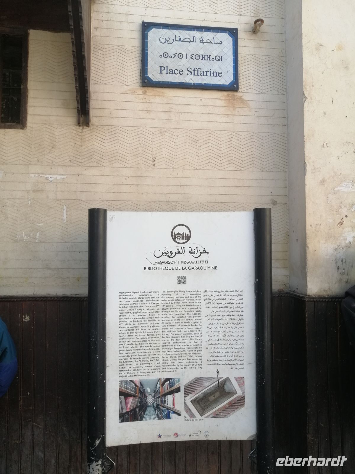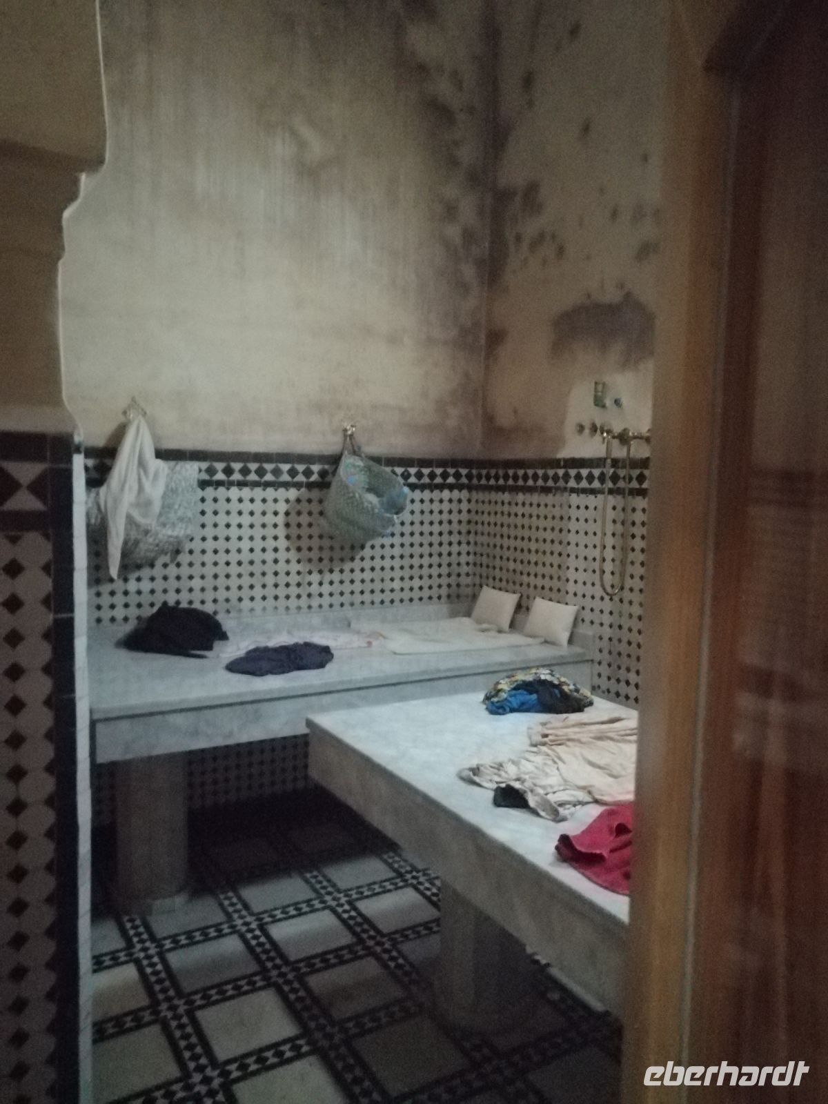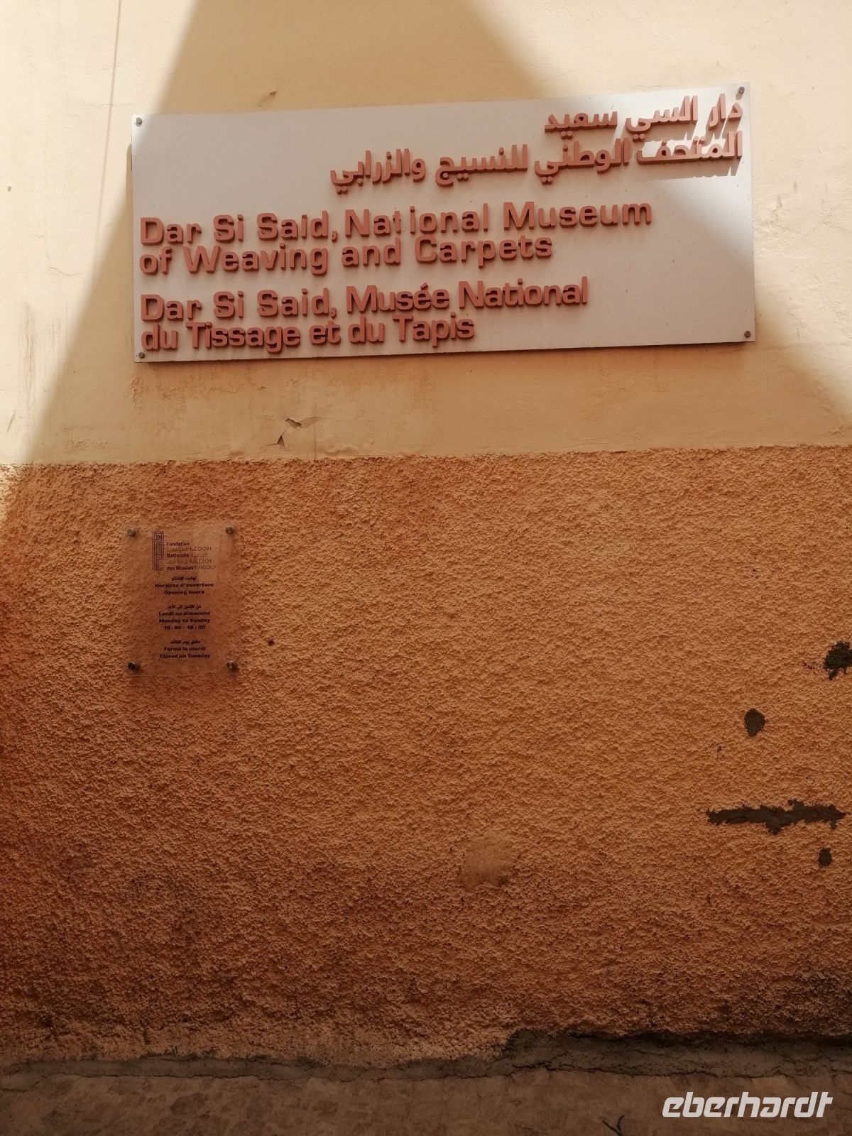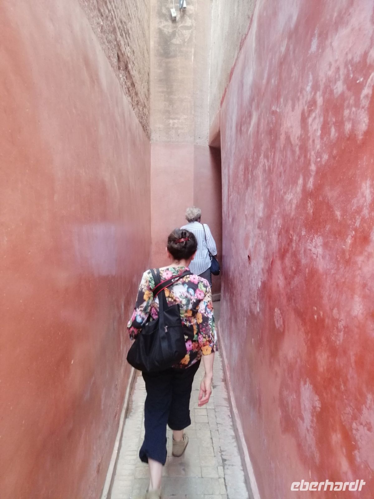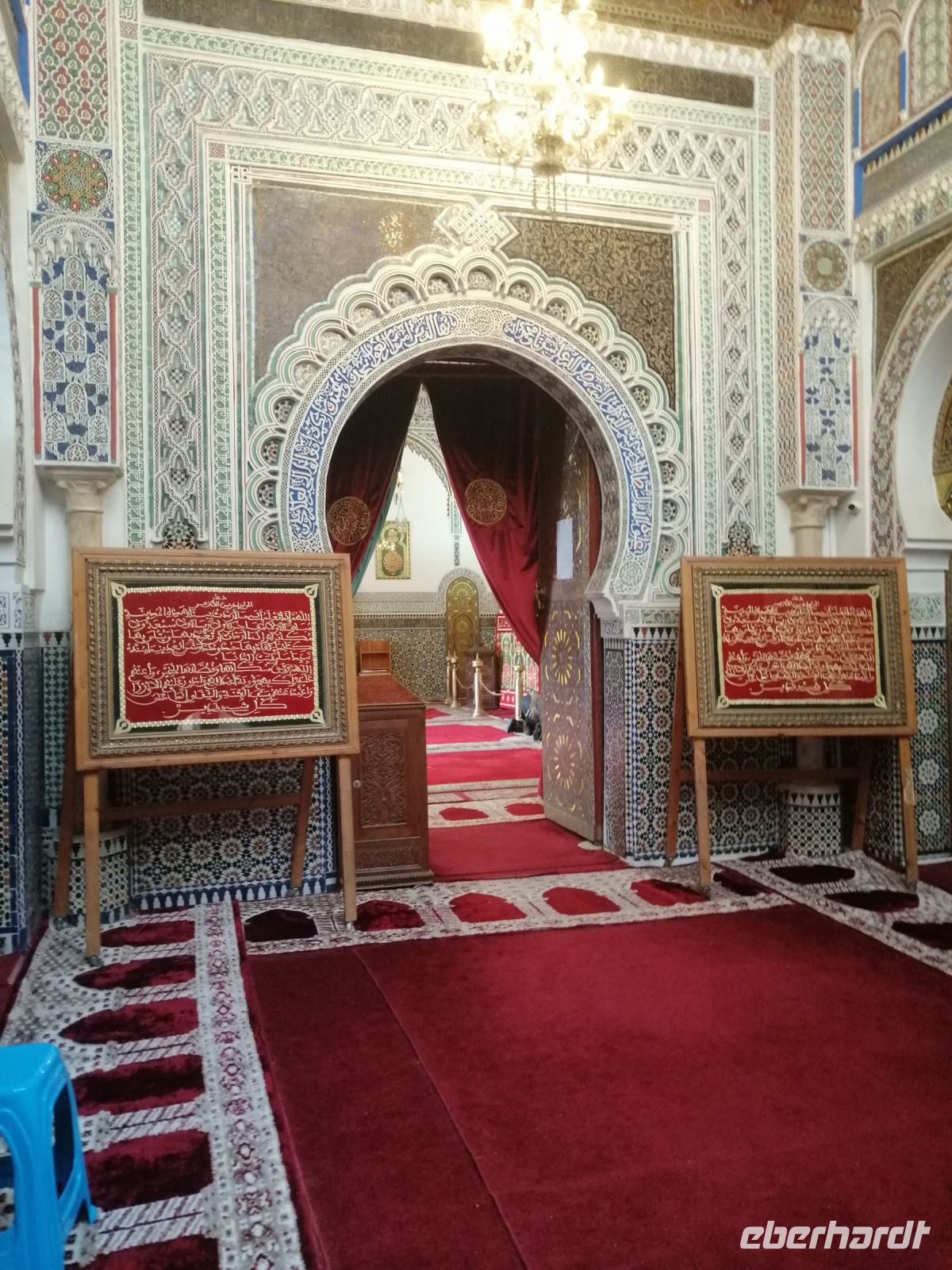 In diesem Mausoleum befinden sich die Gräber mehrerer enger Familienangehöriger und Vertrauter der Saadier-Herrscher. Unter der Traufe des mit grün glasierten Ziegeln bedeckten Daches verläuft ein aus Zedernholz geschnitztes Schriftband. Darunter zieht sich ein breiteres, netzförmiges Band. Im unteren Bereich des Mausoleums sind die Wände mit Fayencemosaiken verziert. Die Kalligraphie-Zeichen symbolisieren die Koranfersen. Im Nordteil des Gebäudes befinden sich auf den beiden gegenüberliegenden Seiten zwei Loggien. Sie werden von prunkvollen Giebelbauten aus Zedernholz überragt, die von je zwei Marmorsäulen gestützt werden. Hinter diesen liegt ein kleiner Gebetsraum. Dort befindet sich das Grab von Lalla Massouda. Die Mutter des Sultans Ahmad el Mansur wurde hier 1591 beigesetzt. Trotz Hitze stellten wir uns in die lange Warteschlange, bestehend aus vielen verschiedenen Touristengruppen aus der ganzen Welt und schauten uns den Saal der Könige (auch „Saal der zwölf Säulen“ genannt) an. Dabei handelte es sich um ein großes Mausoleum, in dem sich auch das Grab von Sultan al-Mansur befindet. Die Kuppel des Mausoleums ist aus Zedernholz geschnitzt und wird von Säulen aus italienischen Carrara Marmor getragen. Der Boden im Mausoleum ist mit Mosaiken bedeckt. In der Grabkammer stehen Särge von mehreren Saadier-Sultanen mit ihren Familienangehörigen.
