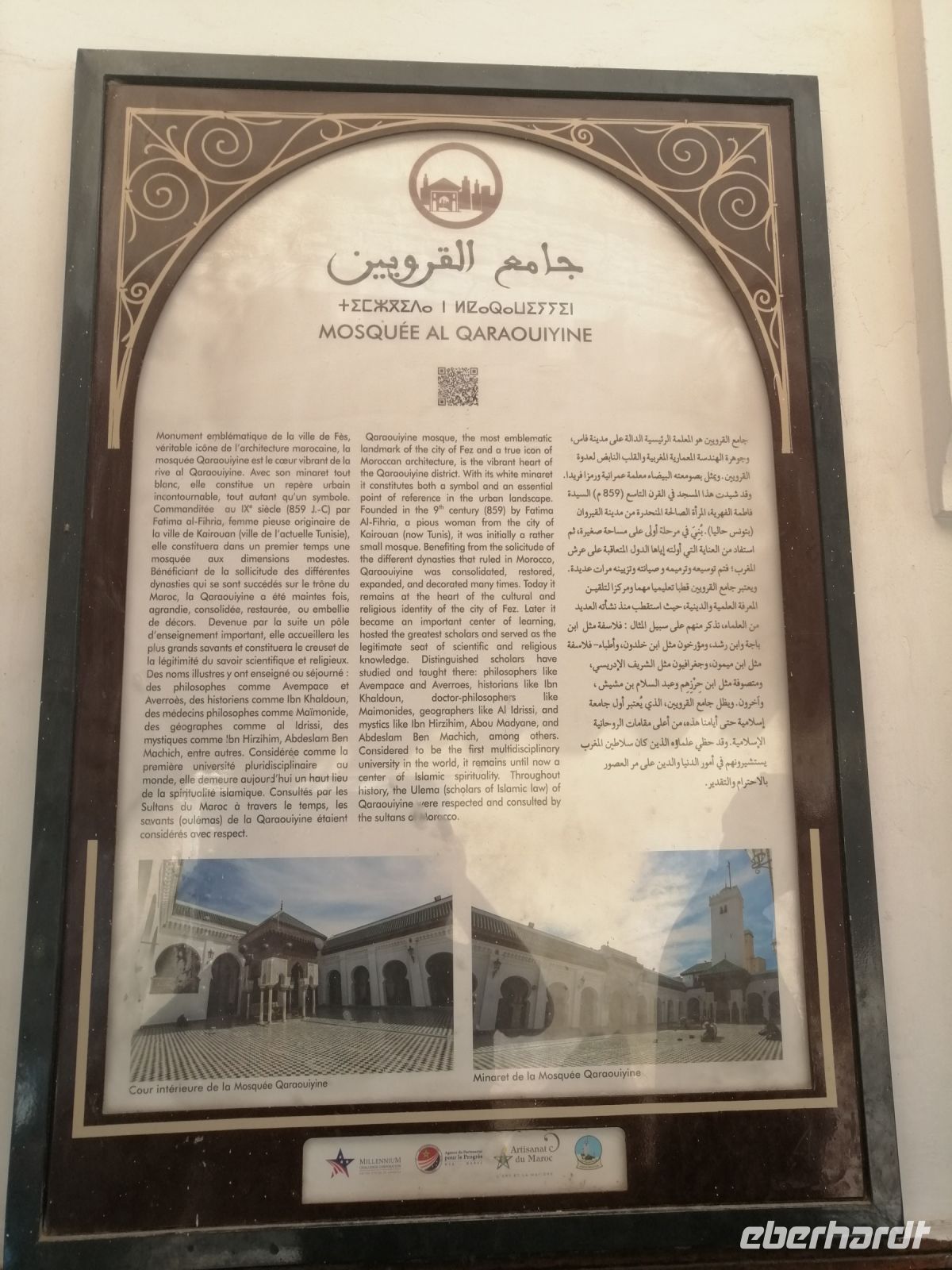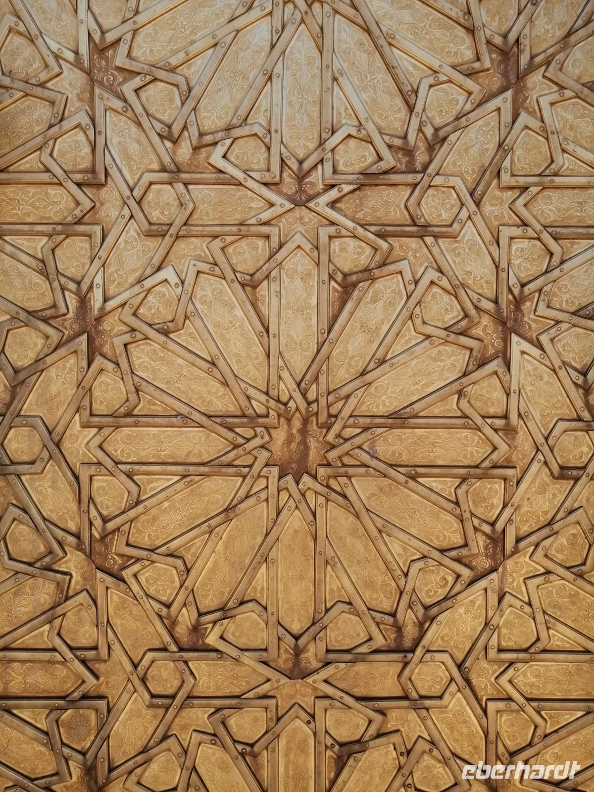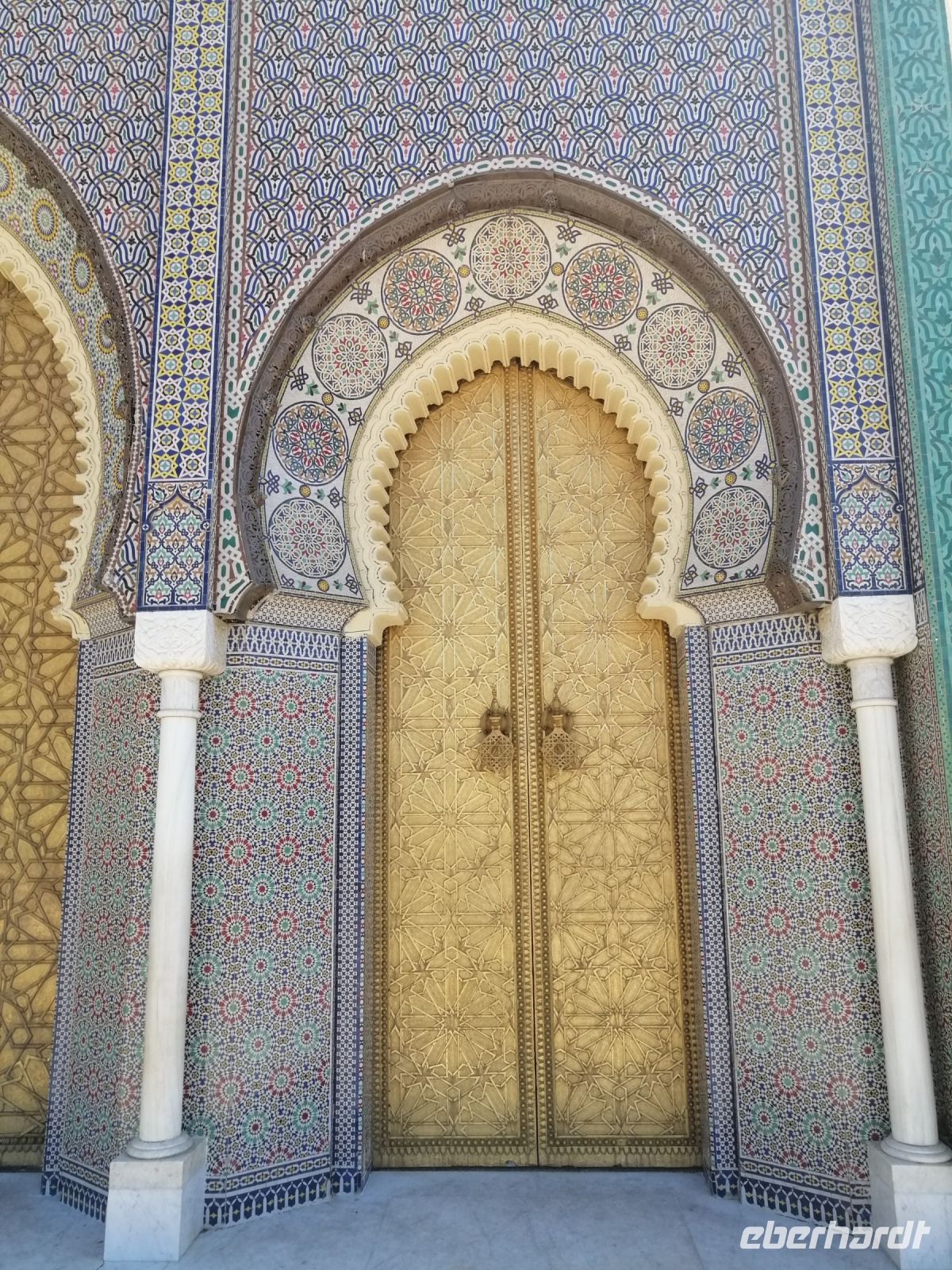 Gleich nach dem Frühstück fuhren wir mit unserem Bus zur südlichen Festung, wo unsere Stadtführung durch die zweite Königsstadt - Fes begann. Said, der an der Uni in Fes studierte, klärte uns zuerst über die zwei Stadtviertel der Stadt auf: Andalusier- und Kairaouine-Viertel, die die Medina von Fes bilden. Anschließend besichtigten wir den Königspalast in der Altstadt, der für Besucher geschlossen und nur von außen zu bewundern ist. Said erzählte uns über die 7 Tore und über das Spinnengewebe Gottes – ein mit Goldblech fein ziselierter Muster an einem der Tore.