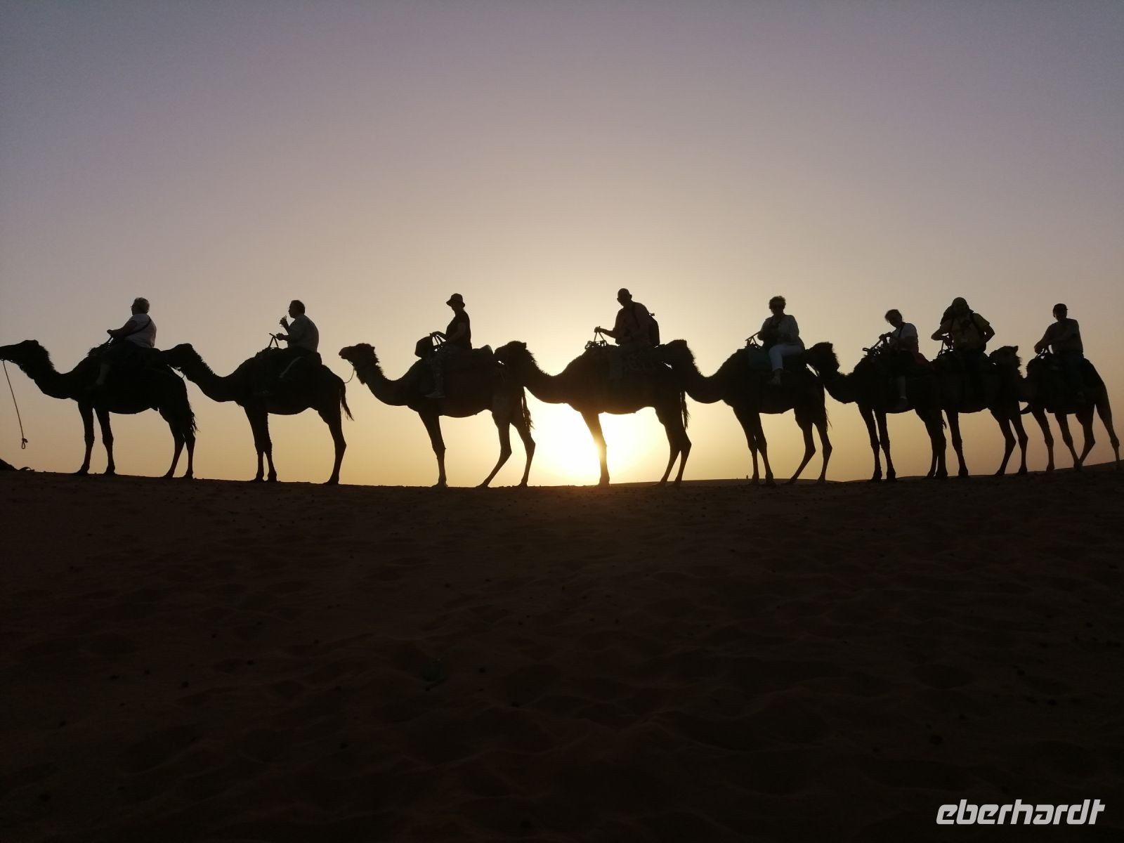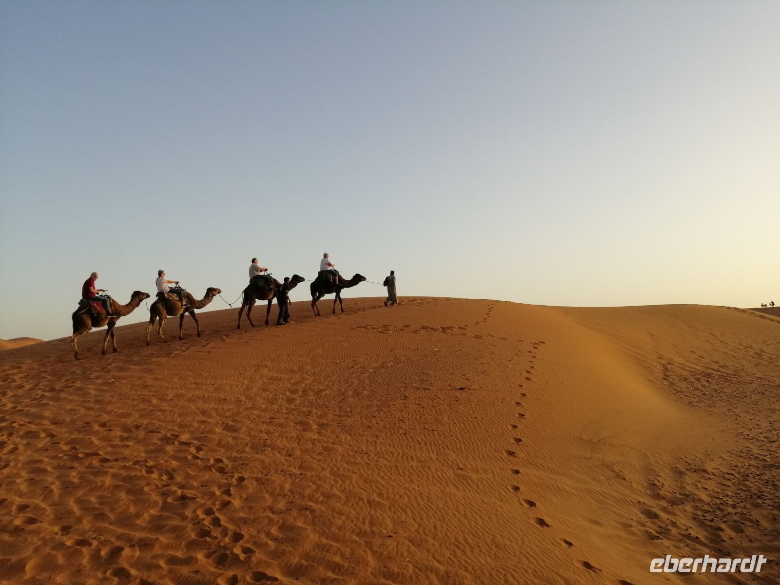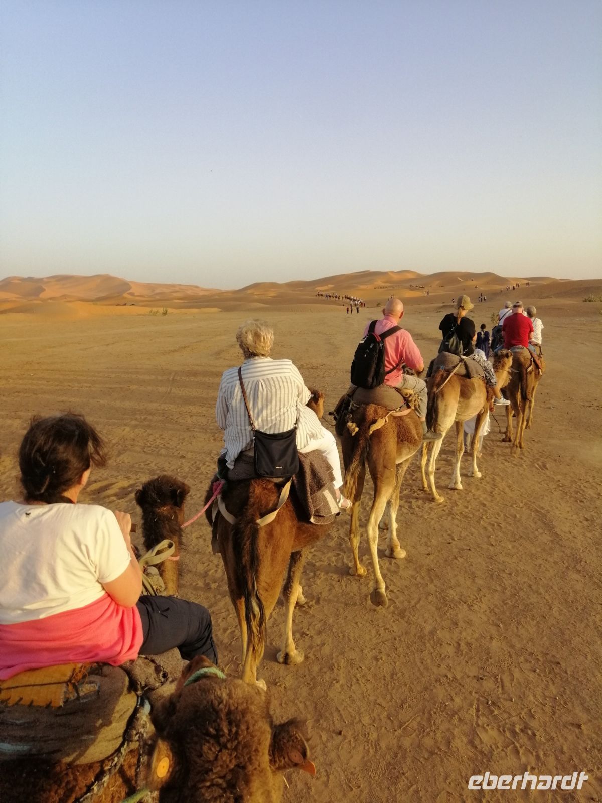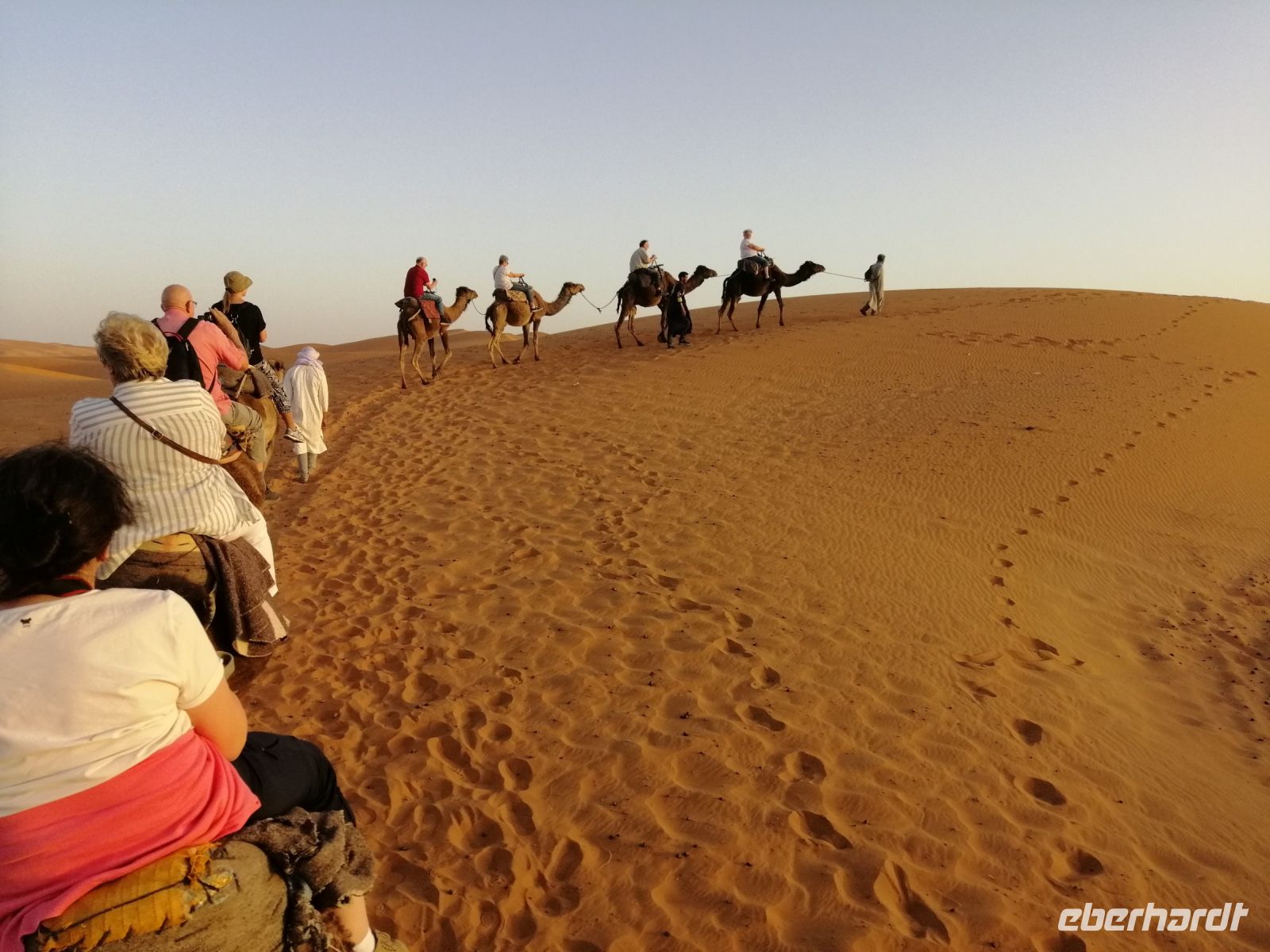 Den nächsten Fotostopp machten wir im Zedernwald, um die Magot-Affen (auch Berber-Affen genannt) zu beobachten. Während der weiteren Überquerung des Atlasgebirges mit steilen Felswänden und steilen Schluchten, beobachteten wir die Geologie Marokkos wie in einem Lehrbuch. Am Rande des Tales des Flußes Qued Ziz machten wir einen einfachen, aber leckeren Picknick mit typisch marokkanischen Gemüse, Brot, Wurst und Käse und setzten unsere Fahrt fort, bis wir am späten Nachmittag das Ziel des heutigen Tagen – Erfoud – erreichten. Nach dem Check-In in der wunderschönen Hotelanlage Xaluca, in der die Reisegäste mit Volksfolklore und typischen marokkanischen Minztee begrüßt wurden, ging es für unsere Reisegruppe schon weiter: wir unternahmen eine unvergessliche Fahrt mit Landrovern in die Wüste nach Erg Chebbi und bestiegen mit Dromedar`s die bis zu 100 Meter hohen Sanddünen. Der zauberhafte Sonnenuntergang in dieser märchenhaften Dünenlandschaft und der marokkanische Rotwein veredelten unseren heutigen Abend zusätzlich!