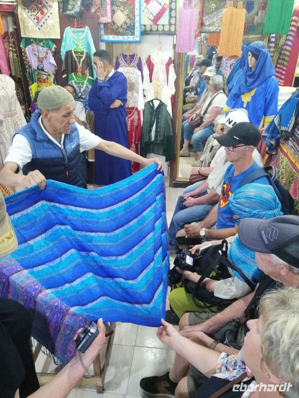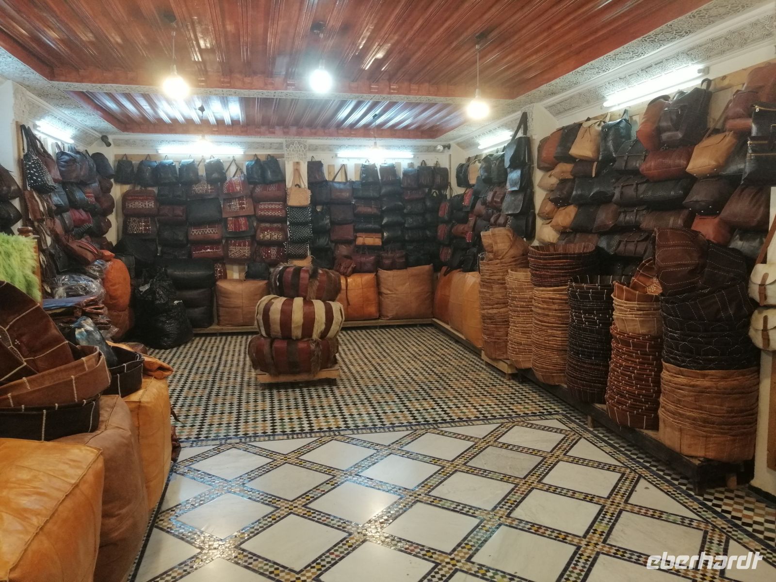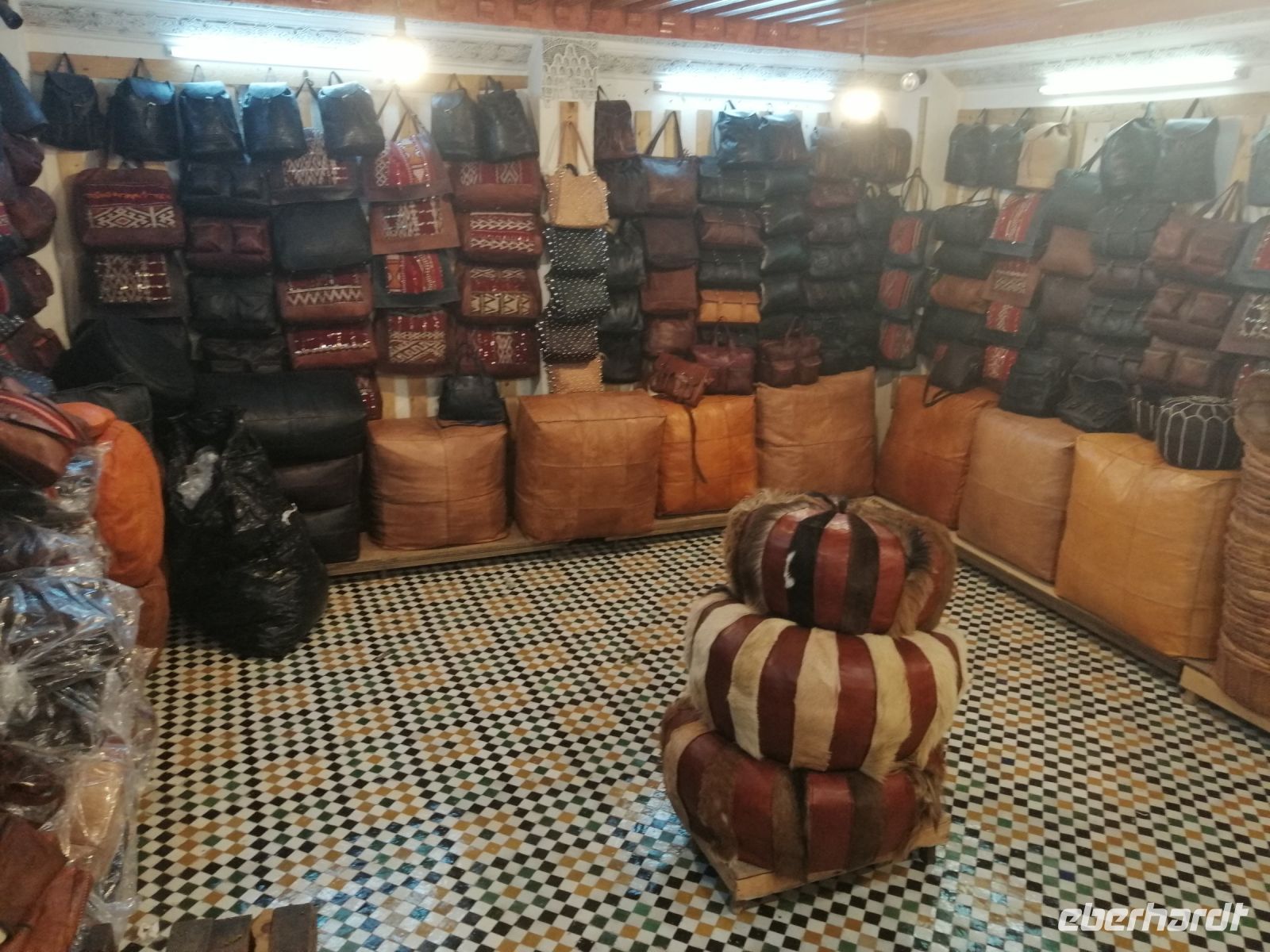 Nachmittag besichtigten wir noch ein Hamam und das Viertel der Schleifer, bevor wir die berühmte Gerberei von Fes auf Rue Chouara erreichten, die als eine Genossenschaft arbeitete. Im Rahmen einer kurzen Führung wurden wir über die Arbeitsabläufe der Leder-Gerbung in Antike, im Mittelalter und heute vertraut gemacht und schauten uns anschließend die hier hergestellten Produkte aus Rind-, Ziege- und Dromedarleder im Verkaufsraum an. Der anschließende Besuch in einer Agaven-Seiden-Werkstatt vermittelte uns einen guten Überblick über die Arbeitsweise und die Qualität der Handwerke. Die sehr intensive Stadtbesichtigung von Fes beendeten wir symbolisch mit einer Verabschiedung von der Stadt auf einer Aussichtsplattform, von der aus die ganze Stadt zu sehen war.