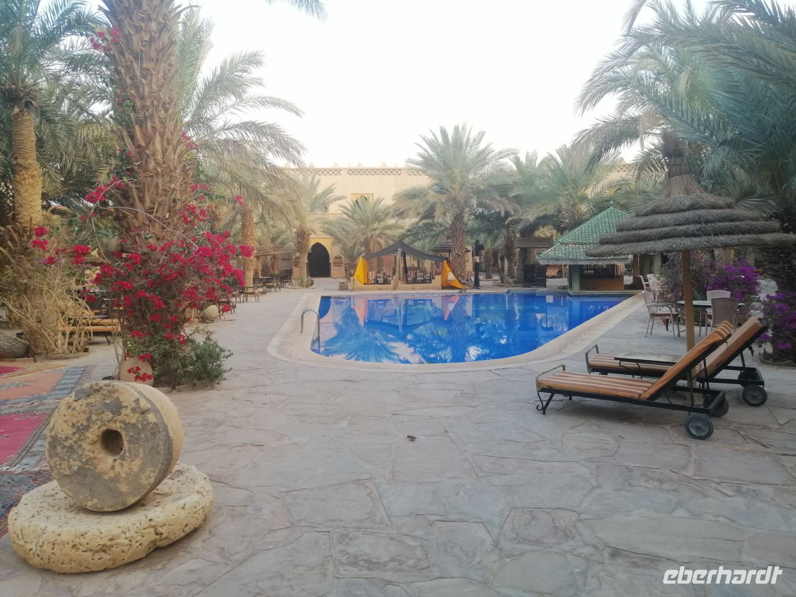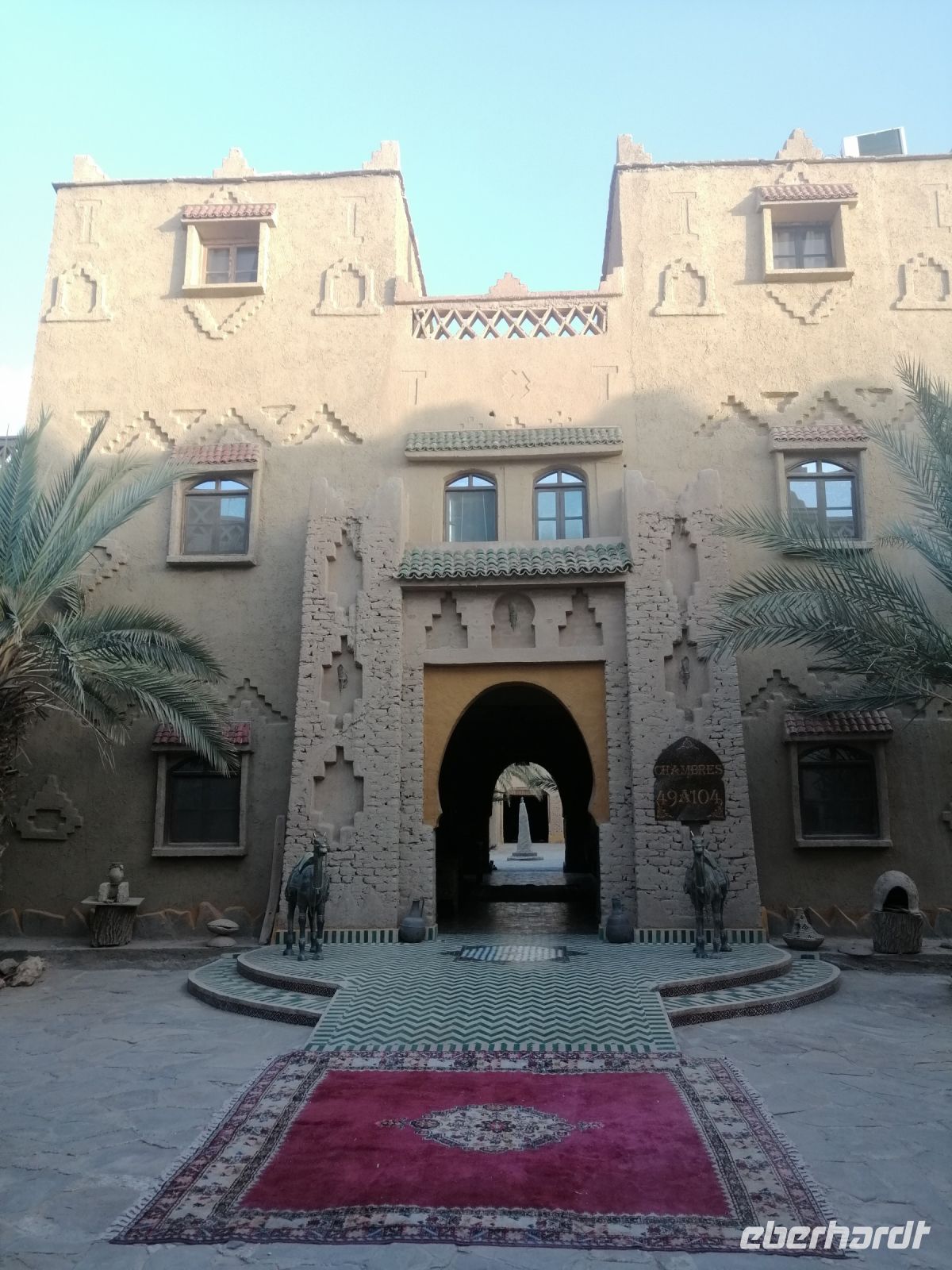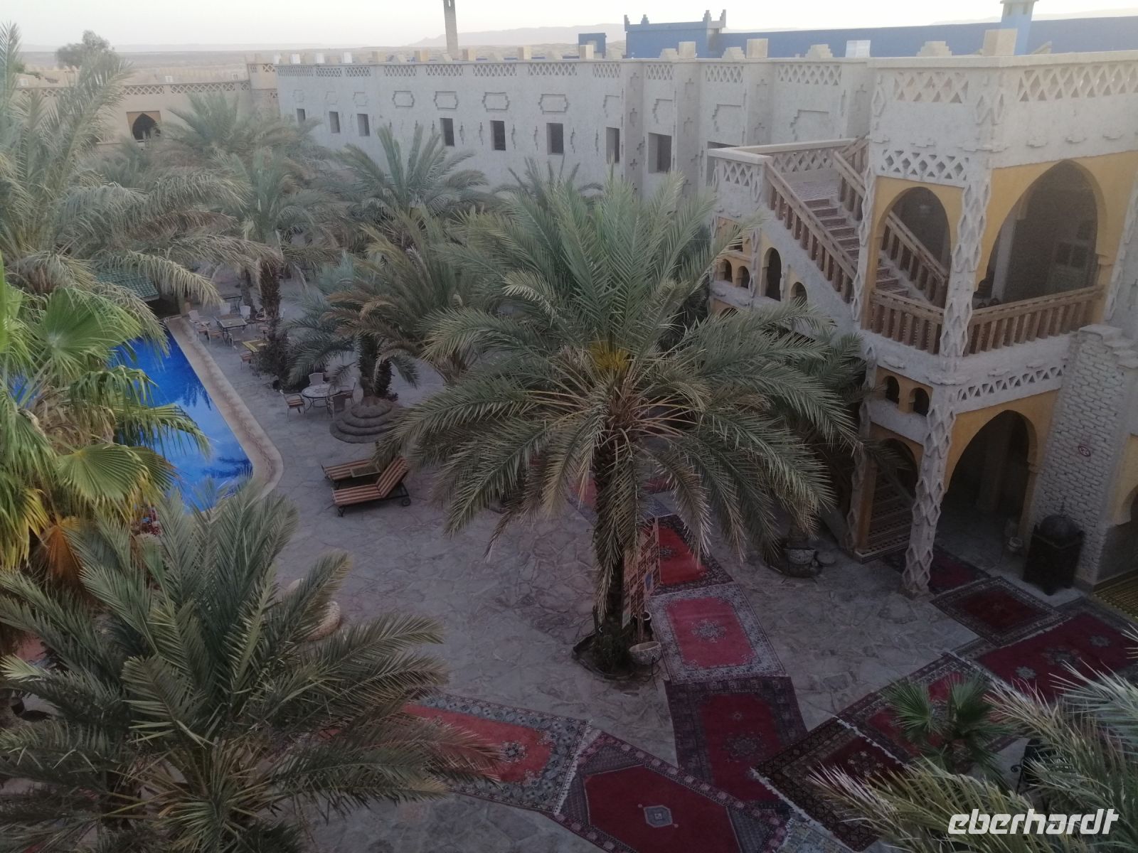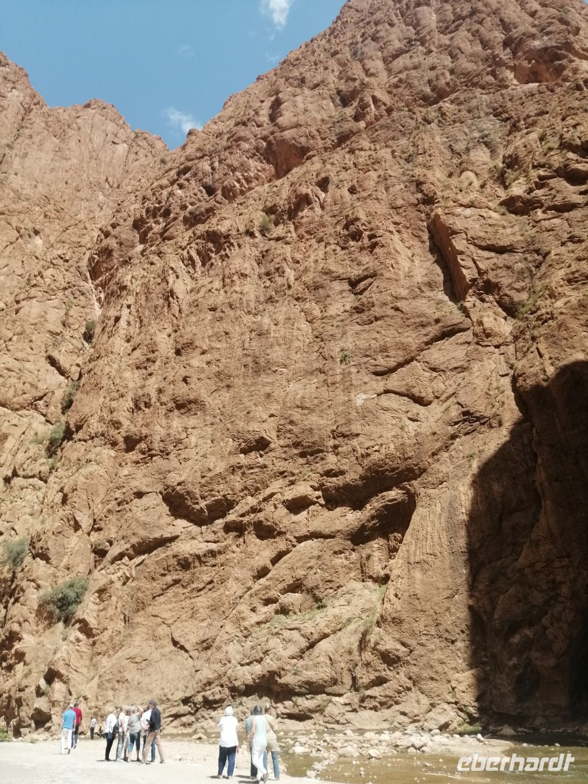 Unsere Tour ging dann, geologisch betrachtet, zwischen Europa und Afrika weiter, bis wir die sehr beeindruckende Todra-Schlucht erreichten. Während der Besichtigung der Schlucht, die als Ergebnis der Erosion durch den Fluß Todra, der aus dem Hohen Atlas kommt, entstanden ist, bewunderten wir die fast senkrechten Felswände der Schlucht, die teilweise eine Höhe von bis zu 300 Metern erreichten. Danach fuhren wir wieder nach Tinghir zurück und unternahmen dort einen kleinen Spaziergang direkt im Flußtal der Todra. Ein einheimischer Begleiter führte uns durch die Oase und zeigte die Ruinen einer alten Kasbah. Als weiterer Höhepunkt des Tages besichtigten wir eine Teppichwerkstatt in einer echten Berber-Familie, die uns sehr gastfreundlich, mit Tee und ausführlichen Erklärungen über das Teppich-Handwerk, empfangen hat. Anschließend fuhren wir die berühmte Straße der 1.000 Kasbah nach Boumalne-du-Dades zu unserem heutigen Hotel der wunderschönen Xaluca-Gruppe!