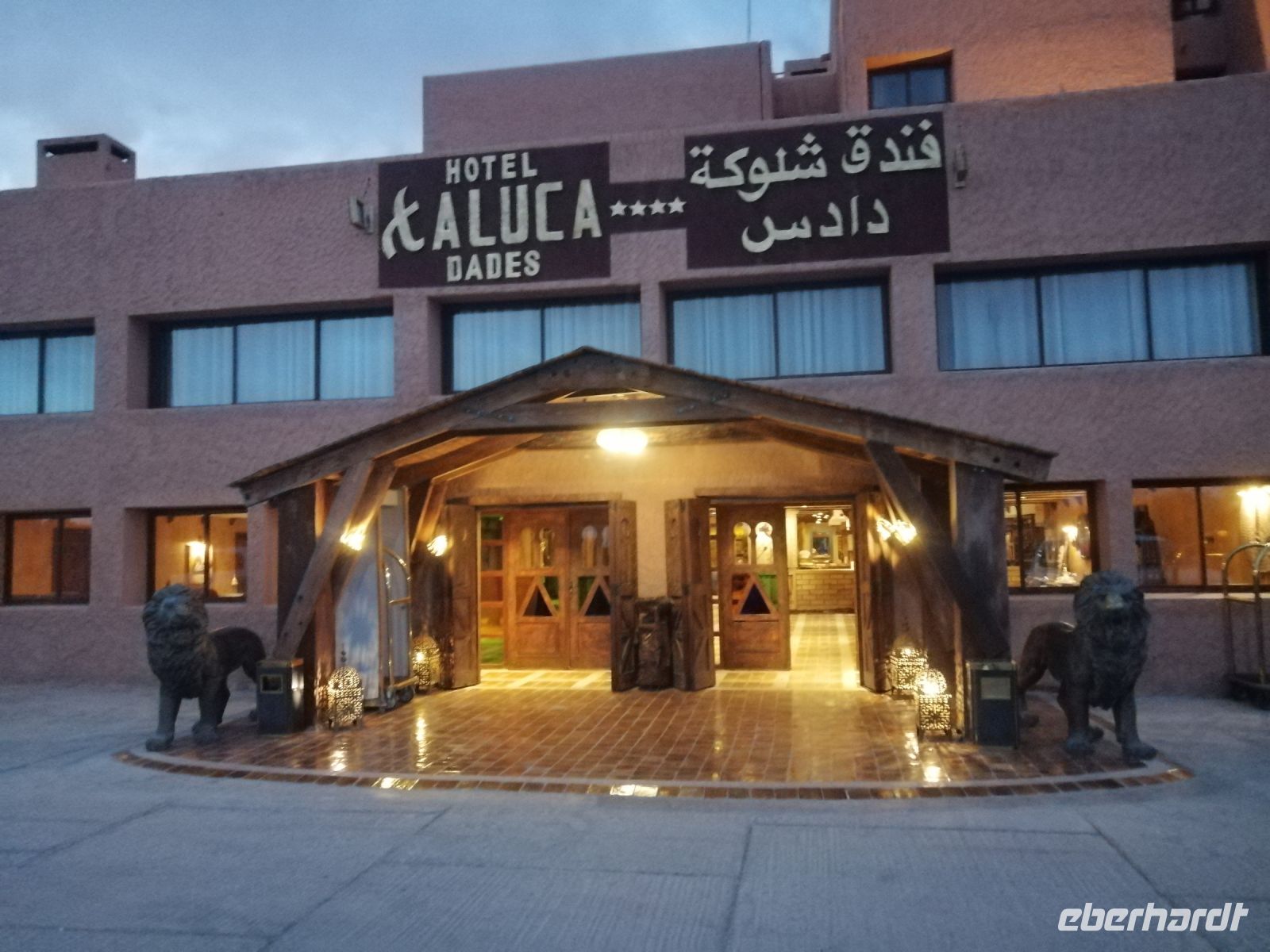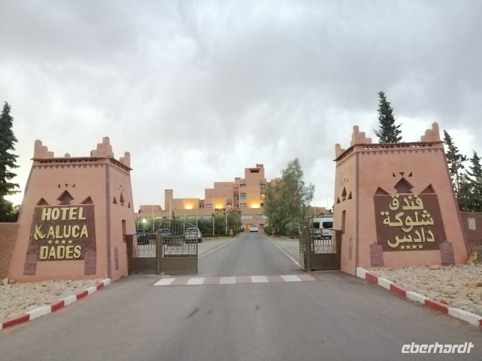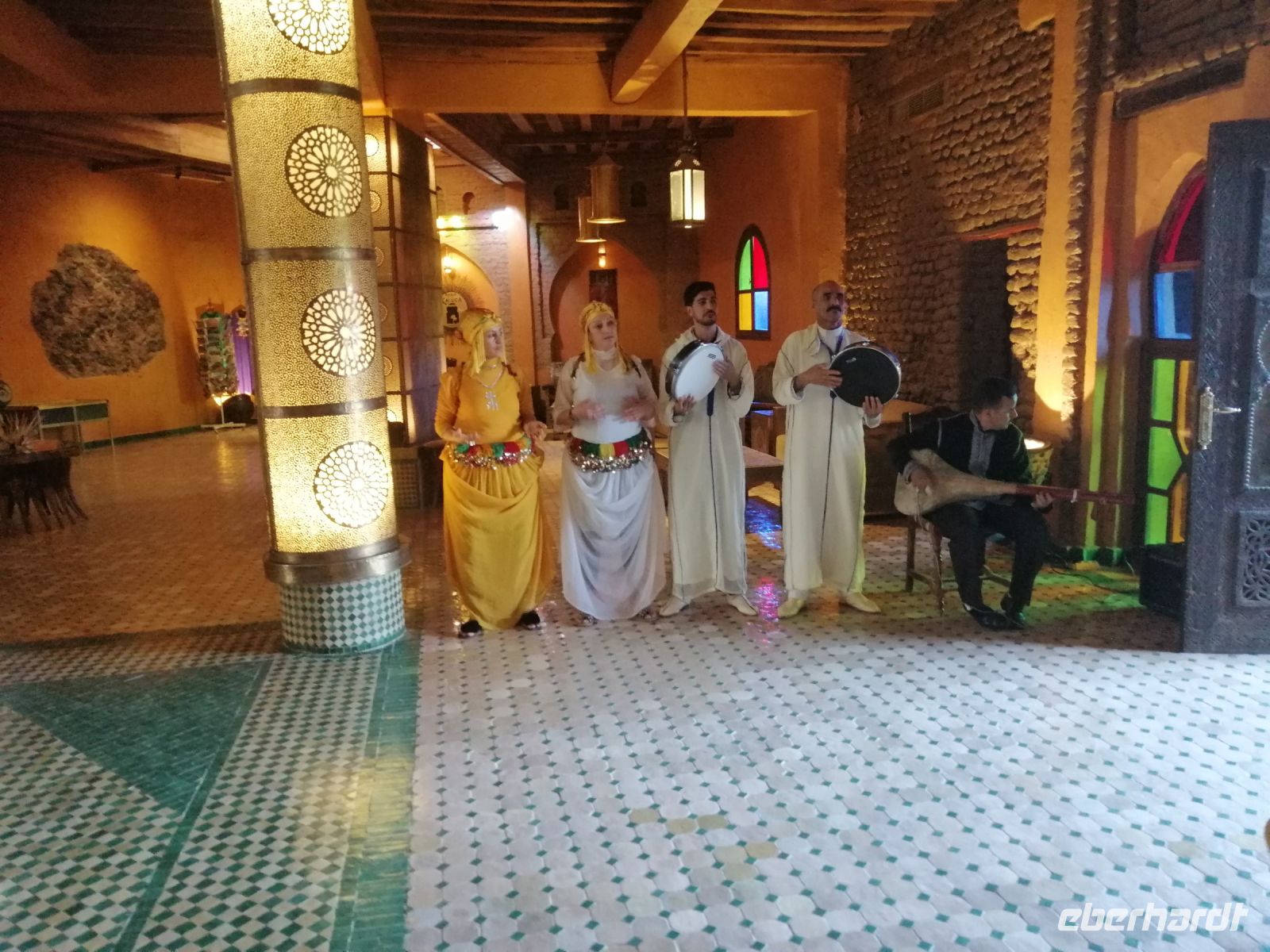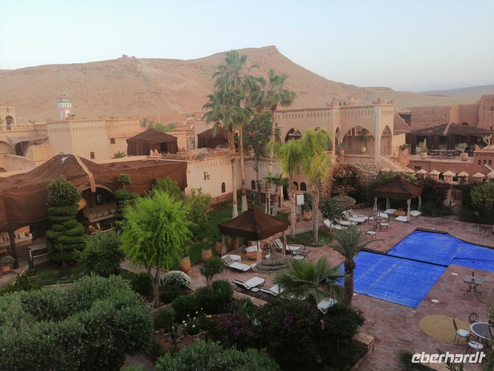 Nach der erfrischenden Kaffee-Pause, kehrten wir ins Tal zurück und setzten unsere Fahrt Richtung Filmstadt Quarzazate fort. Im Bus informierte uns Said über die arabische Sprache und über verschiedene Dialekte: nur die Berber sprechen mindestens 68 Dialekte, so Said – z.B. Tarifit, Tamazight usw. Außerdem erzählte uns Said über die Bedeutung der schwarzen Tracht in der dieser Region: wegen der Ermordung des Enkels von Propheten Mohammed. Kurz nach Mittag erreichten wir die Stadt Quarzazate – auch die Stadt der Stille genannt – und nach der kurzen Harmoniepause lud Said uns ein eine wunderschöne und gut restaurierte Kasbah De Tauorirt zu besichtigen. Am frühen Abend erreichten wir unser heutiges Hotel in Ait-Ben-Haddou mit einem fantastischen Blick auf die dortige Kasbah.