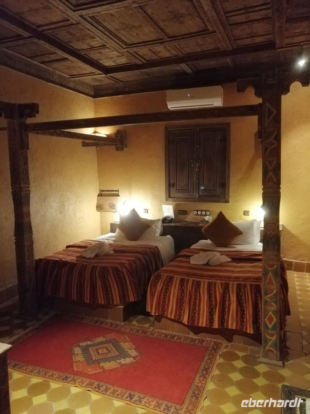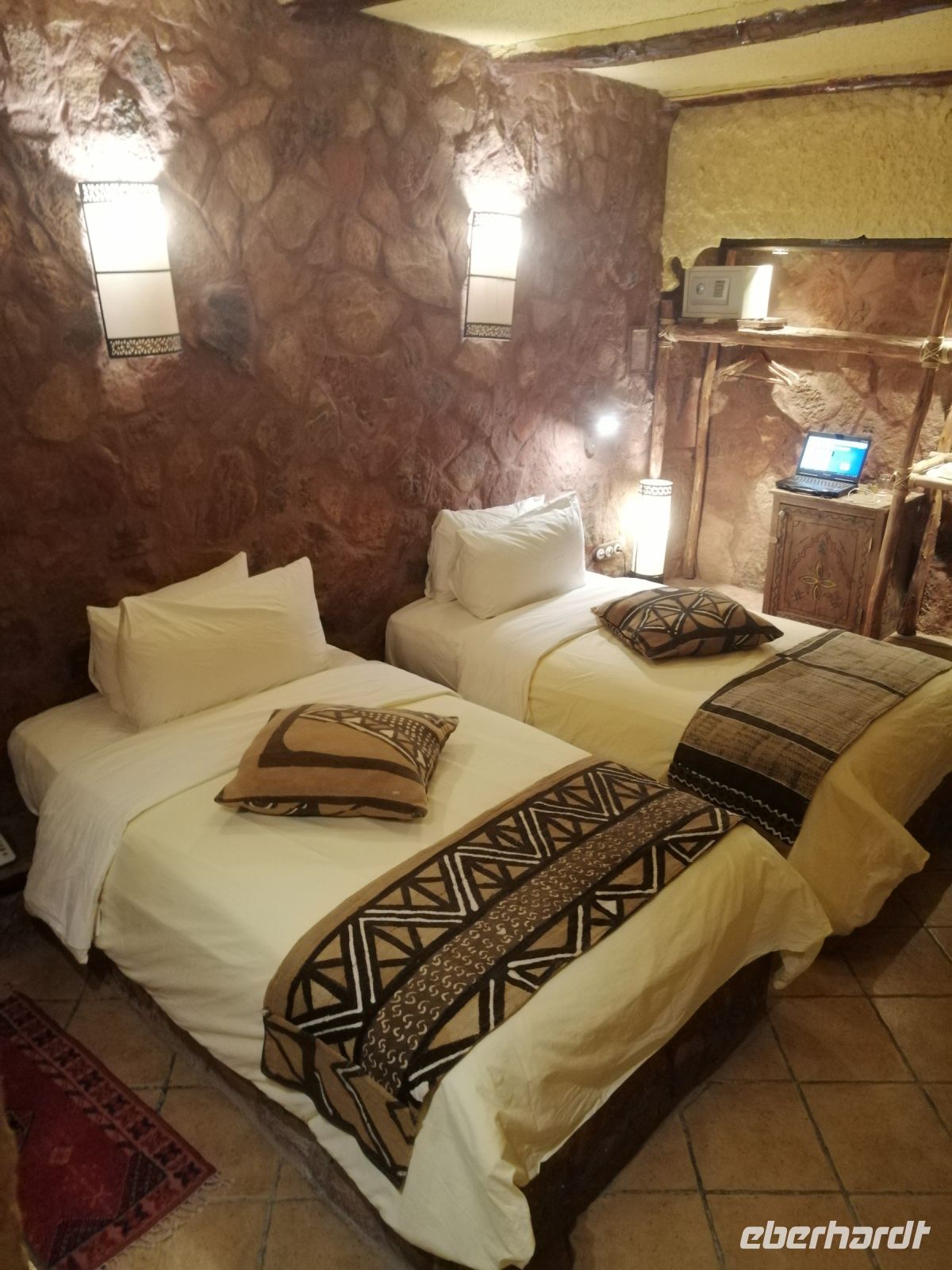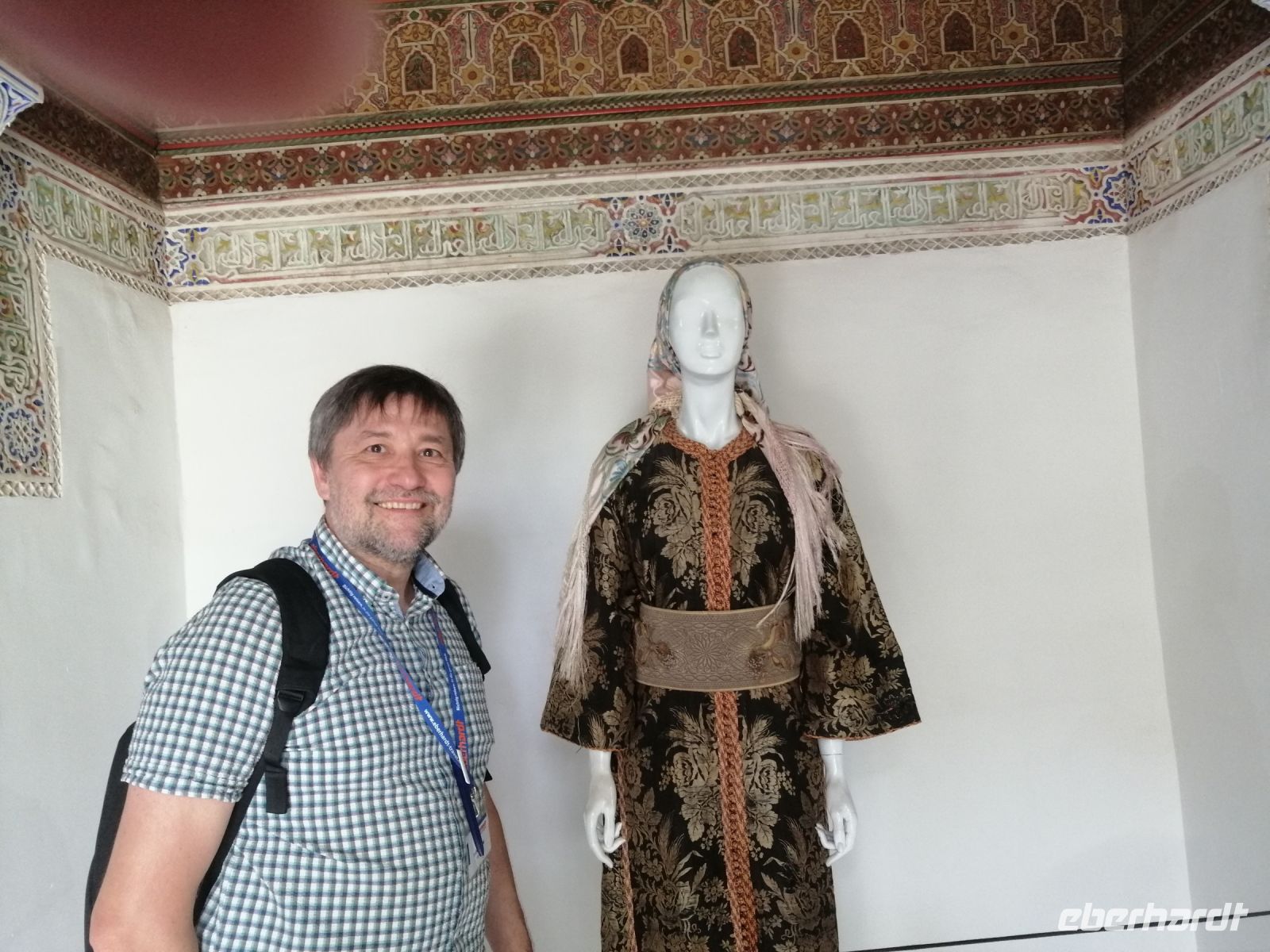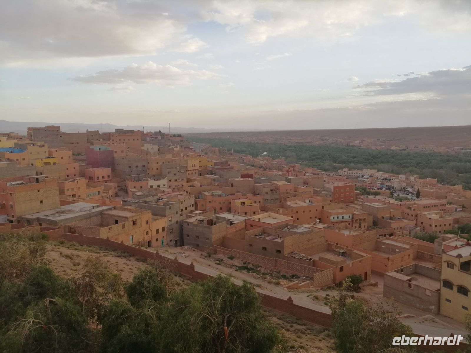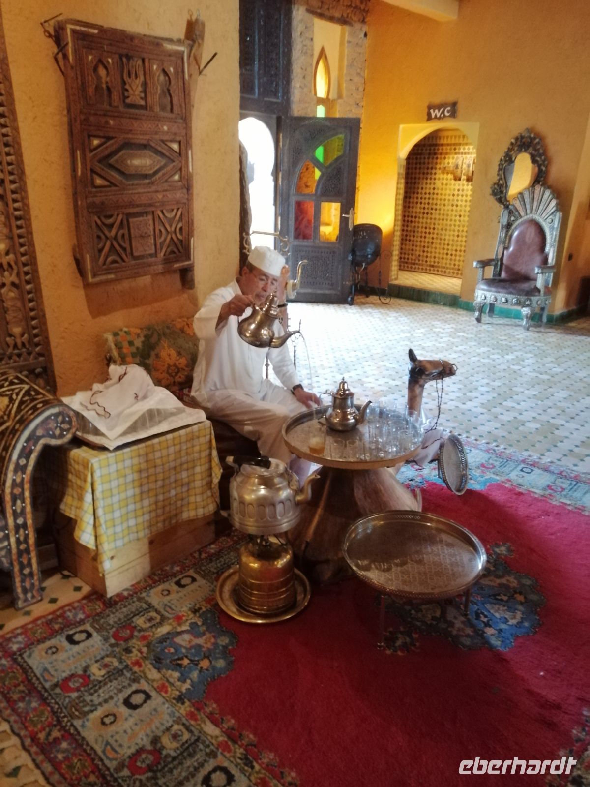 Nach der erfrischenden Kaffee-Pause, kehrten wir ins Tal zurück und setzten unsere Fahrt Richtung Filmstadt Quarzazate fort. Im Bus informierte uns Said über die arabische Sprache und über verschiedene Dialekte: nur die Berber sprechen mindestens 68 Dialekte, so Said – z.B. Tarifit, Tamazight usw. Außerdem erzählte uns Said über die Bedeutung der schwarzen Tracht in der dieser Region: wegen der Ermordung des Enkels von Propheten Mohammed. Kurz nach Mittag erreichten wir die Stadt Quarzazate – auch die Stadt der Stille genannt – und nach der kurzen Harmoniepause lud Said uns ein eine wunderschöne und gut restaurierte Kasbah De Tauorirt zu besichtigen. Am frühen Abend erreichten wir unser heutiges Hotel in Ait-Ben-Haddou mit einem fantastischen Blick auf die dortige Kasbah.