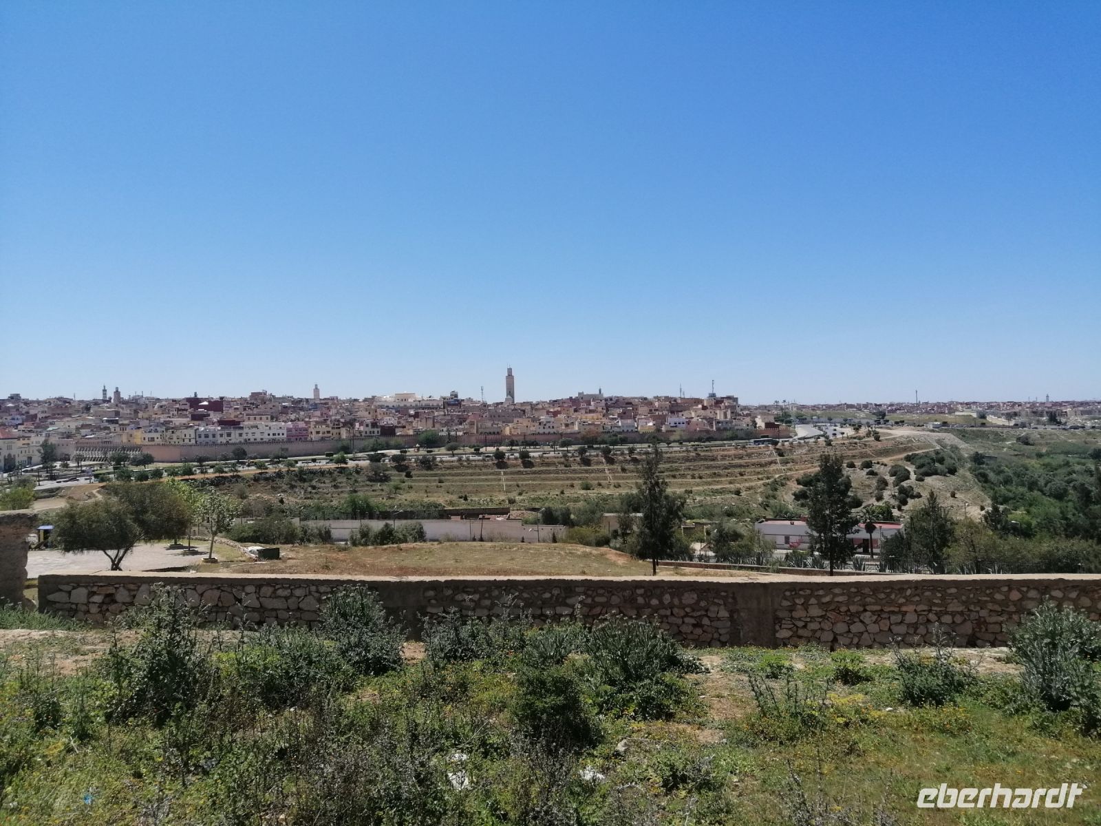 Heute startete unsere Karawane von Rabat Richtung Meknes! Wir fuhren aus Rabat entlang der Avocado-Plantagen (die laut Said sehr viel Wasser verbrauchen: für 1 kg Avocado werden ca. 800 l Wasser benötigt), vorbei an der bewachten privaten Königsresidenz, an der königlichen Pferderennbahn und an der sehr modernen Fußball-Akademie. Im Bus informierte uns Said über den staatlichen Marmora-Wald – Kork-Eichen-Wald – der über 300 ha groß ist. Dieses Material wird nicht nur als Baumaterial, sondern auch im Weinanbau und in der Schuhproduktion verwendet.