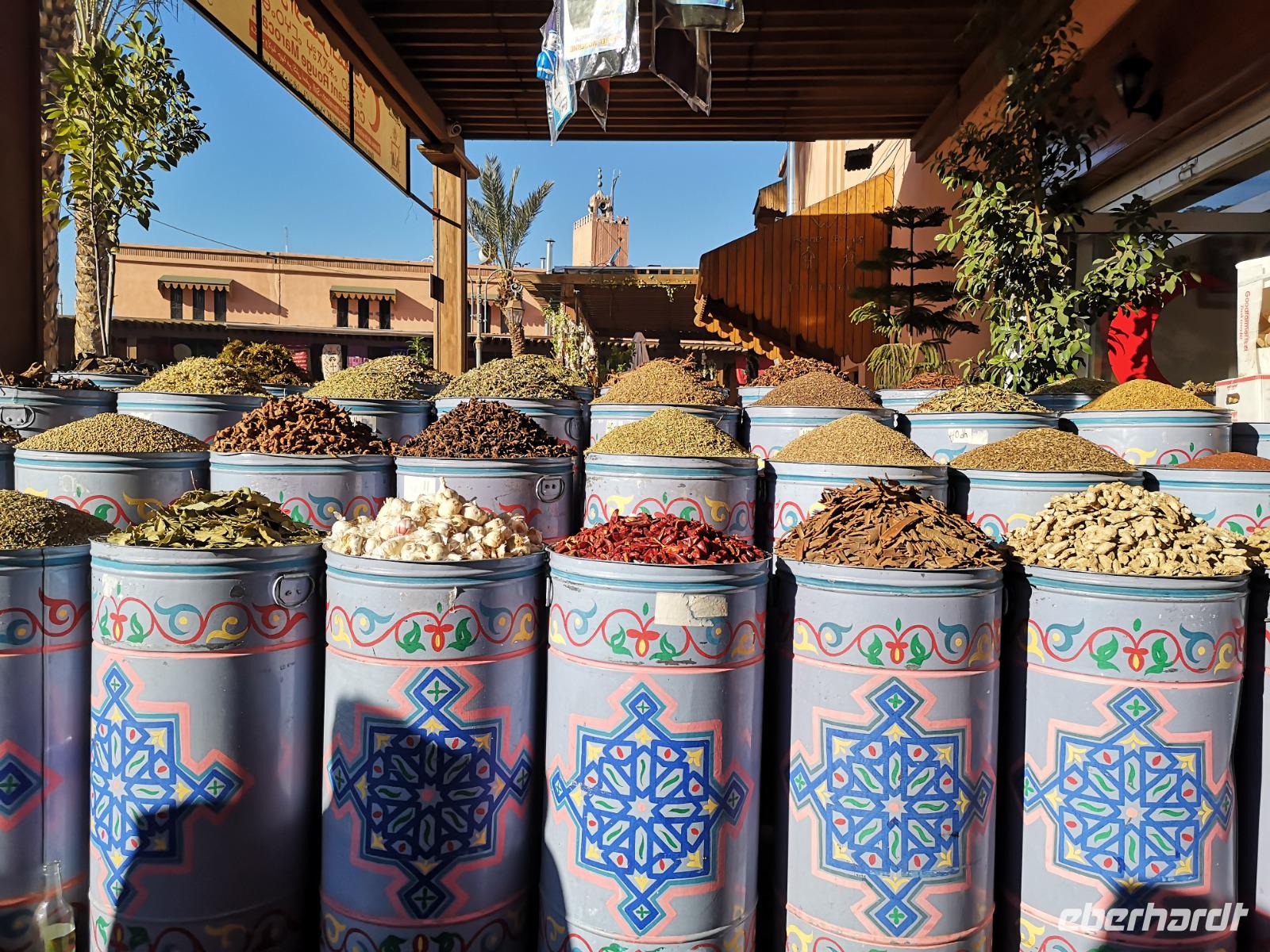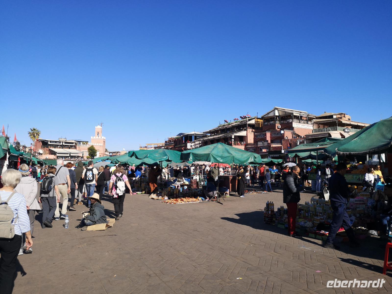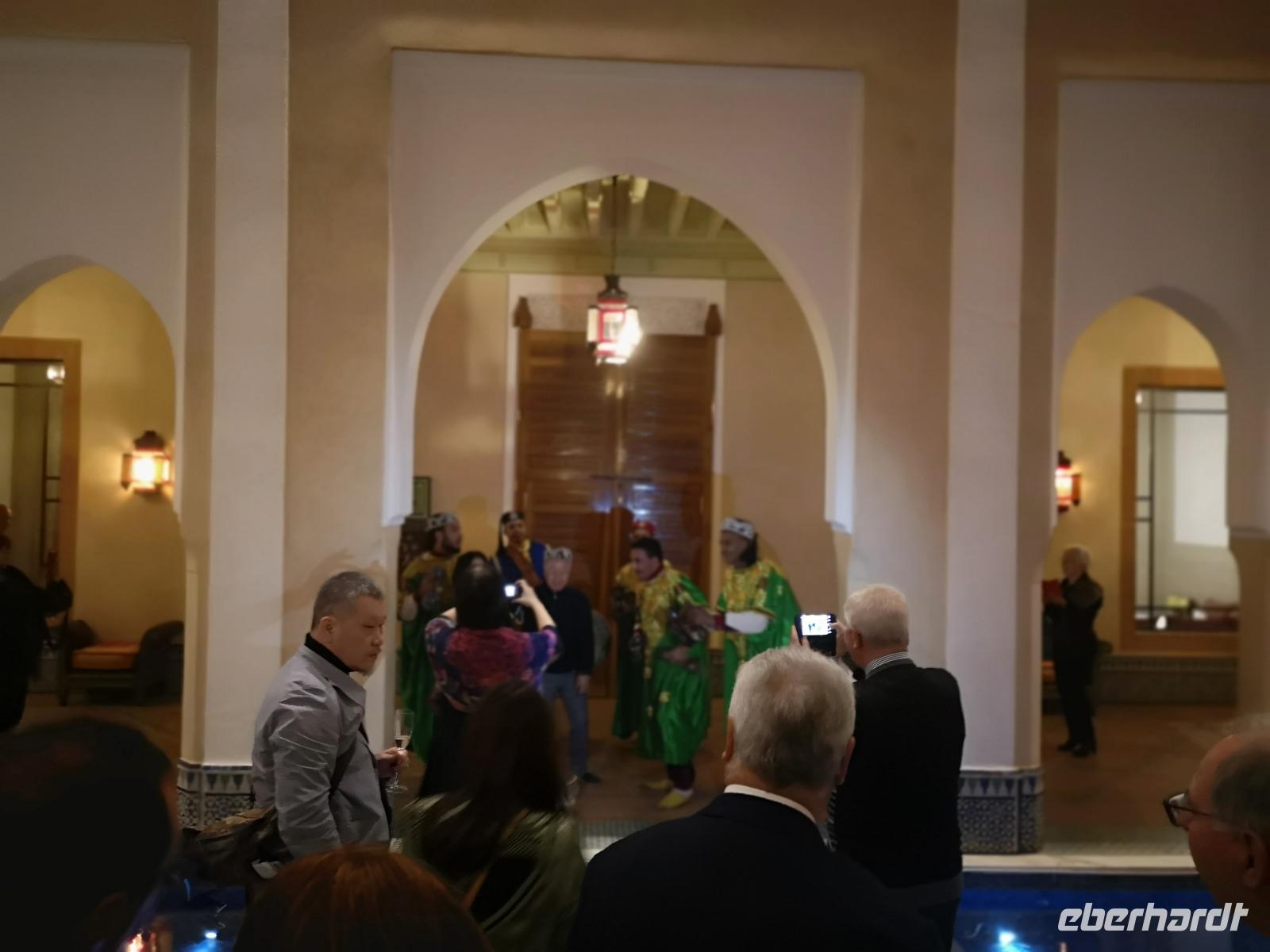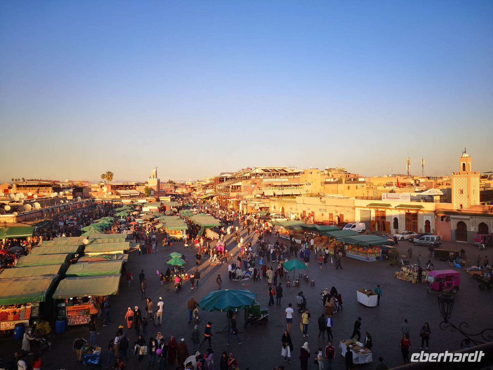 Nach dem Mittag wagen wir uns ins Getümmel auf dem Platz der Gaukler, überall sehen wir die Schlangenbeschwörer und Artisten mit ihren Kunststückchen. Unser Weg führt uns weiter in den Souk von Marrakesch, wir sind mittendrin, zwischen den Einheimischen auf Entdeckungstour. Ein Besuch bei einer Berberapotheke darf natürlich nicht fehlen. Auch die kleinen Werkstätten und Läden lassen den einen oder anderen von uns schwach werden. Zum Abschluss beobachten wir dann das ganze verrückte Treiben mit einem Glas Pfefferminztee von der Terrasse eines Cafés aus. Schließlich fahren wir zurück ins Hotel und lassen beim Abendessen und dem abendlichen Besuch in Bar ausklingen.