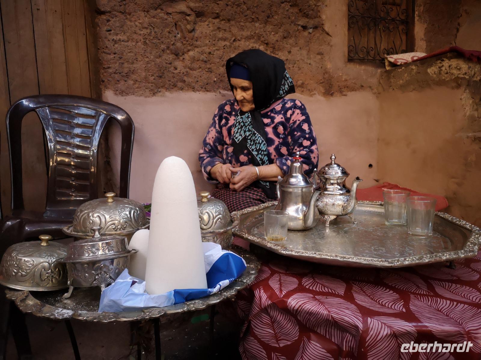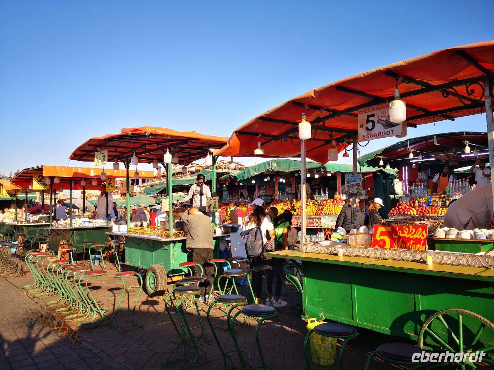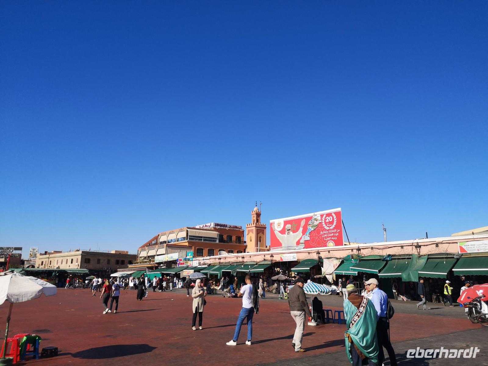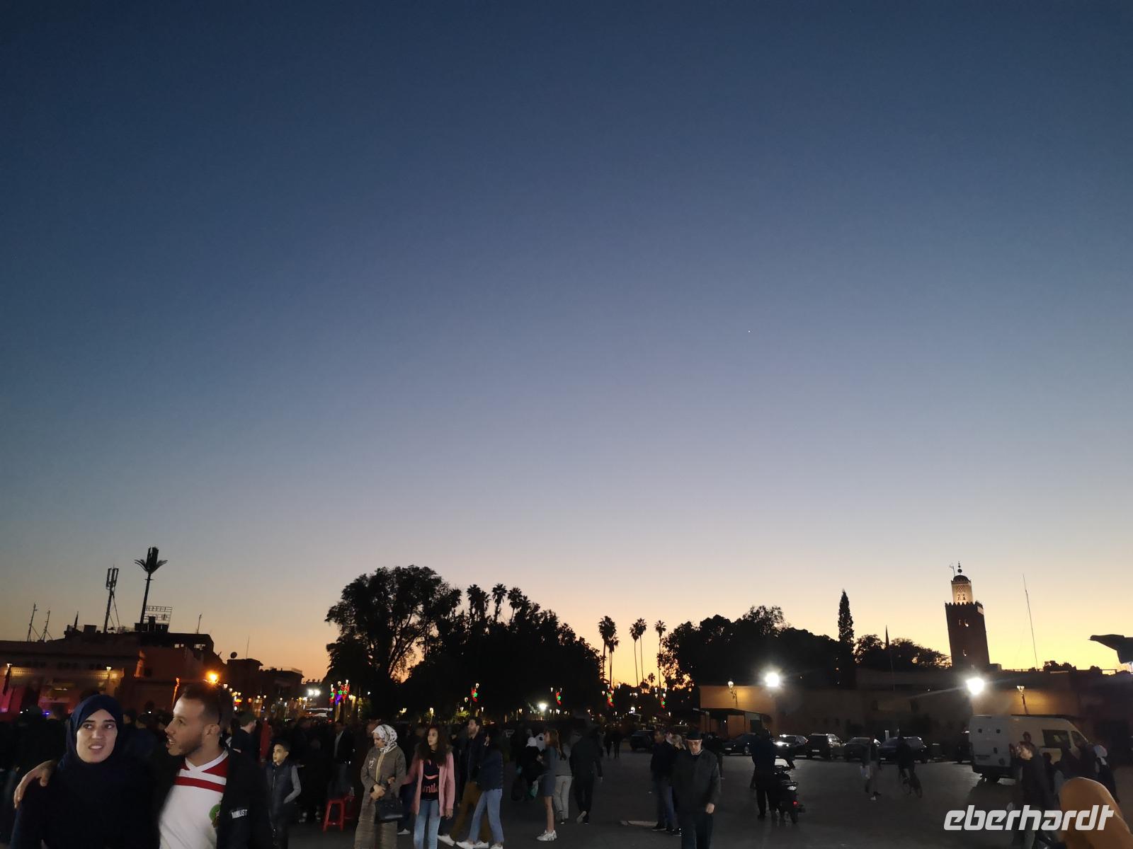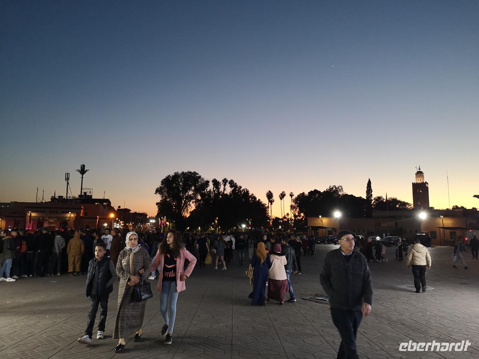Nach dem Mittag wagen wir uns ins Getümmel auf dem Platz der Gaukler, überall sehen wir die Schlangenbeschwörer und Artisten mit ihren Kunststückchen. Unser Weg führt uns weiter in den Souk von Marrakesch, wir sind mittendrin, zwischen den Einheimischen auf Entdeckungstour. Ein Besuch bei einer Berberapotheke darf natürlich nicht fehlen. Auch die kleinen Werkstätten und Läden lassen den einen oder anderen von uns schwach werden. Zum Abschluss beobachten wir dann das ganze verrückte Treiben mit einem Glas Pfefferminztee von der Terrasse eines Cafés aus. Schließlich fahren wir zurück ins Hotel und lassen beim Abendessen und dem abendlichen Besuch in Bar ausklingen.