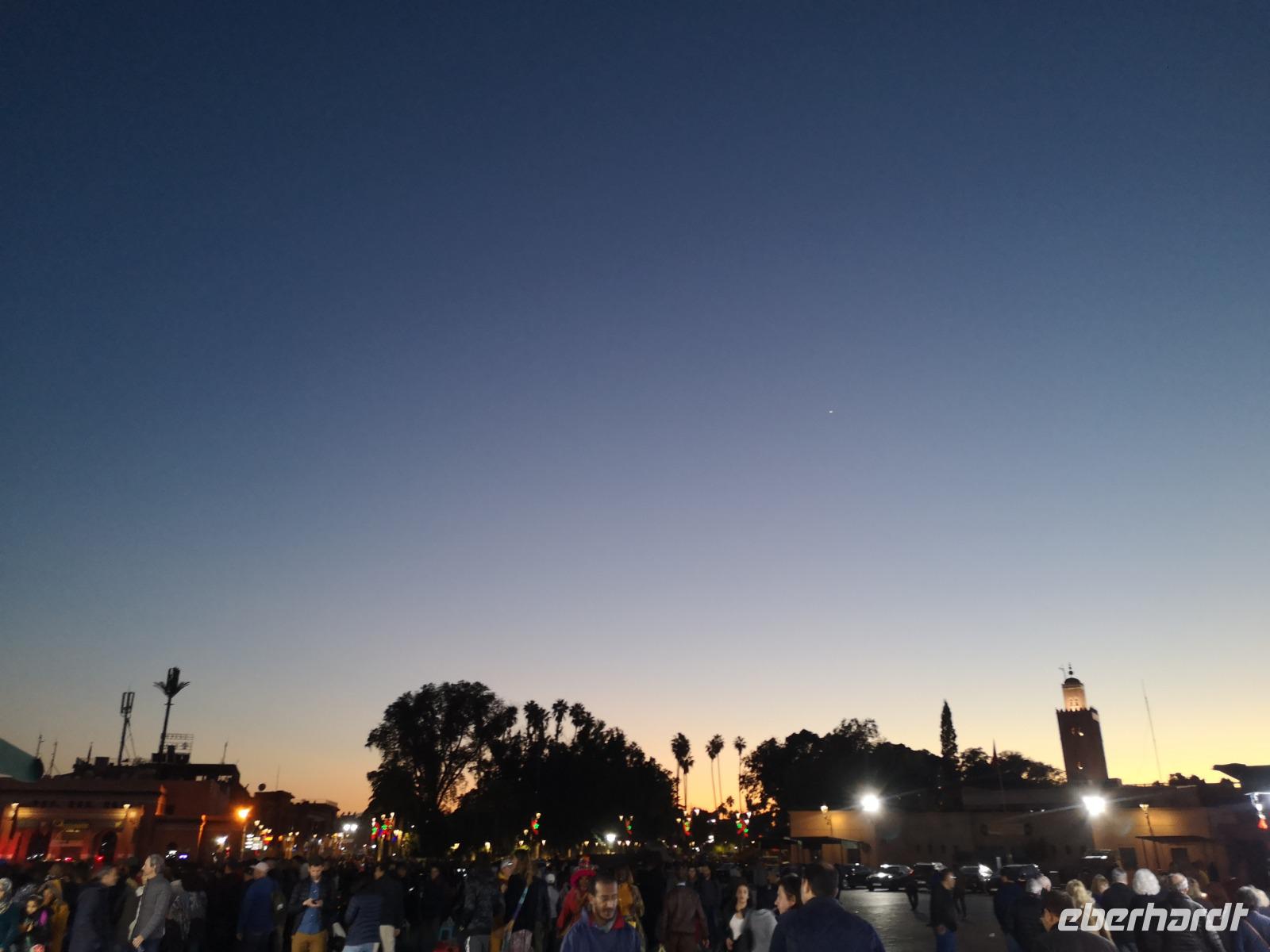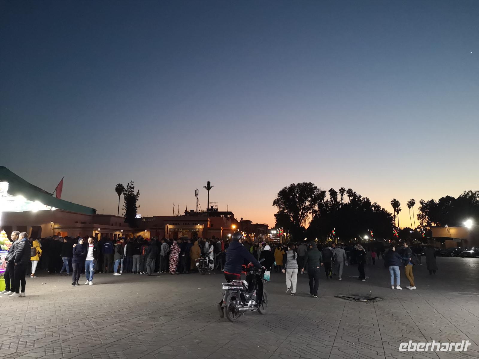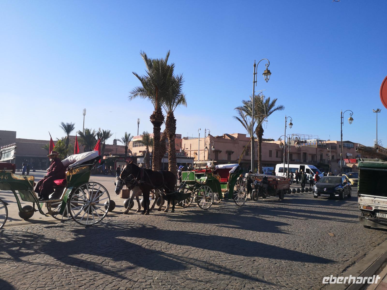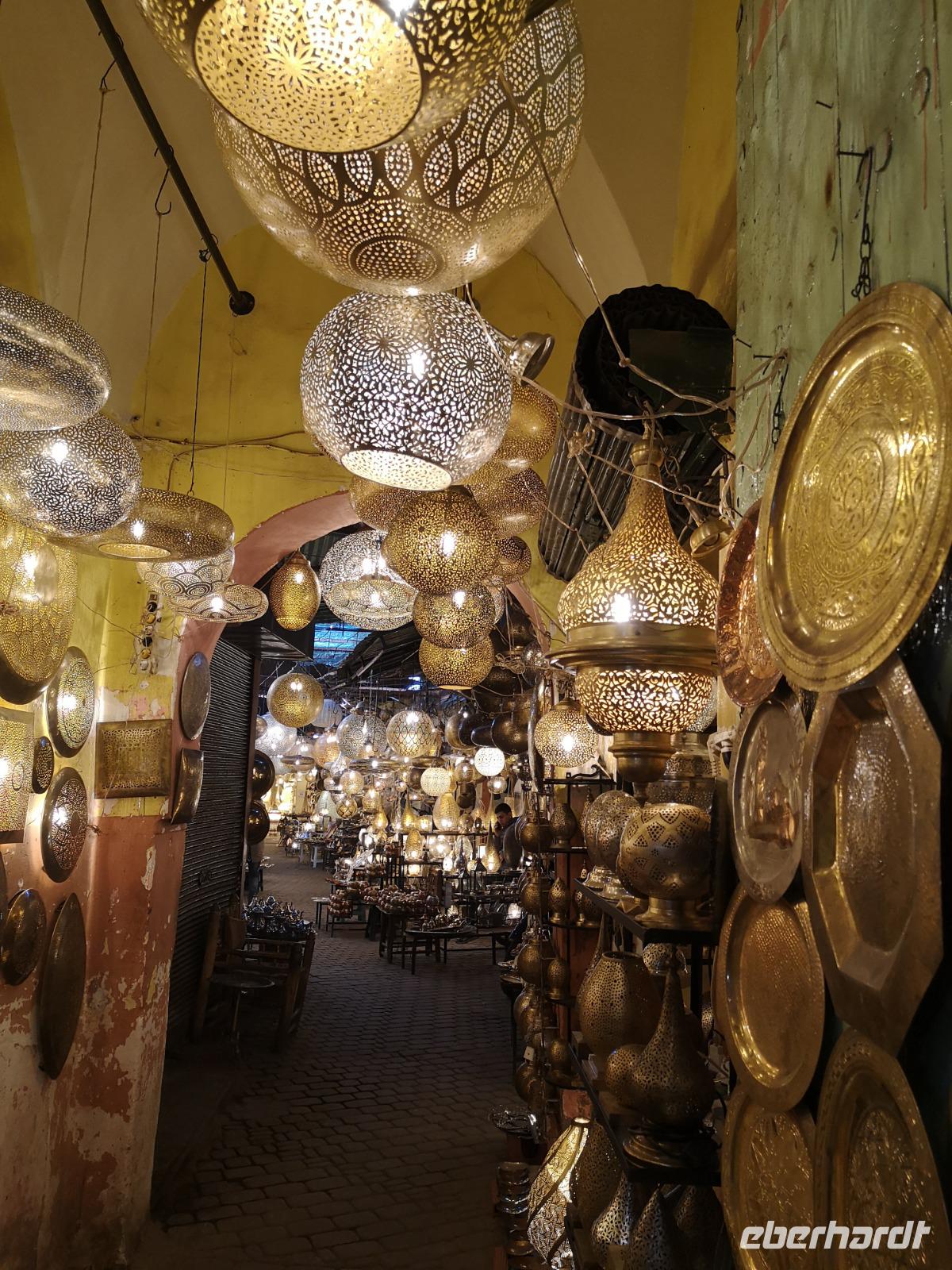 Nach dem Mittag wagen wir uns ins Getümmel auf dem Platz der Gaukler, überall sehen wir die Schlangenbeschwörer und Artisten mit ihren Kunststückchen. Unser Weg führt uns weiter in den Souk von Marrakesch, wir sind mittendrin, zwischen den Einheimischen auf Entdeckungstour. Ein Besuch bei einer Berberapotheke darf natürlich nicht fehlen. Auch die kleinen Werkstätten und Läden lassen den einen oder anderen von uns schwach werden. Zum Abschluss beobachten wir dann das ganze verrückte Treiben mit einem Glas Pfefferminztee von der Terrasse eines Cafés aus. Schließlich fahren wir zurück ins Hotel und lassen beim Abendessen und dem abendlichen Besuch in Bar ausklingen.
