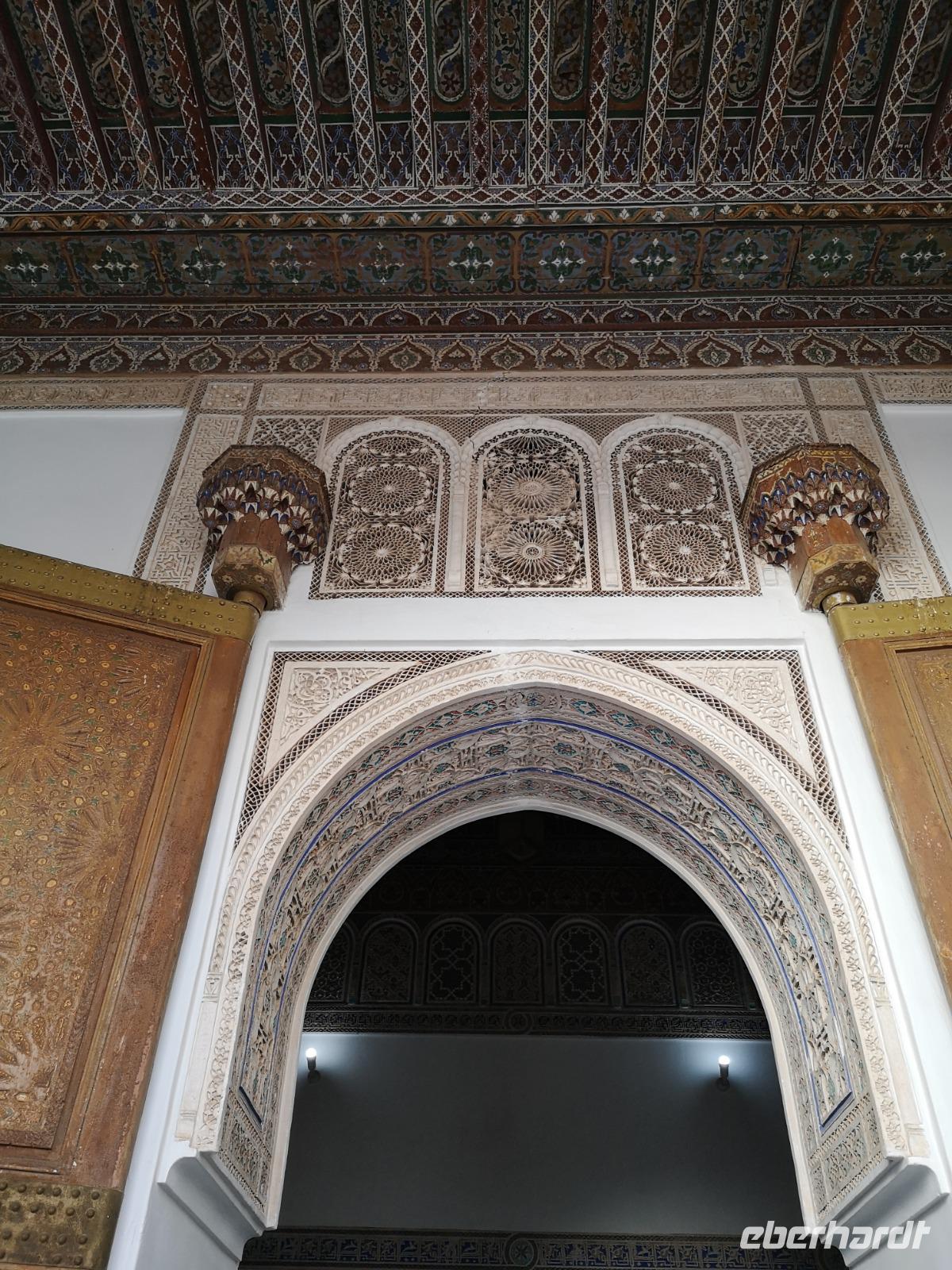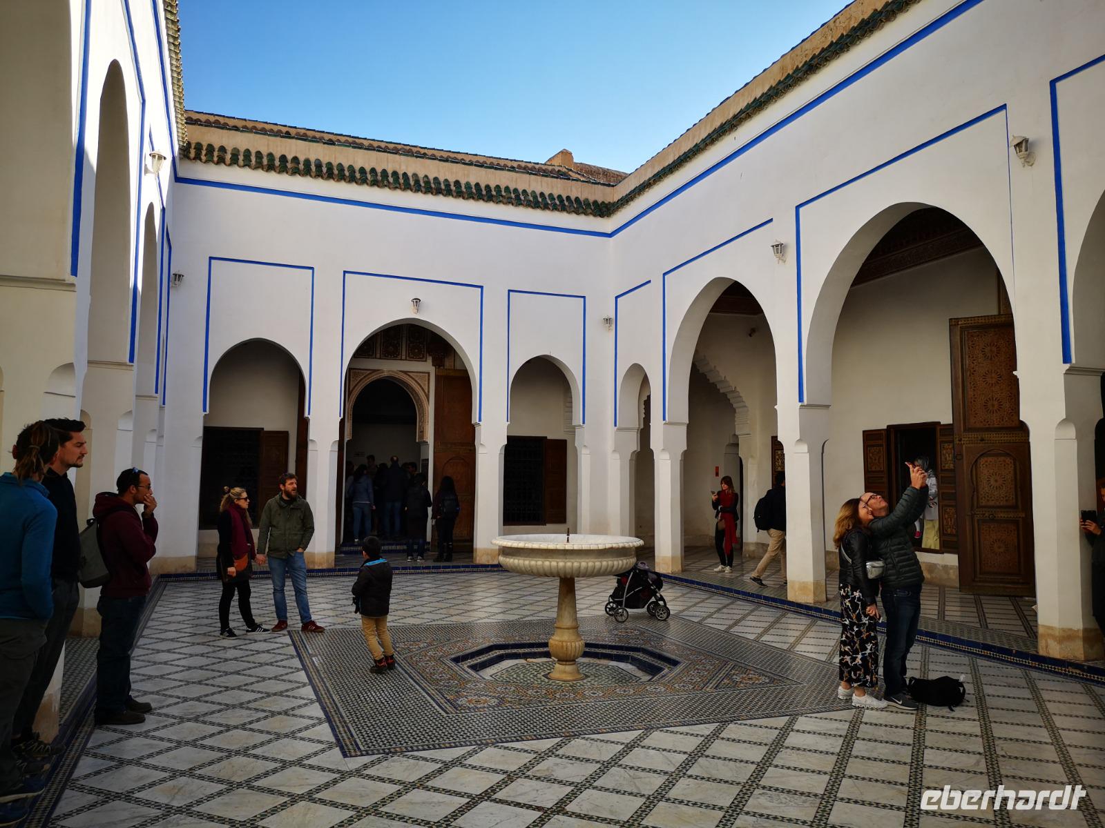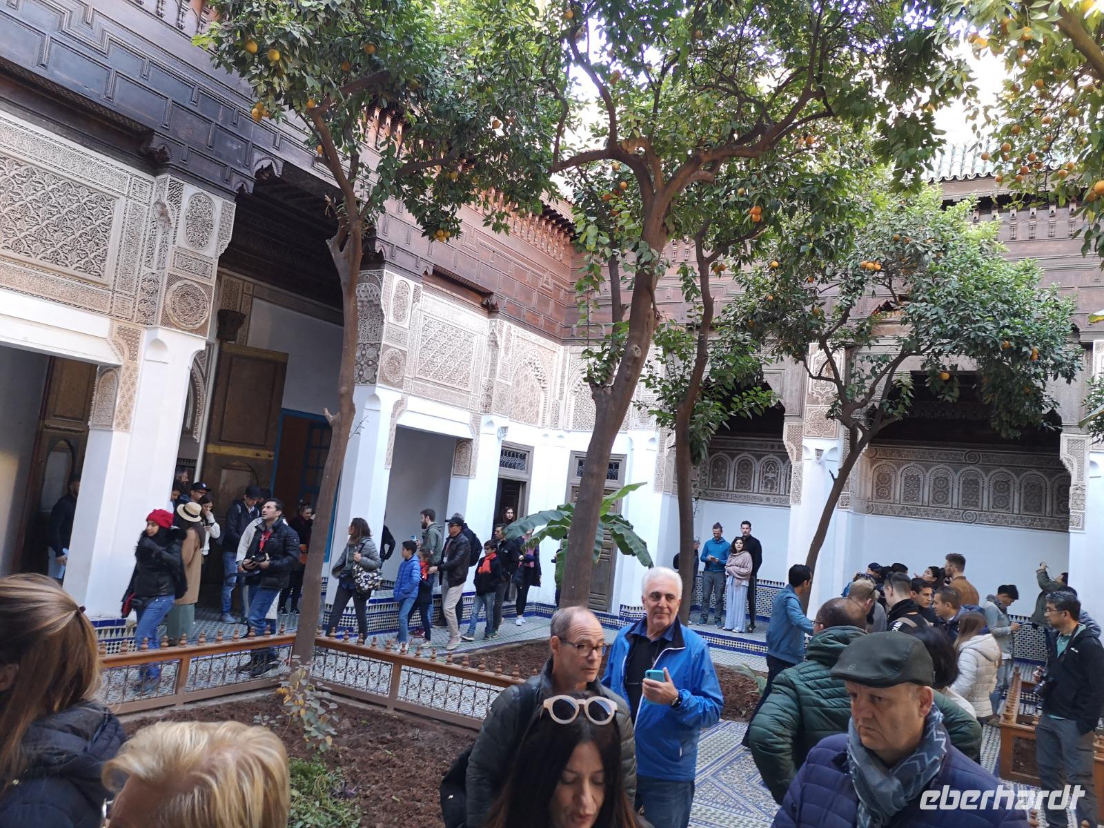 Nach dem Frühstück beginnt unsere Stadtrundfahrt. Mohammed und Abdul bringen uns zu erste zum großen Tor, dem Bab Agnaou. Weiter geht's zu den Saadier Gräbern, einer prächtigen Grabanlage inmitten der verwinkelten Straßen Marrakeschs. Wir fahren weiter um den berühmten Palast „Palais de la Bahia" zu besichtigen. Der Grosswesir eines Sultans hatte ihn sich im späten 19.Jahrhundert erbauen lassen. Er holte sich die besten Handwerker aus Fes und schuf damit ein wunderbares Beispiel marokkanischer Palastarchitektur mit Zedernholzdecken, Zeller-Keramik- und Stuckarbeiten. Die kleinen Gärtchen mit Springbrunnen und heimischen Pflanzen, wie Pomeranzen- und Granatapfelbäumen, sollen das Paradies symbolisieren. Hier wohnte der Wesir mit seiner Lieblingsfrau "Bahia" und seinem restlichen Harem. Weiter geht es zu einem weiteren interessanten "Riad" in dem heute ein Teppichmuseum untergebracht ist - das Dar Si Said Museum. Neben den Teppichen gibt auch dieses Haus einen guten Einblick in die Wohnkultur der wohlhabenden Marokkaner vergangener Zeiten.