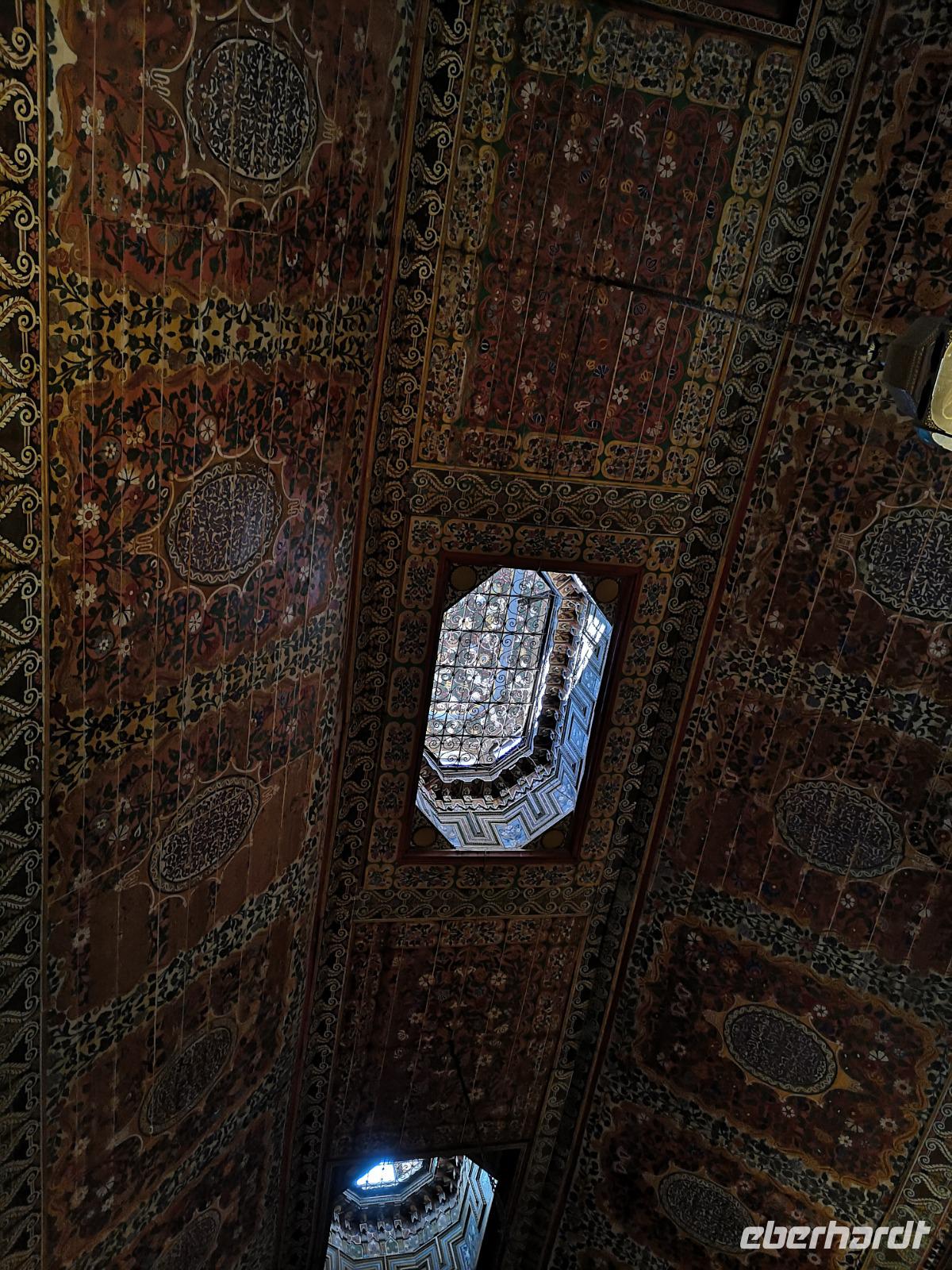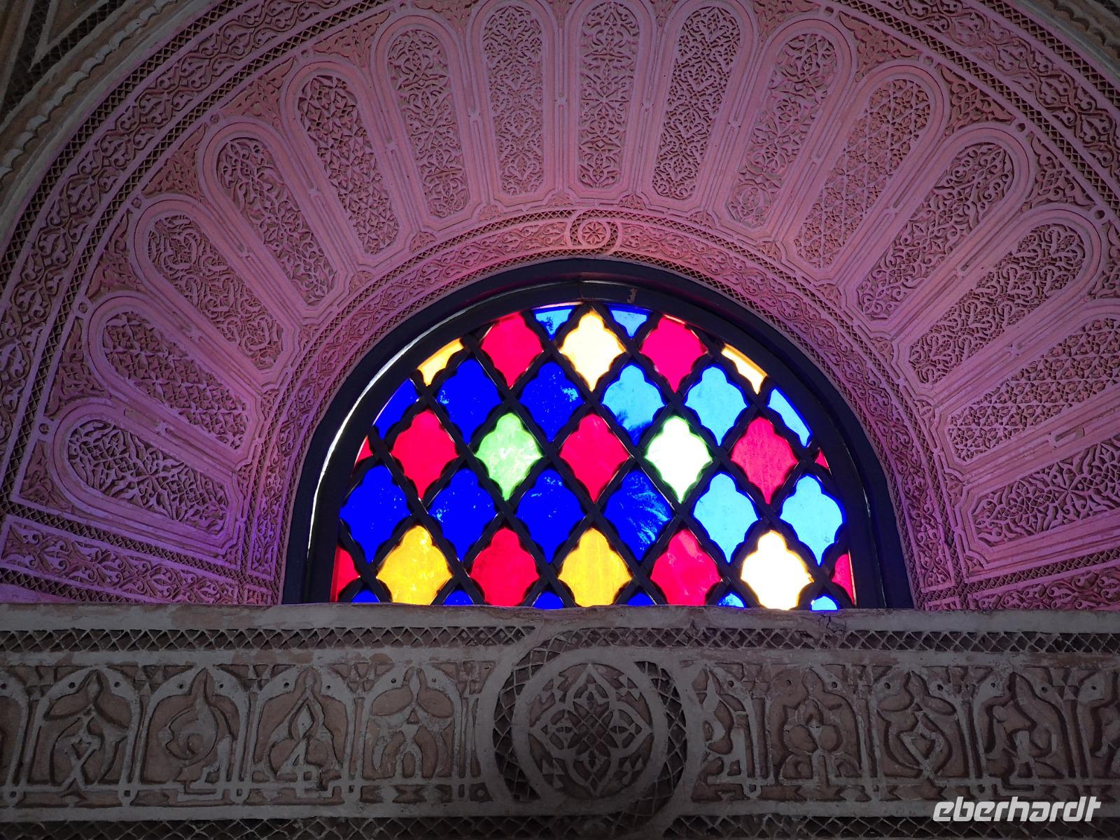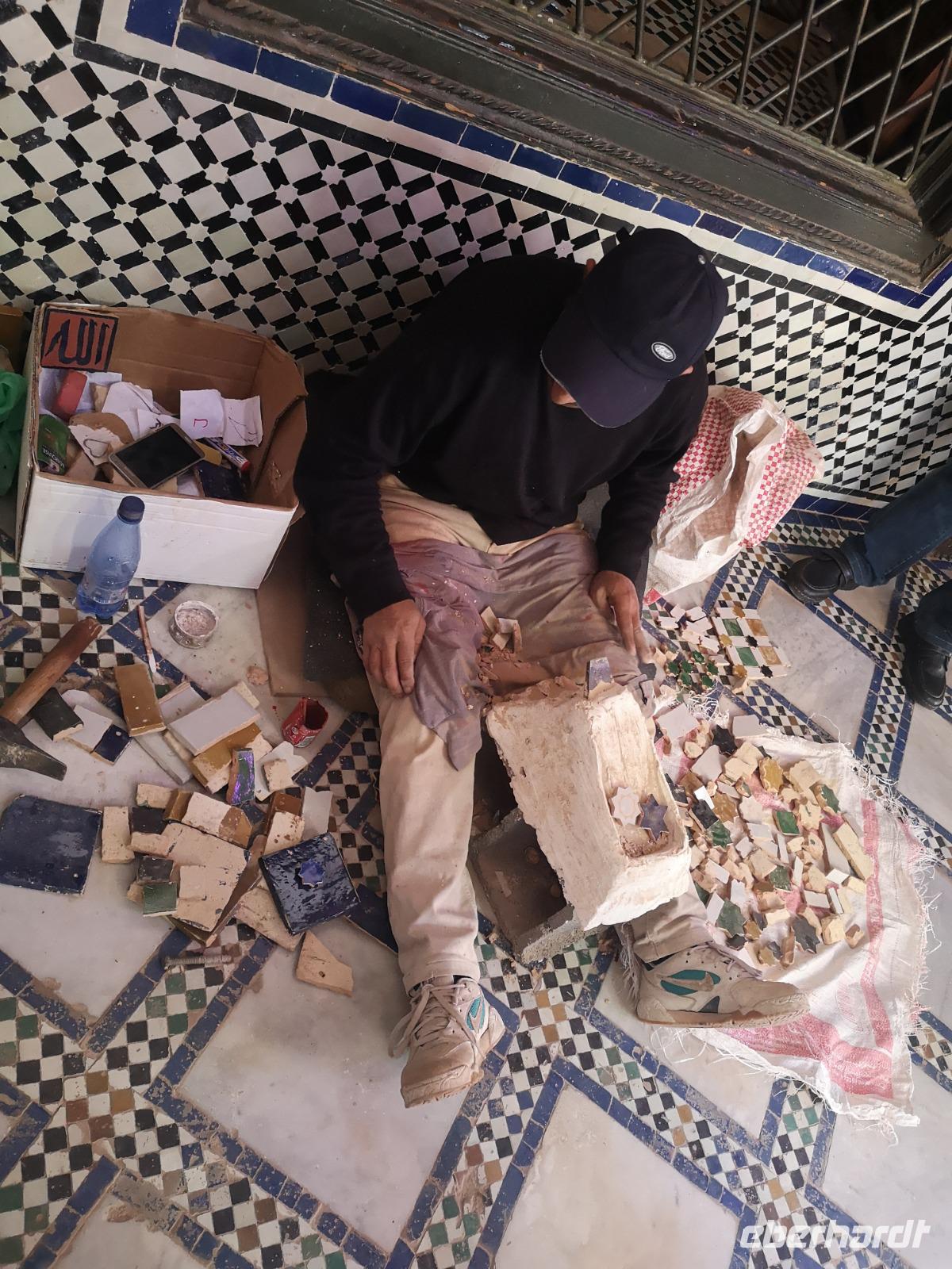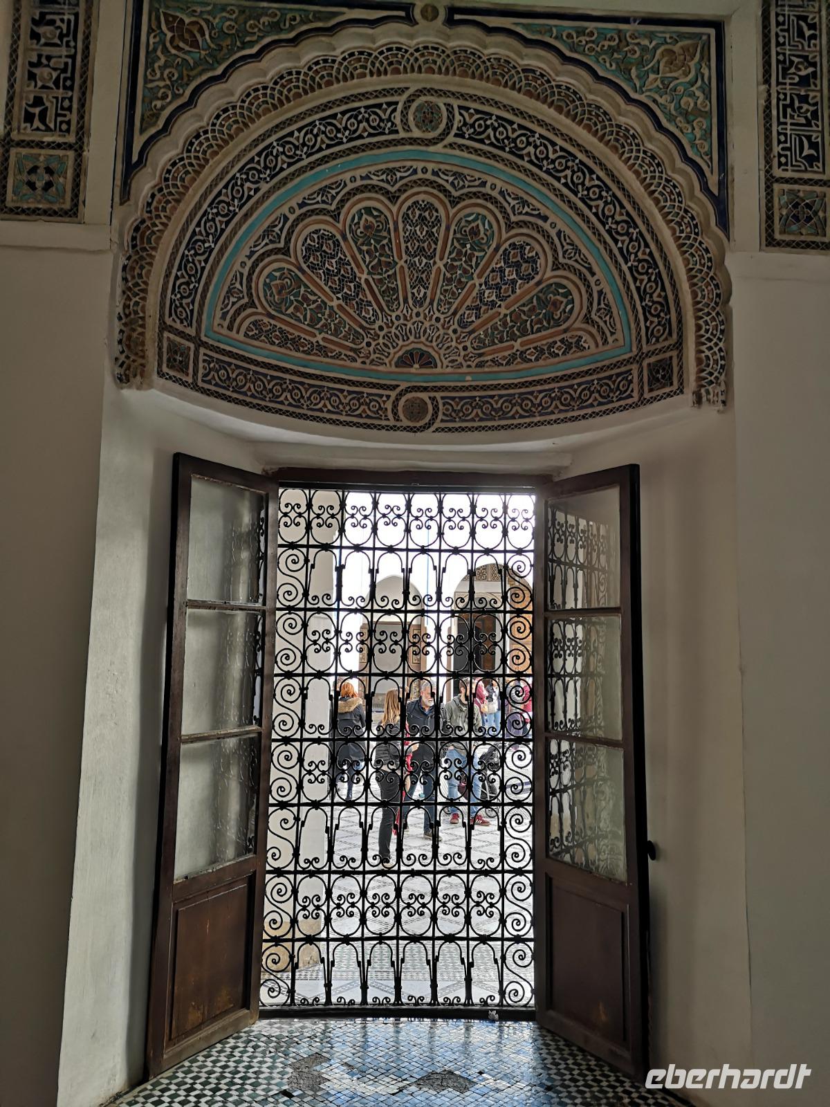 Nach dem Frühstück beginnt unsere Stadtrundfahrt. Mohammed und Abdul bringen uns zu erste zum großen Tor, dem Bab Agnaou. Weiter geht's zu den Saadier Gräbern, einer prächtigen Grabanlage inmitten der verwinkelten Straßen Marrakeschs. Wir fahren weiter um den berühmten Palast „Palais de la Bahia" zu besichtigen. Der Grosswesir eines Sultans hatte ihn sich im späten 19.Jahrhundert erbauen lassen. Er holte sich die besten Handwerker aus Fes und schuf damit ein wunderbares Beispiel marokkanischer Palastarchitektur mit Zedernholzdecken, Zeller-Keramik- und Stuckarbeiten. Die kleinen Gärtchen mit Springbrunnen und heimischen Pflanzen, wie Pomeranzen- und Granatapfelbäumen, sollen das Paradies symbolisieren. Hier wohnte der Wesir mit seiner Lieblingsfrau "Bahia" und seinem restlichen Harem. Weiter geht es zu einem weiteren interessanten "Riad" in dem heute ein Teppichmuseum untergebracht ist - das Dar Si Said Museum. Neben den Teppichen gibt auch dieses Haus einen guten Einblick in die Wohnkultur der wohlhabenden Marokkaner vergangener Zeiten.