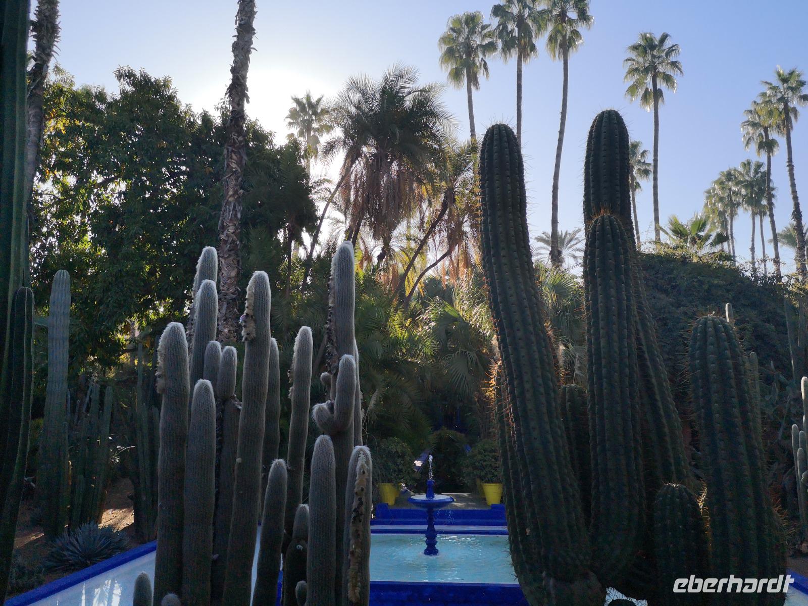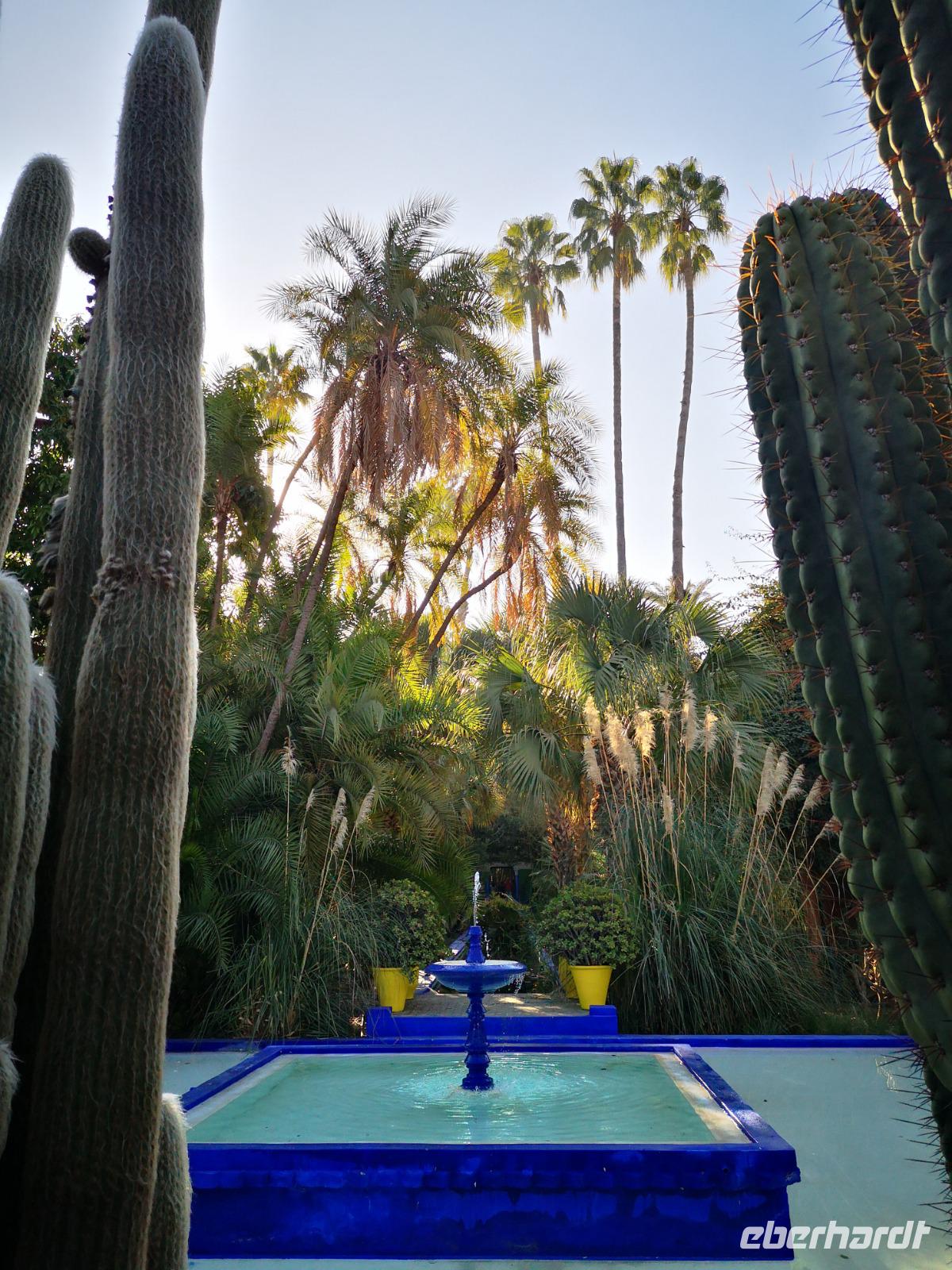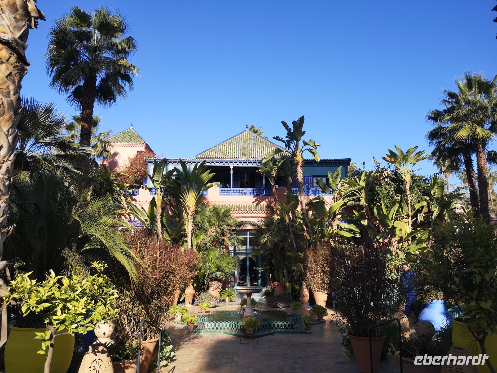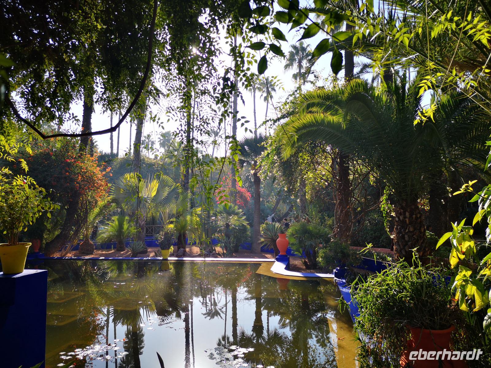 Nach einem späten Frühstück beginnen wir den Tag mit einem gemeinsamen Ausflug zum Jardin Majorelle Garten. Abseits des Straßenlärms können wir hier noch einmal tief Luft holen und lassen diese nahezu völlig andere Welt in Ruhe auf uns wirken. Der Rest des Tages steht uns frei zur Verfügung und wir fahren zum Hammam oder Hotel zurück.