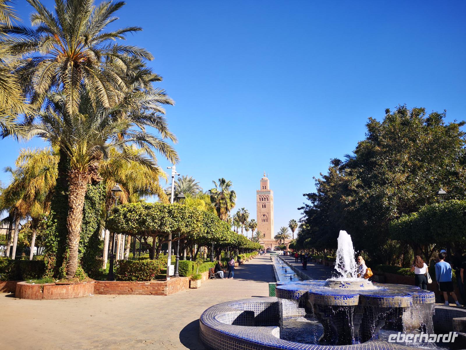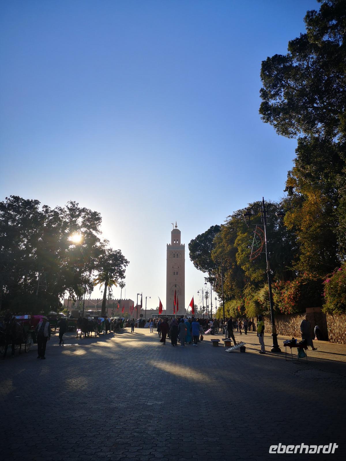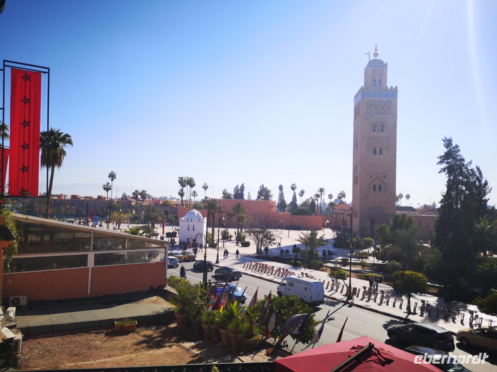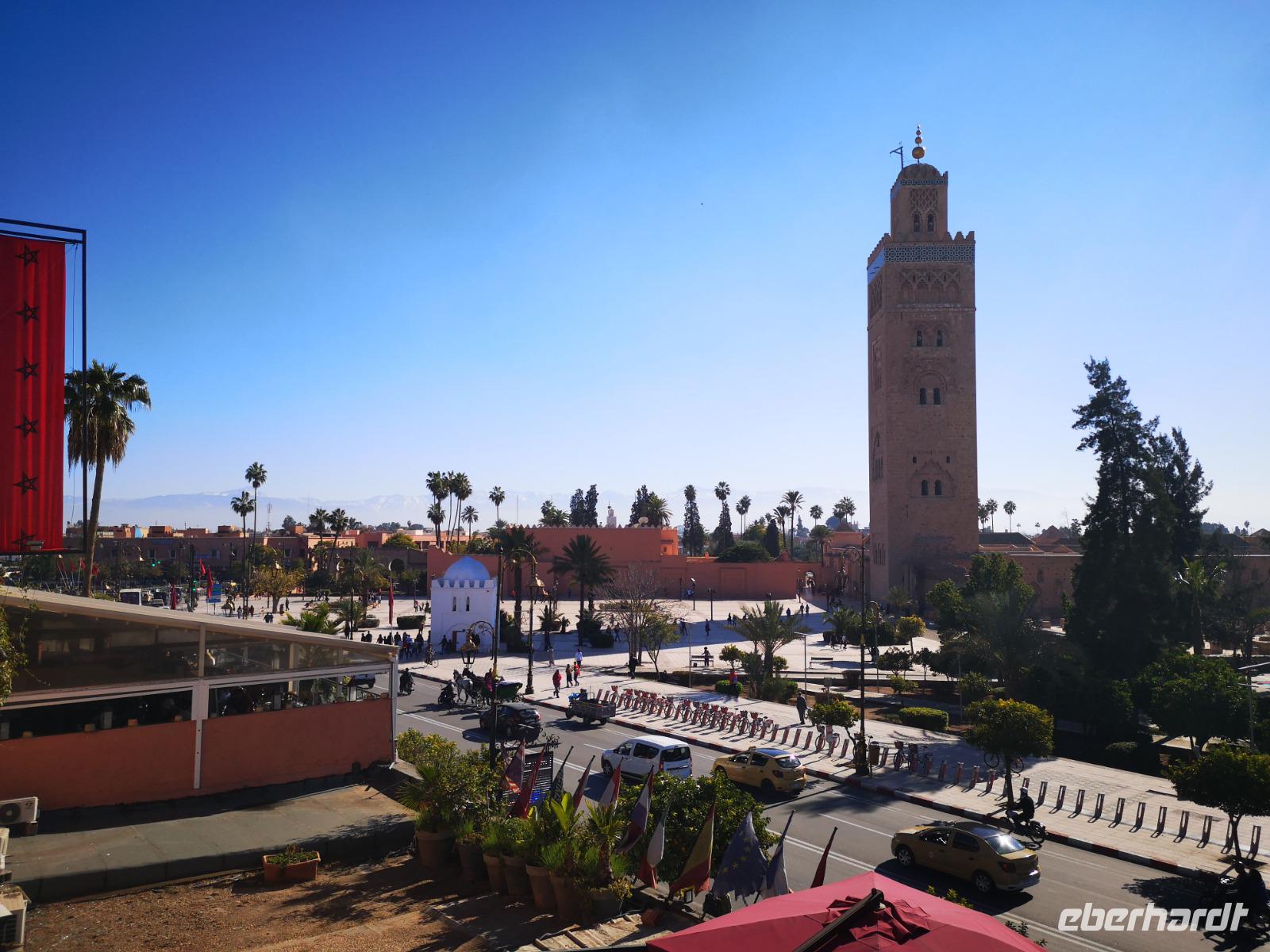 Noch ein kleiner Spaziergang zur Koutoubia Moschee und schon erreichen wir unser Café für die Mittagspause. Ein herrlicher Blick von hier, direkt zur Moschee und im Hintergrund sieht man sogar das Atlas-Gebirge mit seinen weißen schneebedeckten Gipfeln.