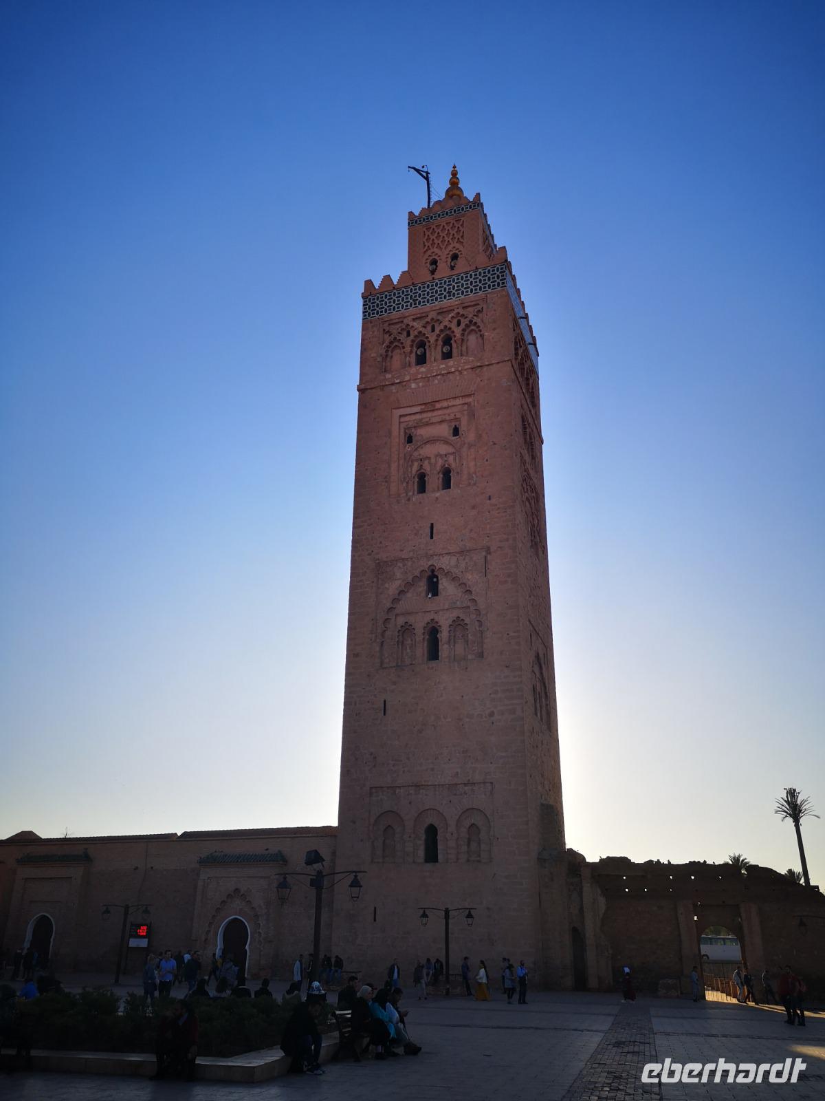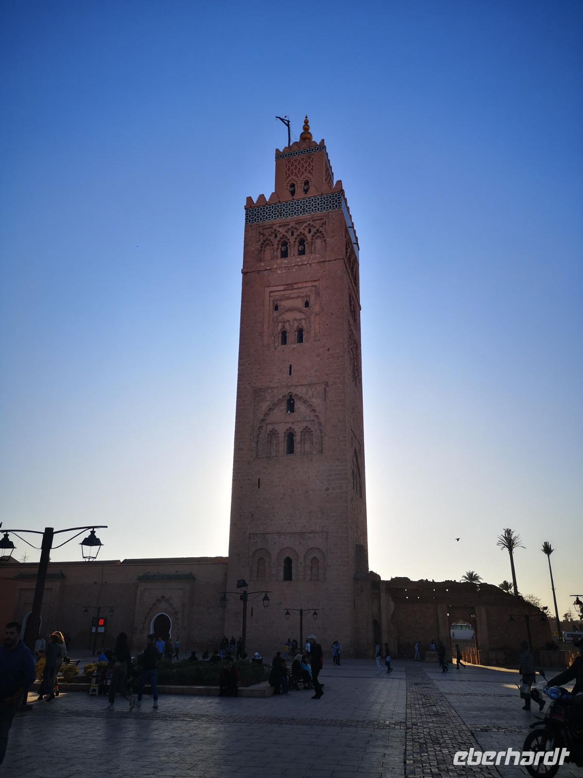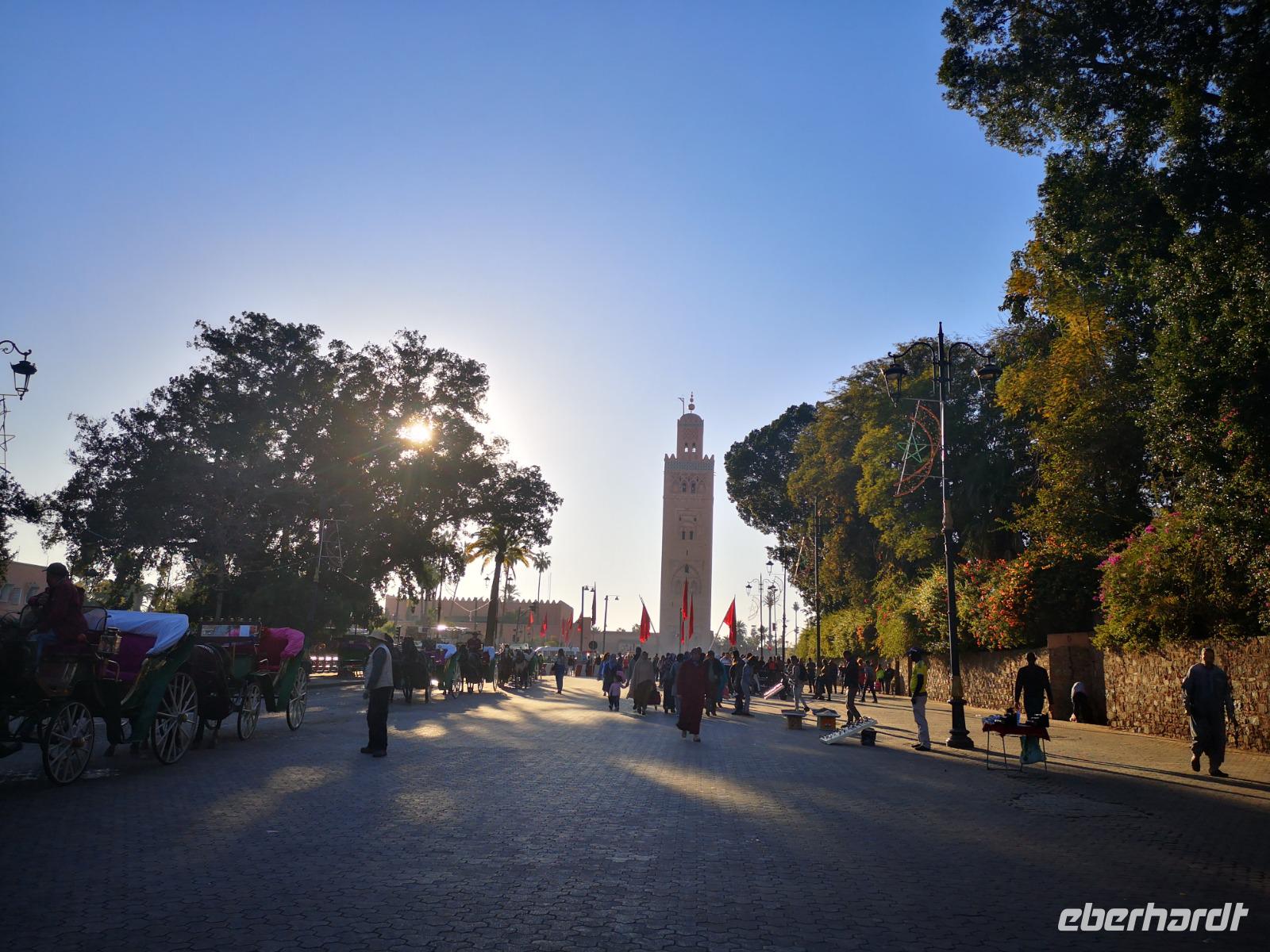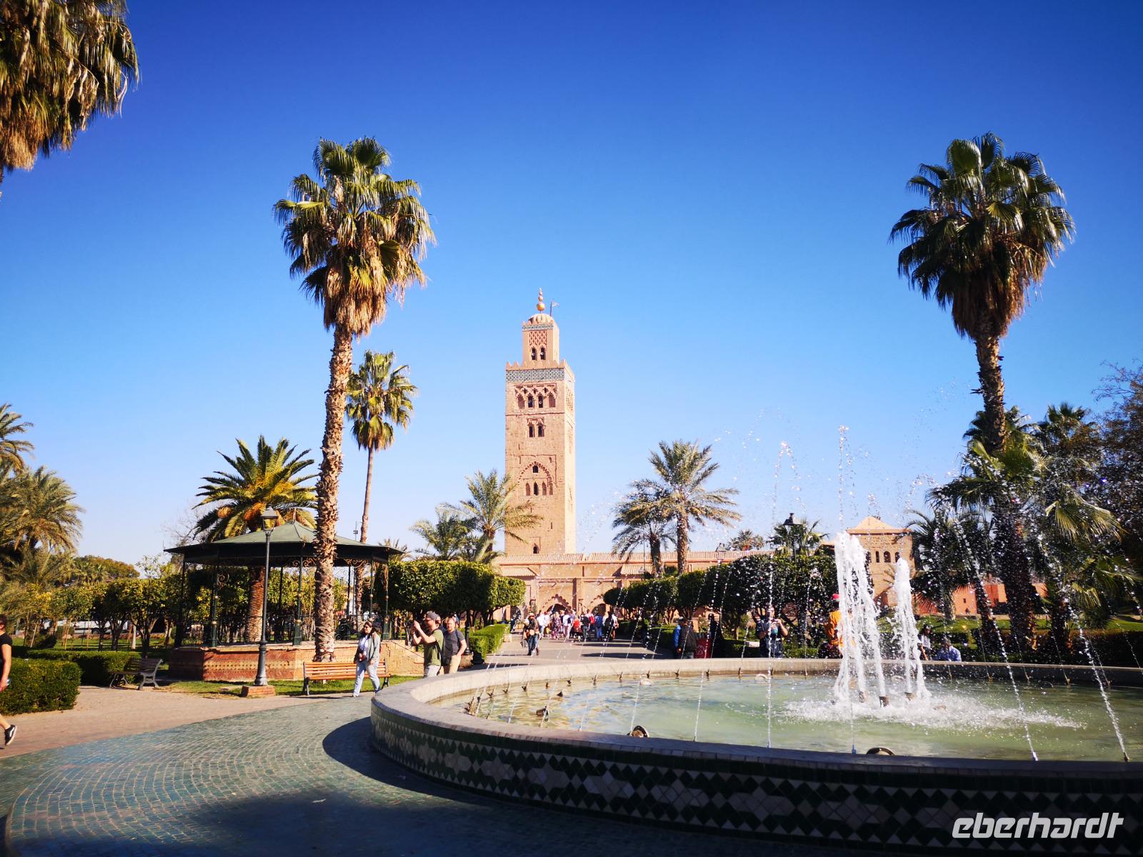 Noch ein kleiner Spaziergang zur Koutoubia Moschee und schon erreichen wir unser Café für die Mittagspause. Ein herrlicher Blick von hier, direkt zur Moschee und im Hintergrund sieht man sogar das Atlas-Gebirge mit seinen weißen schneebedeckten Gipfeln.