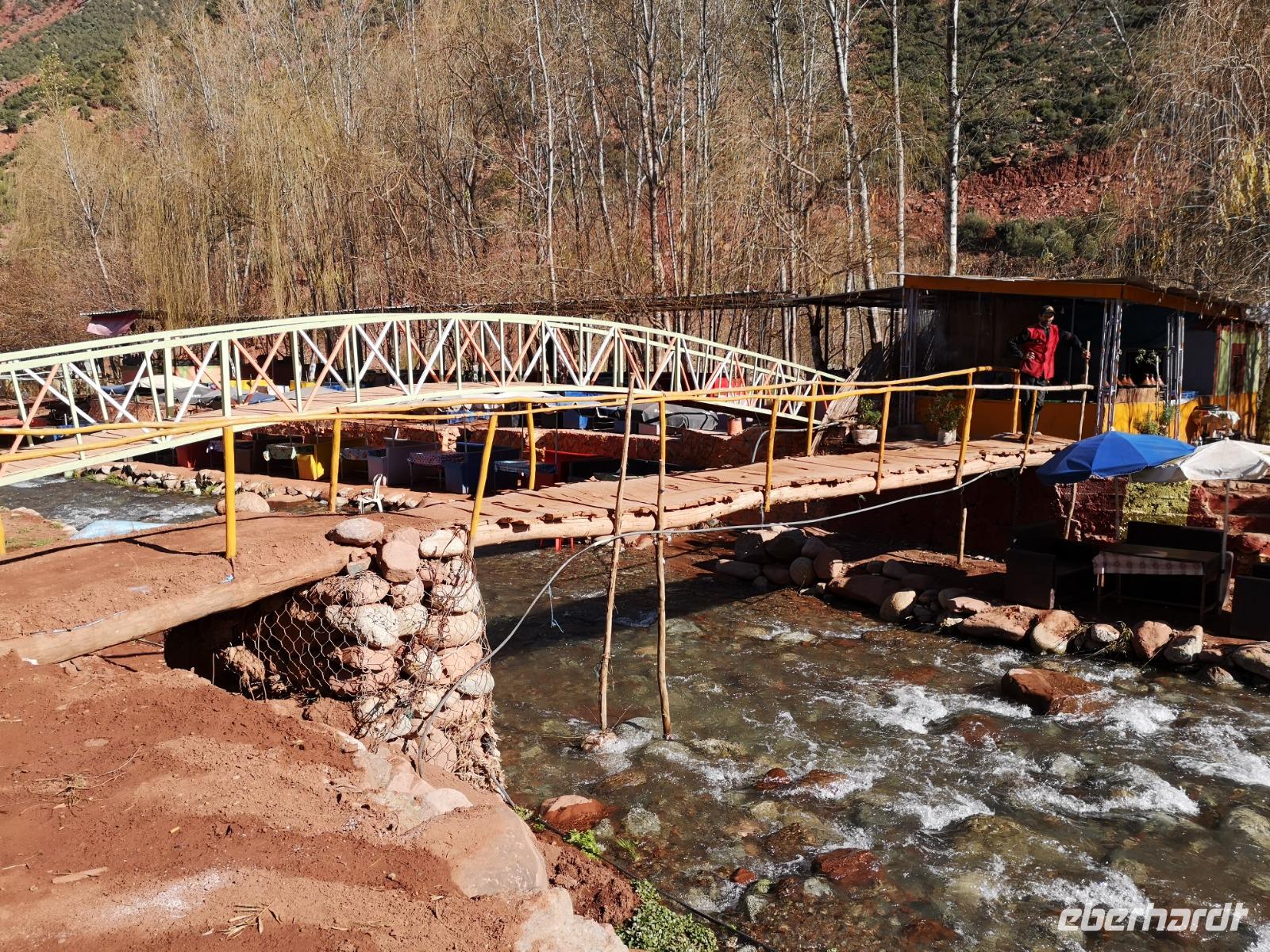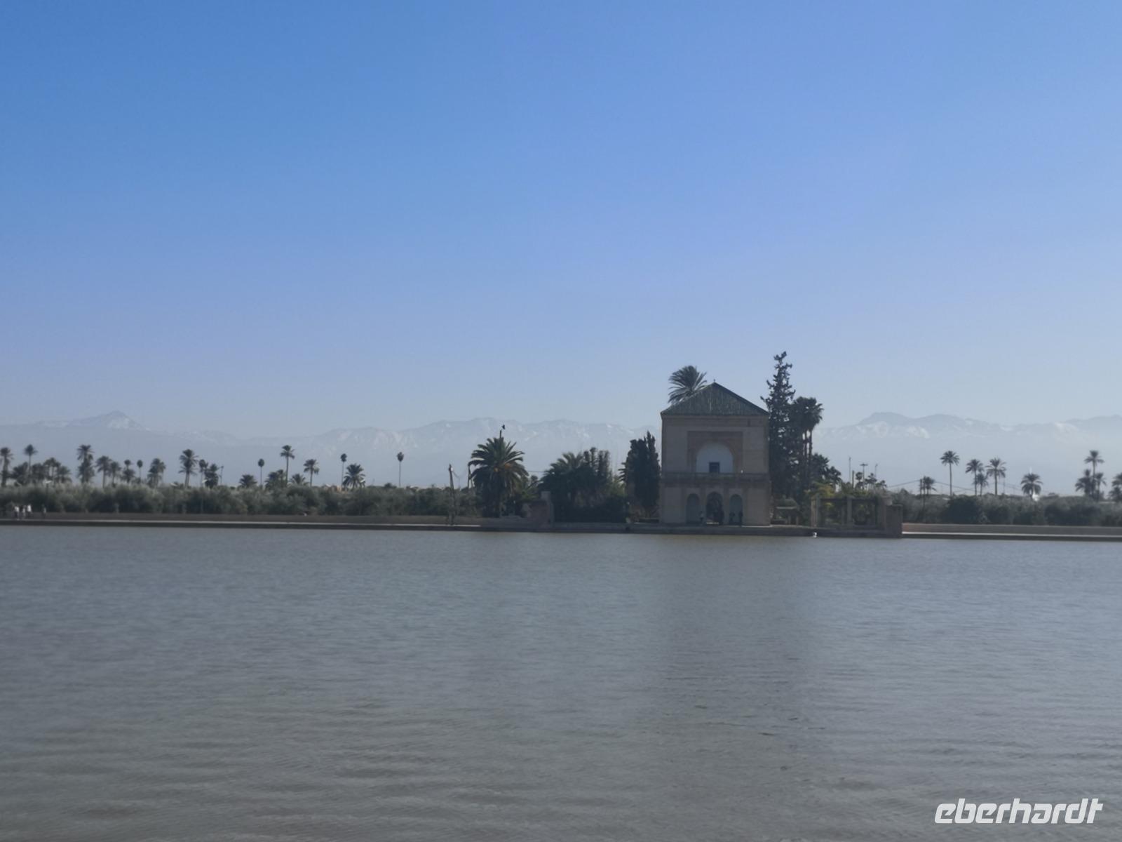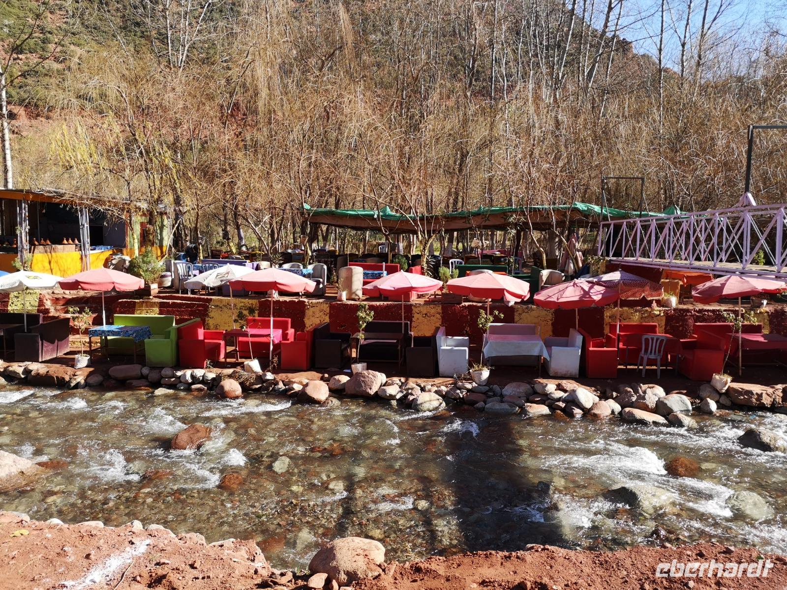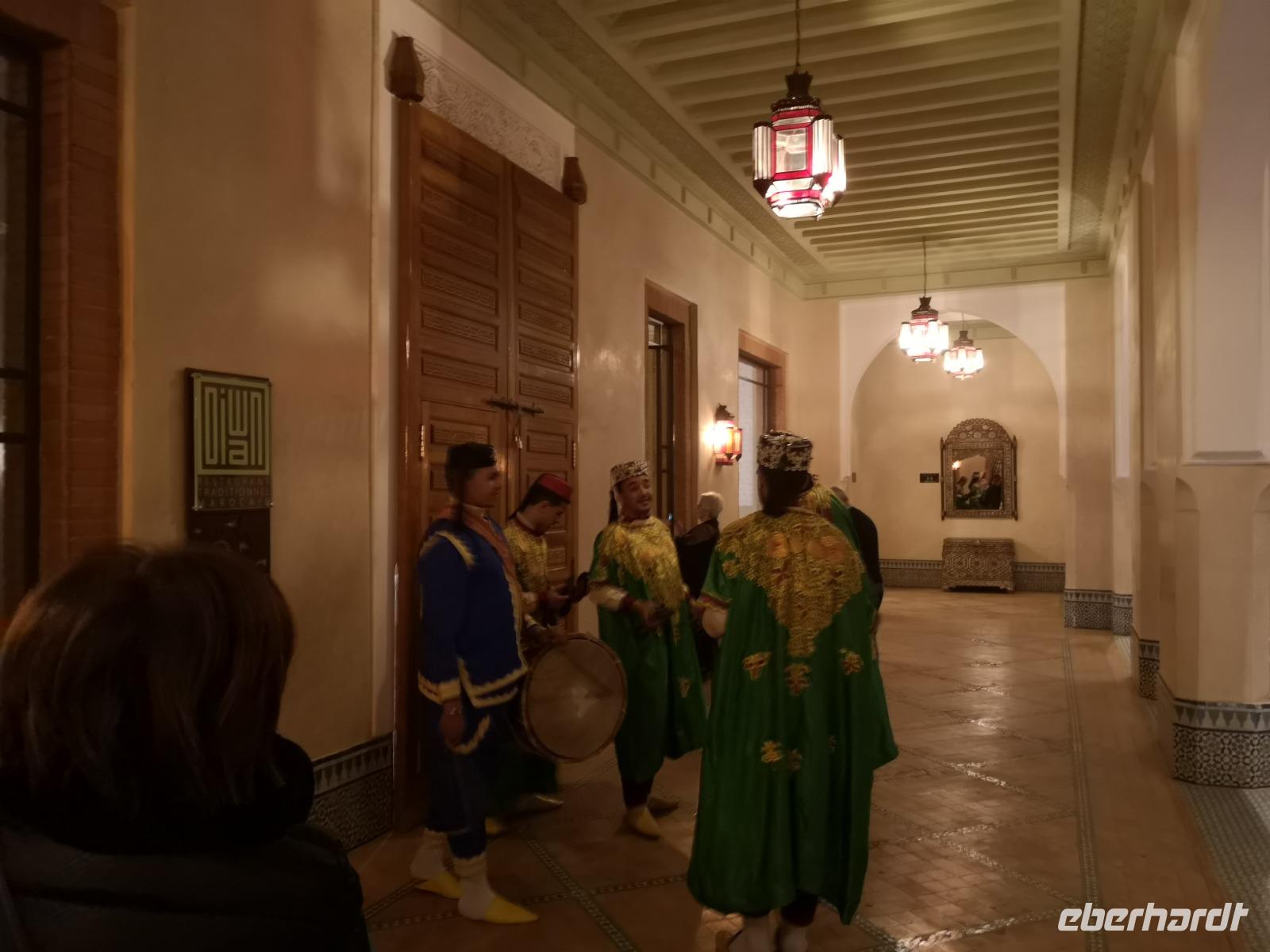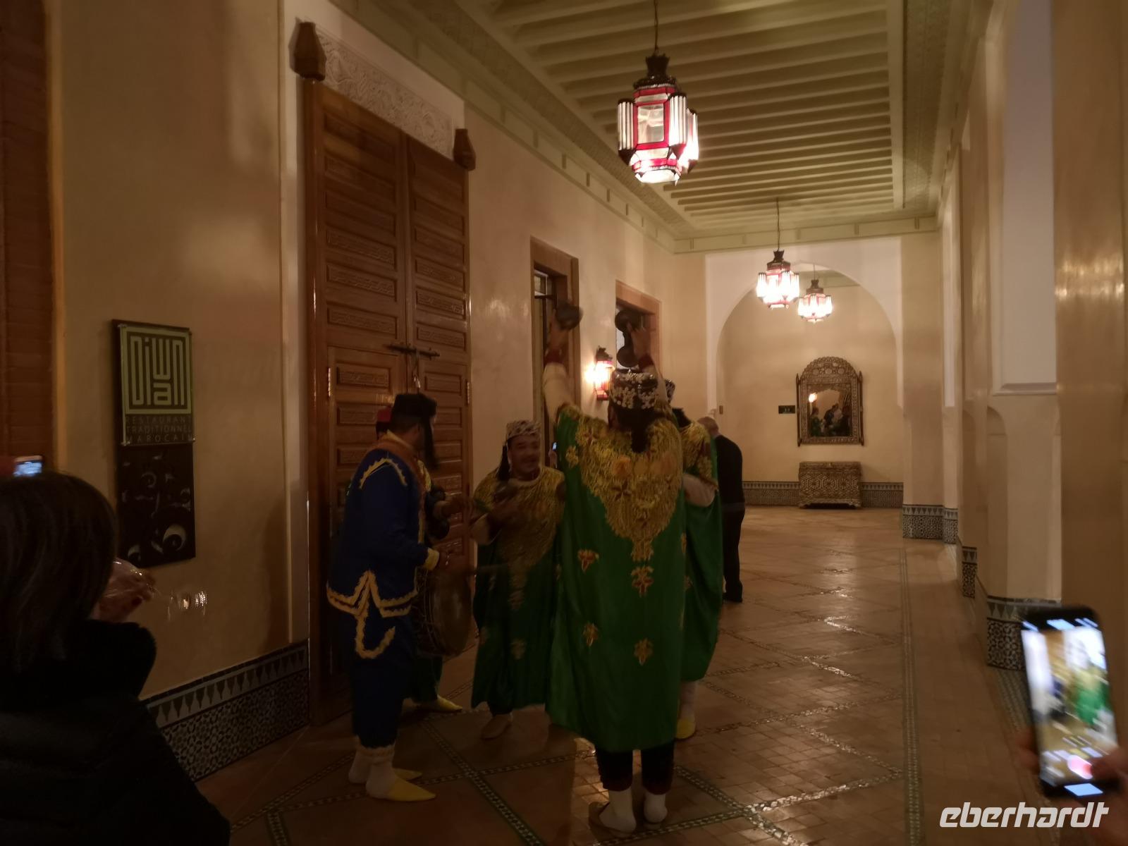 Am letzten Tag des Jahres fliehen wir noch einmal aus der quirligen Stadt und besuchen das Ourikatal im Atlasgebirge. Zuerst besuchen wir eine Berberfamilie und werden dort mit Fladenbrot und Tee mit Pfefferminze begrüßt. Wir dürfen uns das ganze Anwesen ansehen. Im Hof gibt es ein paar Tiere und eine schöne Terrasse mit Blick übers Tal. Wir legen einige Fotostopps entlang der Strecke ein, unser ständiger Wegbegleiter ist der Ourika-Fluss. Wir genießen das schöne Wetter bei einem Spaziergang am Fluss und kehren etwas später in ein Restaurant mit schöner Terrasse zum Mittagessen ein. Auf dem Rückweg nach Marrakesch besuchen wir noch den Menara-Garten. Zurück im Hotel bleibt noch Zeit um sich für den heutigen Abend vorzubereiten. Beim Begrüßungsdrink im Patio werden wir musikalisch von Berbermusik überrascht. Etwas später dürfen wir dann endlich in den großen Saal, alle Tische sind festlich geschmückt. In der Mitte des Saals befindet sich die Bühne und verschiedene Darsteller, Musiker wie Tänzer geben ihr Bestes um uns einen tollen Abend zu bescheren. Auch die Kellner sind stets bemüht um uns unsere Wünsche zu erfüllen. Die Zeit wird in regelmäßigen Abständen mit dem mehrgängigen Menü ausgenutzt bis es dann schließlich Mitternacht ist - Prosit Neujahr!