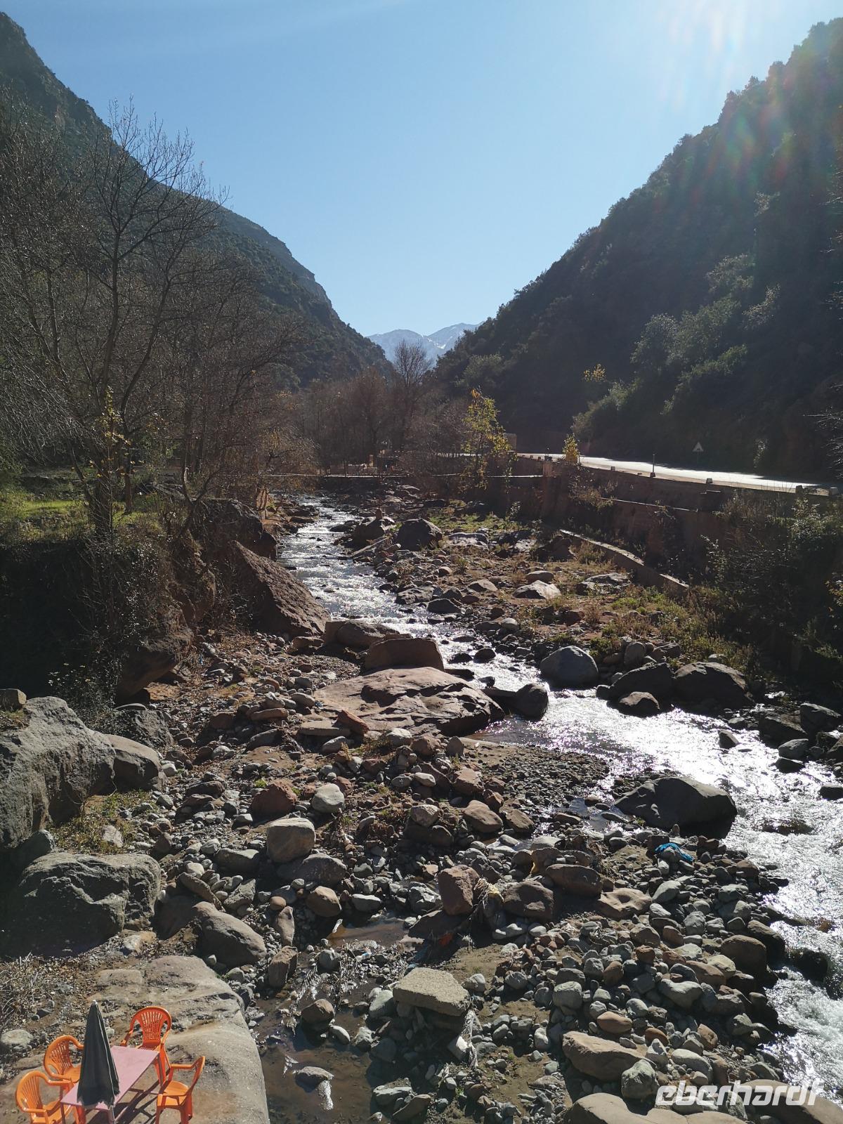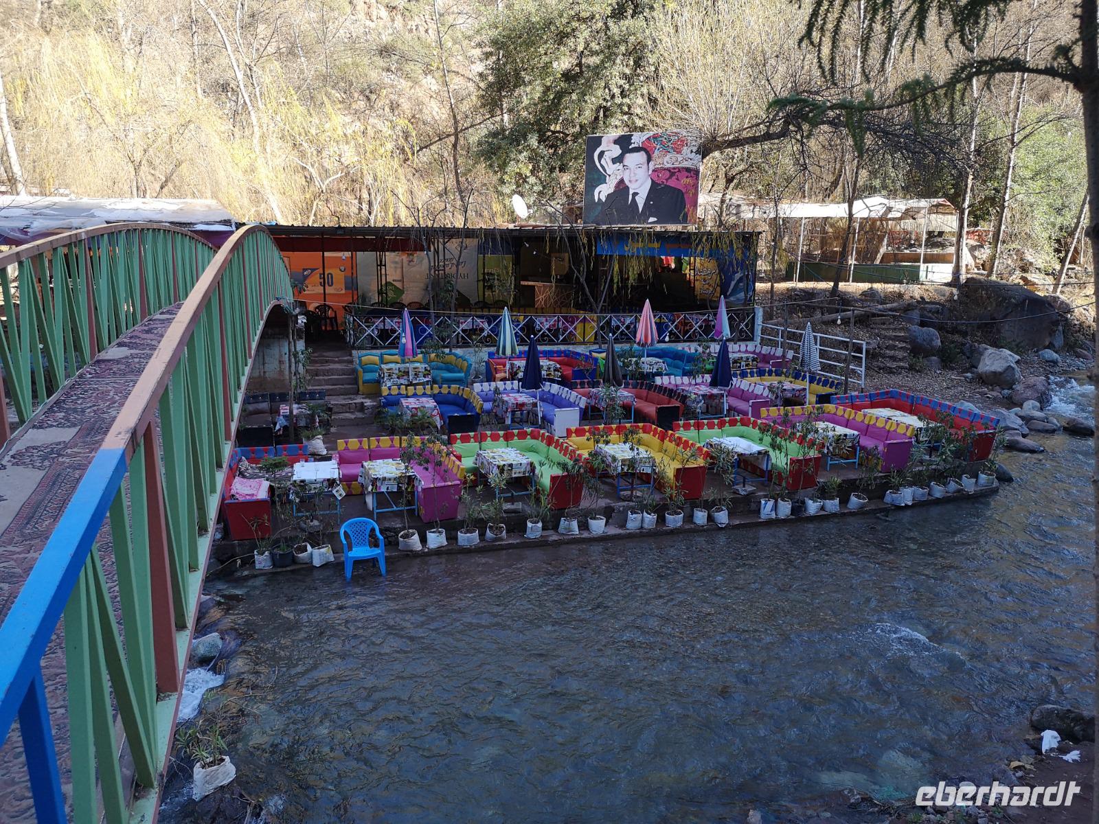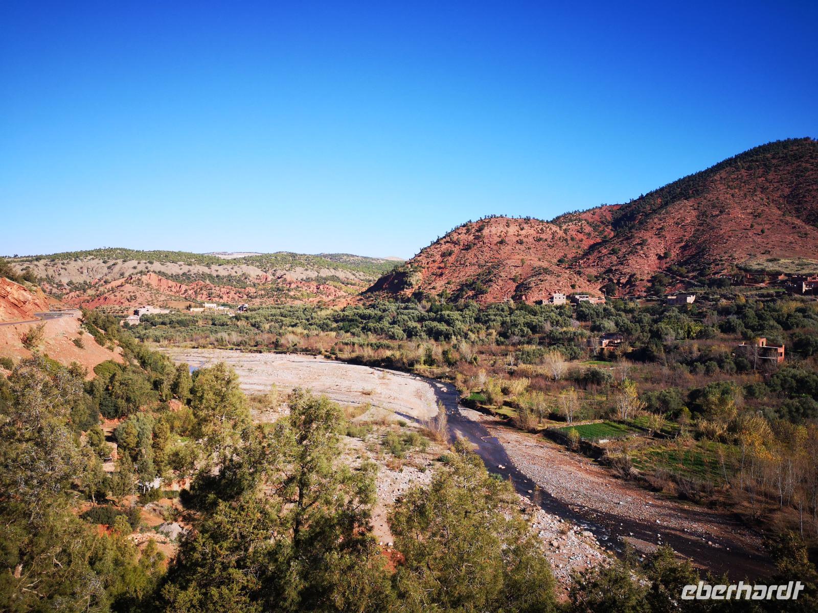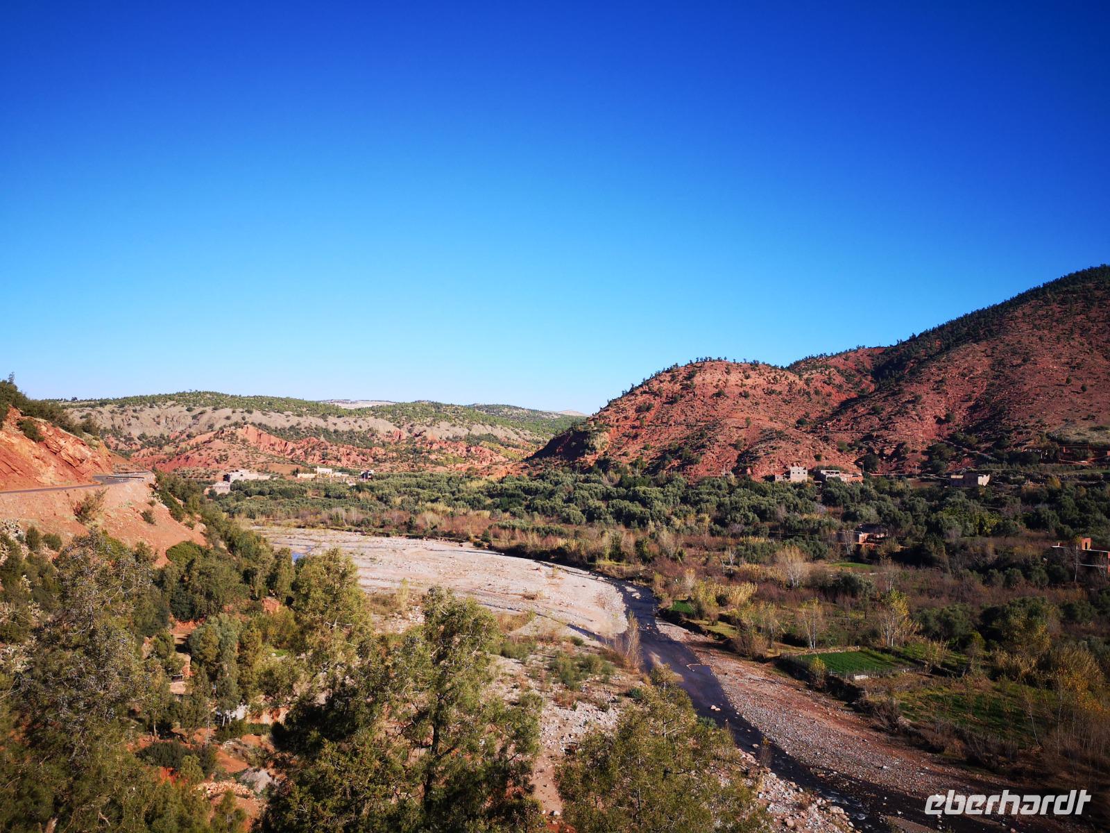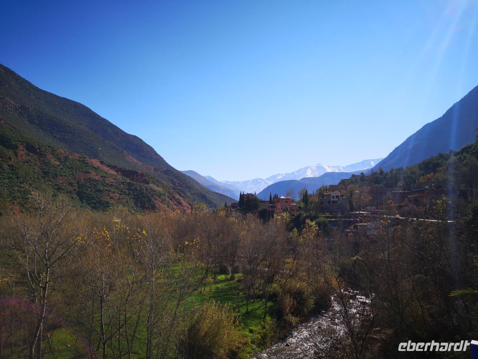 Am letzten Tag des Jahres fliehen wir noch einmal aus der quirligen Stadt und besuchen das Ourikatal im Atlasgebirge. Zuerst besuchen wir eine Berberfamilie und werden dort mit Fladenbrot und Tee mit Pfefferminze begrüßt. Wir dürfen uns das ganze Anwesen ansehen. Im Hof gibt es ein paar Tiere und eine schöne Terrasse mit Blick übers Tal. Wir legen einige Fotostopps entlang der Strecke ein, unser ständiger Wegbegleiter ist der Ourika-Fluss. Wir genießen das schöne Wetter bei einem Spaziergang am Fluss und kehren etwas später in ein Restaurant mit schöner Terrasse zum Mittagessen ein. Auf dem Rückweg nach Marrakesch besuchen wir noch den Menara-Garten. Zurück im Hotel bleibt noch Zeit um sich für den heutigen Abend vorzubereiten. Beim Begrüßungsdrink im Patio werden wir musikalisch von Berbermusik überrascht. Etwas später dürfen wir dann endlich in den großen Saal, alle Tische sind festlich geschmückt. In der Mitte des Saals befindet sich die Bühne und verschiedene Darsteller, Musiker wie Tänzer geben ihr Bestes um uns einen tollen Abend zu bescheren. Auch die Kellner sind stets bemüht um uns unsere Wünsche zu erfüllen. Die Zeit wird in regelmäßigen Abständen mit dem mehrgängigen Menü ausgenutzt bis es dann schließlich Mitternacht ist - Prosit Neujahr!