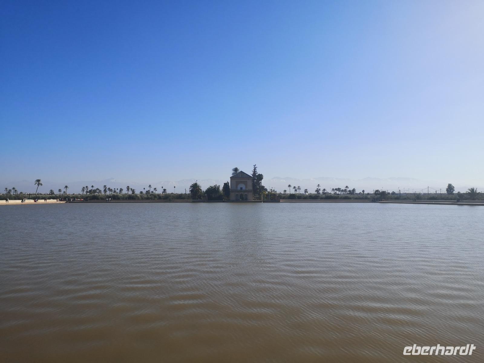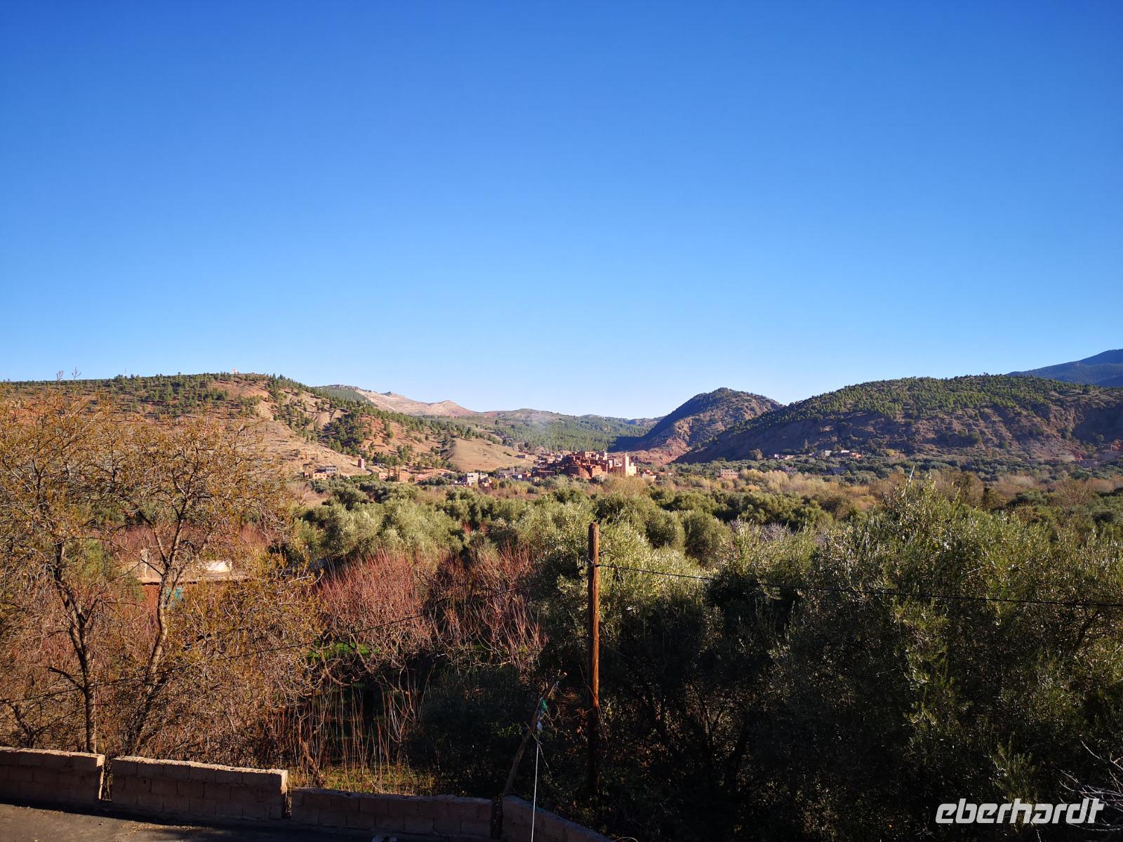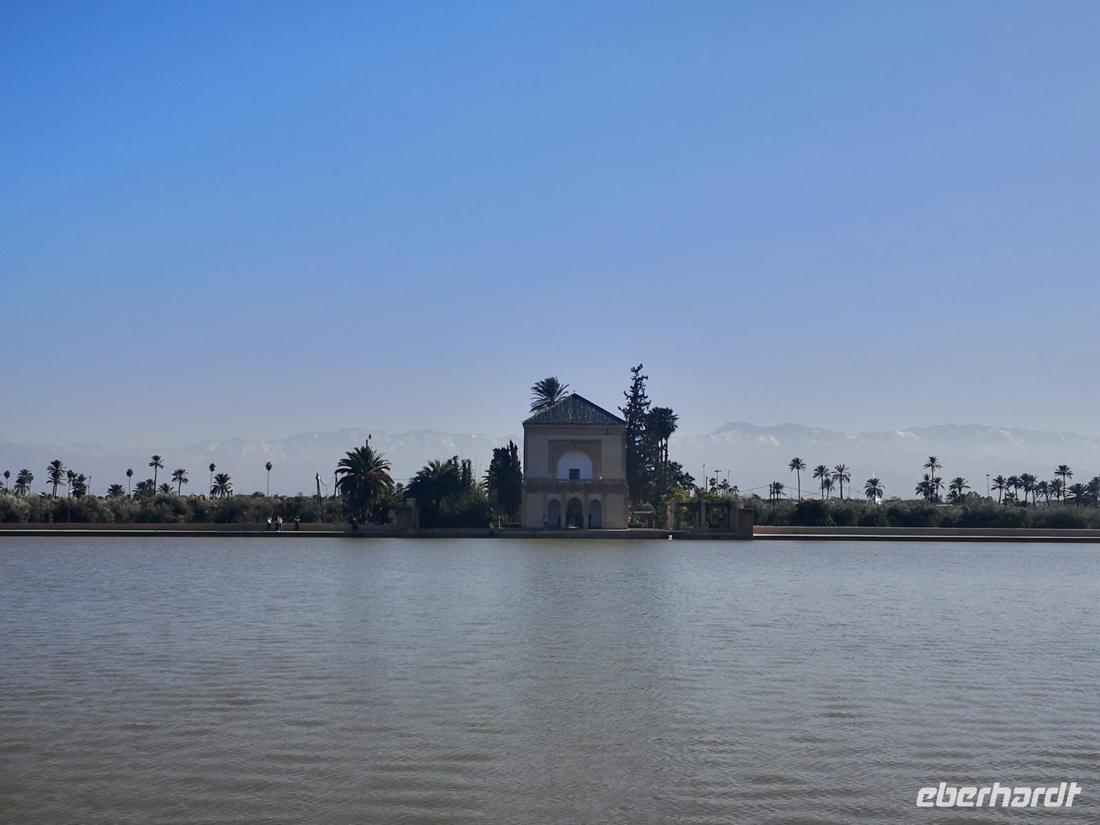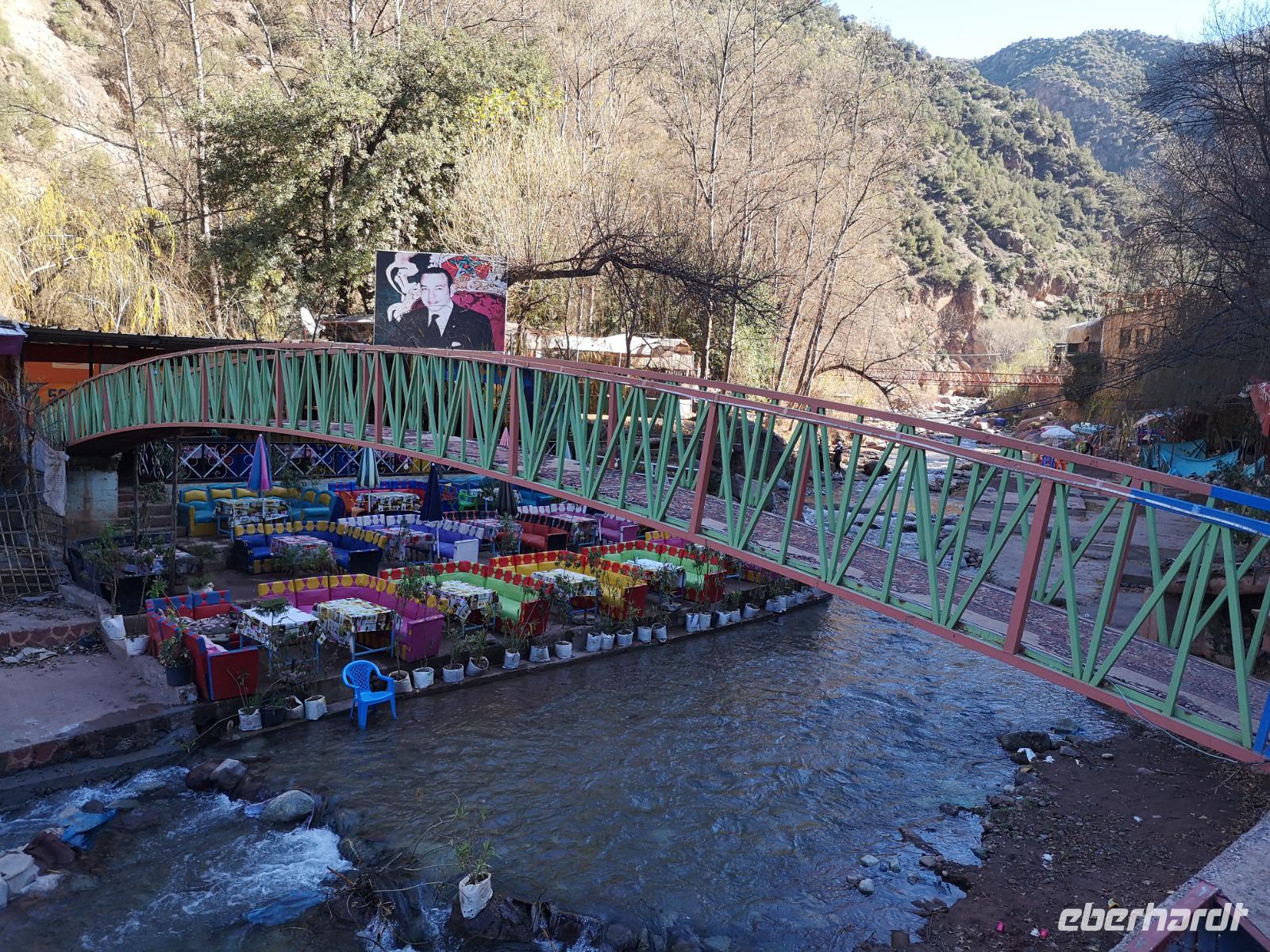 Am letzten Tag des Jahres fliehen wir noch einmal aus der quirligen Stadt und besuchen das Ourikatal im Atlasgebirge. Zuerst besuchen wir eine Berberfamilie und werden dort mit Fladenbrot und Tee mit Pfefferminze begrüßt. Wir dürfen uns das ganze Anwesen ansehen. Im Hof gibt es ein paar Tiere und eine schöne Terrasse mit Blick übers Tal. Wir legen einige Fotostopps entlang der Strecke ein, unser ständiger Wegbegleiter ist der Ourika-Fluss. Wir genießen das schöne Wetter bei einem Spaziergang am Fluss und kehren etwas später in ein Restaurant mit schöner Terrasse zum Mittagessen ein. Auf dem Rückweg nach Marrakesch besuchen wir noch den Menara-Garten. Zurück im Hotel bleibt noch Zeit um sich für den heutigen Abend vorzubereiten. Beim Begrüßungsdrink im Patio werden wir musikalisch von Berbermusik überrascht. Etwas später dürfen wir dann endlich in den großen Saal, alle Tische sind festlich geschmückt. In der Mitte des Saals befindet sich die Bühne und verschiedene Darsteller, Musiker wie Tänzer geben ihr Bestes um uns einen tollen Abend zu bescheren. Auch die Kellner sind stets bemüht um uns unsere Wünsche zu erfüllen. Die Zeit wird in regelmäßigen Abständen mit dem mehrgängigen Menü ausgenutzt bis es dann schließlich Mitternacht ist - Prosit Neujahr!