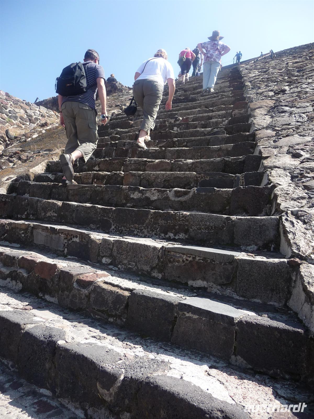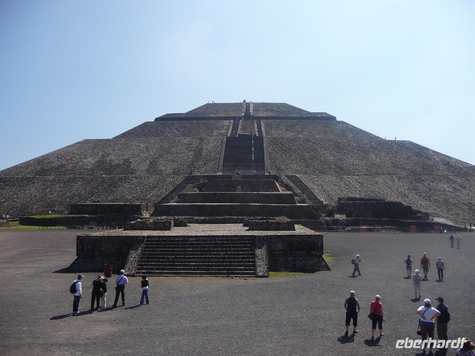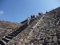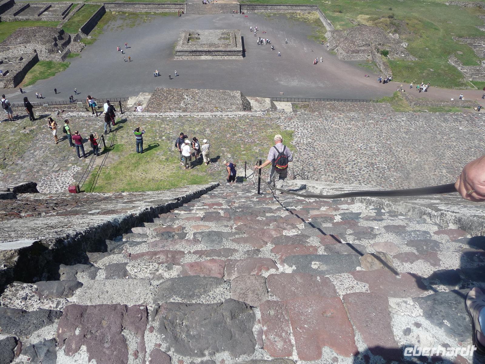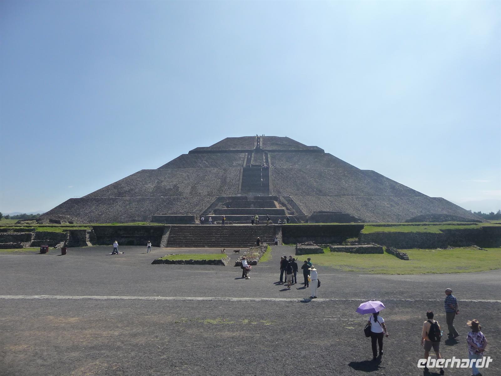 Heute startete unser zweiter Tag in Mexiko City wieder mit dem leckeren Frühstück im Hotel, bevor es um 9 Uhr wieder los ging. Unser netter Busfahrer und Laura erwarteten uns wieder pünktlich. Wir fuhren Richtung Norden um die älteste ausgegrabene Stadt Mesoamerikas zu besuchen - Teotihuacan! Der Weg dahin war sehr interessant, wir fuhren duch diese riesengroße Stadt vorbei an endlosen Wohngebieten, Stadtteilen, Häusern und Menschen. Also wir dachten wirklich diese Stadt nimmt kein Ende. Bis wir dann in dem „kleinen“ Städtchen Teotihuacan ankamen. Es wirkte richtig schön auf uns. Wir stoppten auf dem „Kiosk“ - dem Marktplatz. Dort gefielen uns die vielen Stände mit dem vielen frischen Obst, dem Gemüse, frischen Essen… Wir schlenderten eine Weile über den Markt, aßen alle eine frische Babybanane und machten noch ein tolles Gruppenbild. Schön!!! Und dann fuhren wir weiter zu den berühmten Pyramiden. Einfach toll, zum einen die Sonnenpyramide und zum anderen die Mondpyramide.
