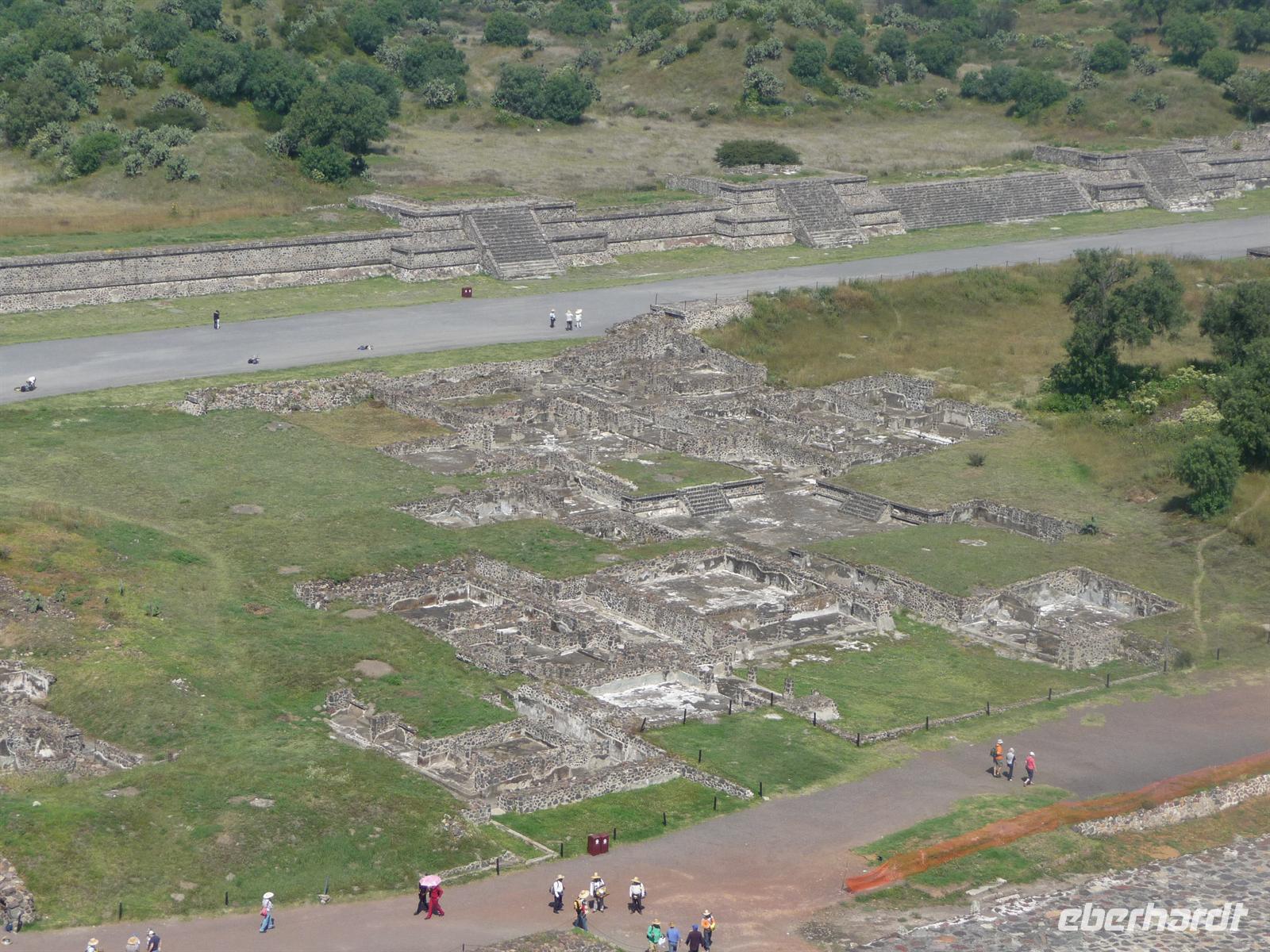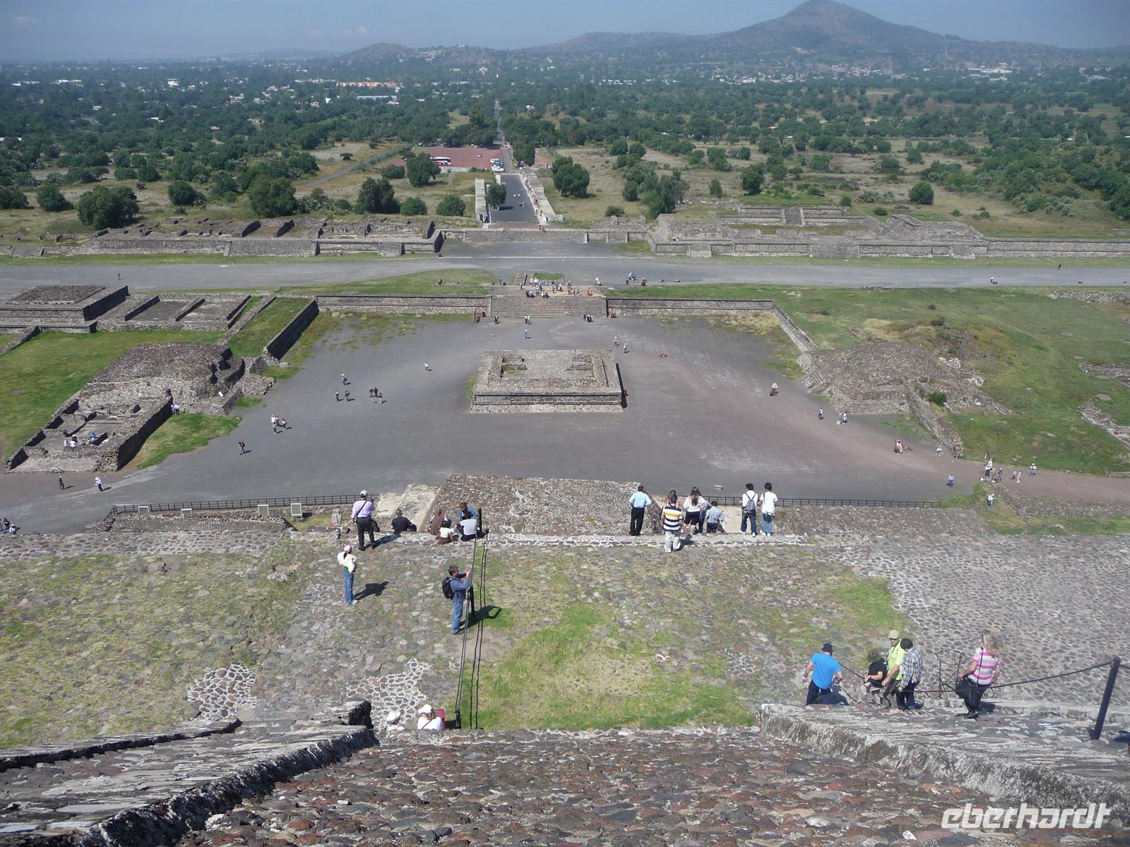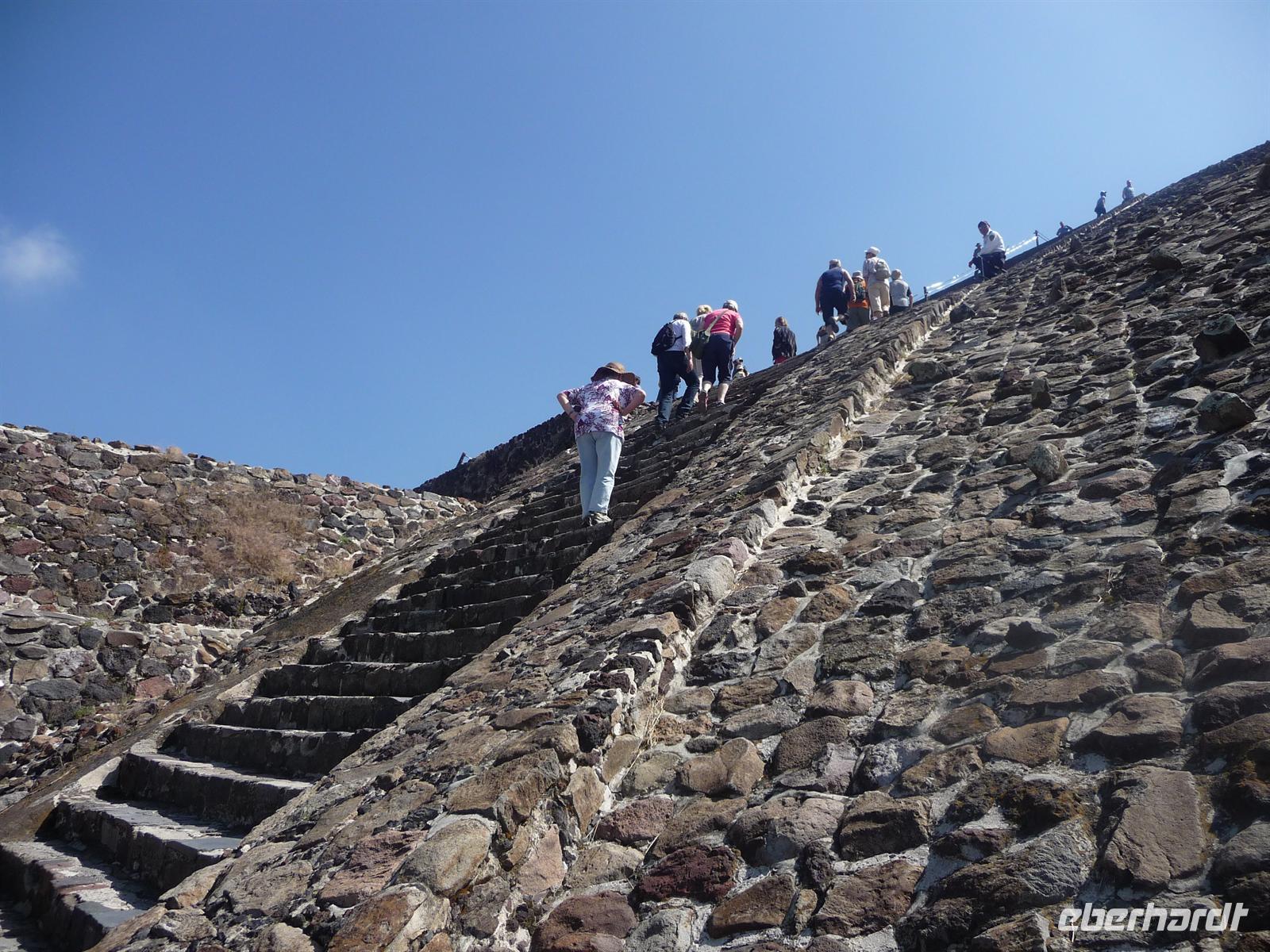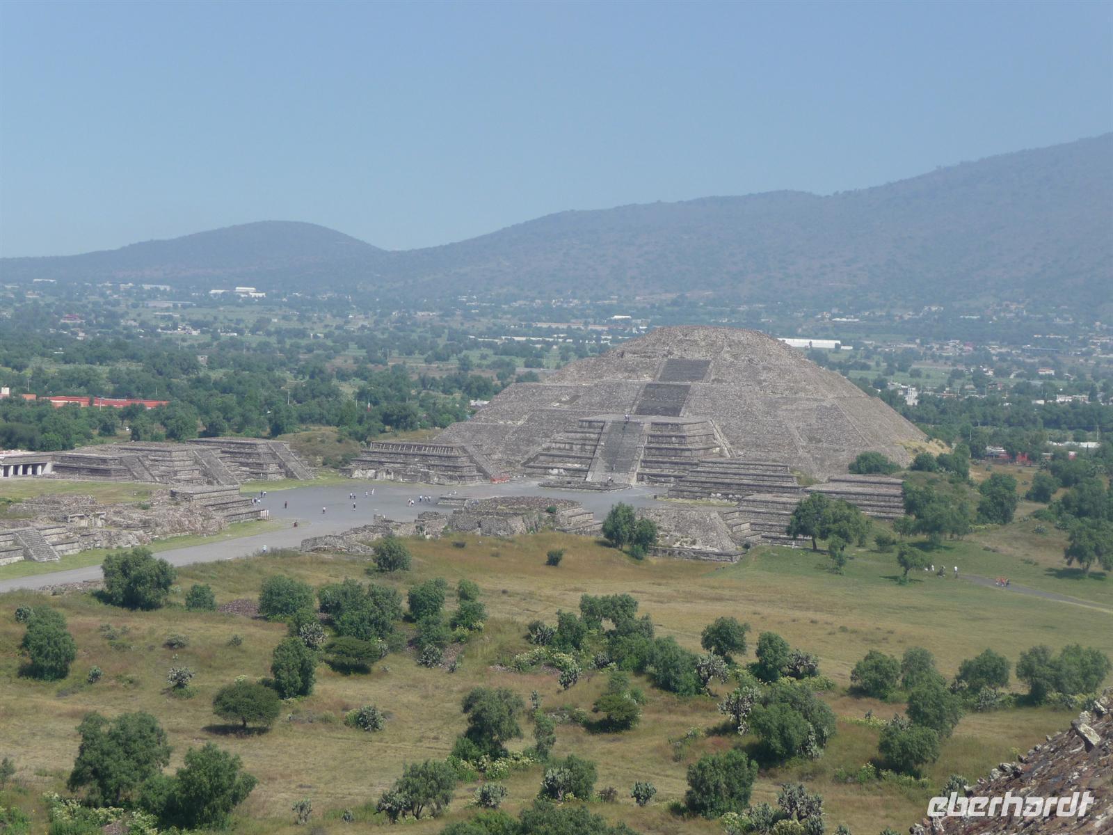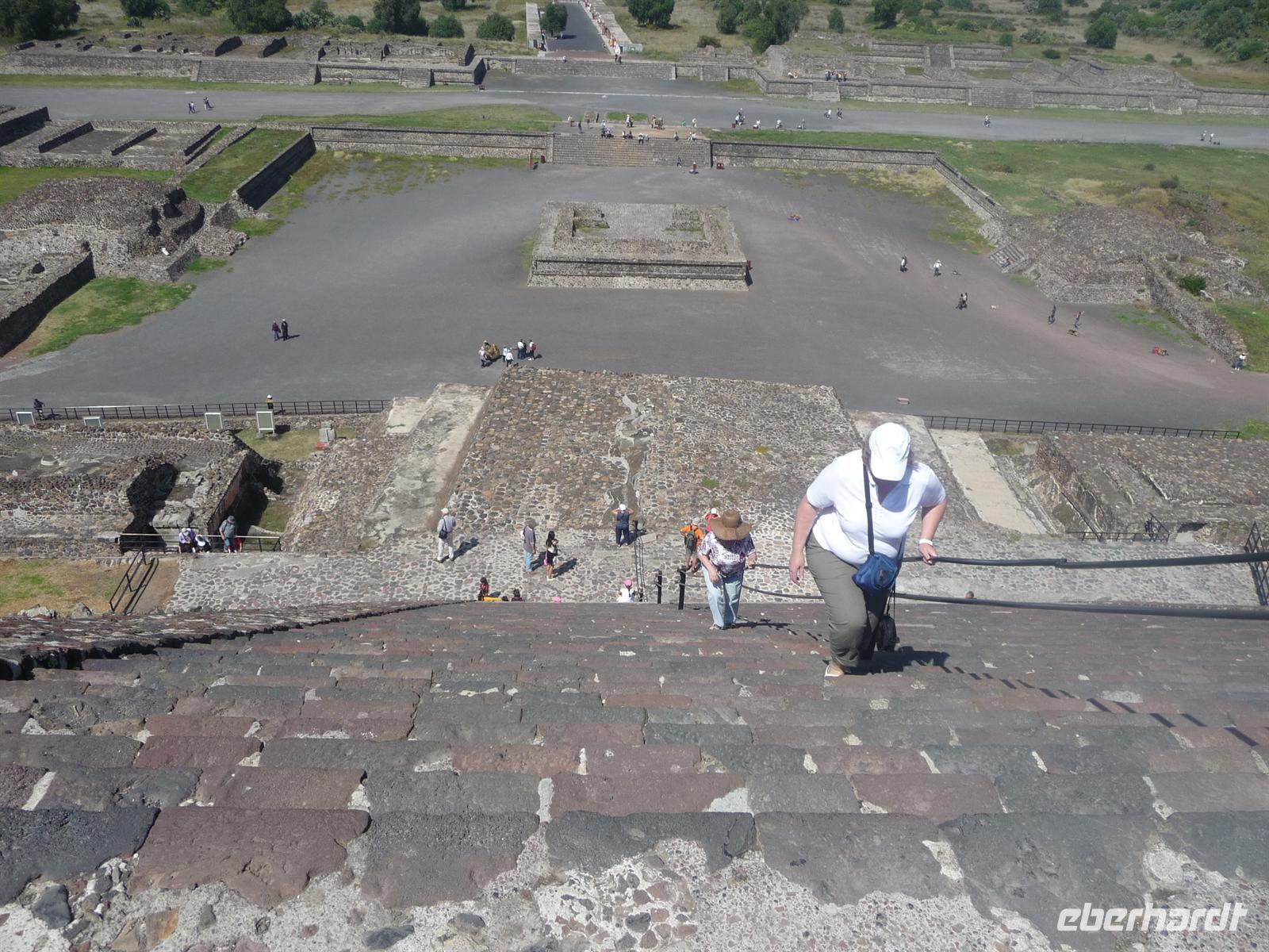 Heute startete unser zweiter Tag in Mexiko City wieder mit dem leckeren Frühstück im Hotel, bevor es um 9 Uhr wieder los ging. Unser netter Busfahrer und Laura erwarteten uns wieder pünktlich. Wir fuhren Richtung Norden um die älteste ausgegrabene Stadt Mesoamerikas zu besuchen - Teotihuacan! Der Weg dahin war sehr interessant, wir fuhren duch diese riesengroße Stadt vorbei an endlosen Wohngebieten, Stadtteilen, Häusern und Menschen. Also wir dachten wirklich diese Stadt nimmt kein Ende. Bis wir dann in dem „kleinen“ Städtchen Teotihuacan ankamen. Es wirkte richtig schön auf uns. Wir stoppten auf dem „Kiosk“ - dem Marktplatz. Dort gefielen uns die vielen Stände mit dem vielen frischen Obst, dem Gemüse, frischen Essen… Wir schlenderten eine Weile über den Markt, aßen alle eine frische Babybanane und machten noch ein tolles Gruppenbild. Schön!!! Und dann fuhren wir weiter zu den berühmten Pyramiden. Einfach toll, zum einen die Sonnenpyramide und zum anderen die Mondpyramide.