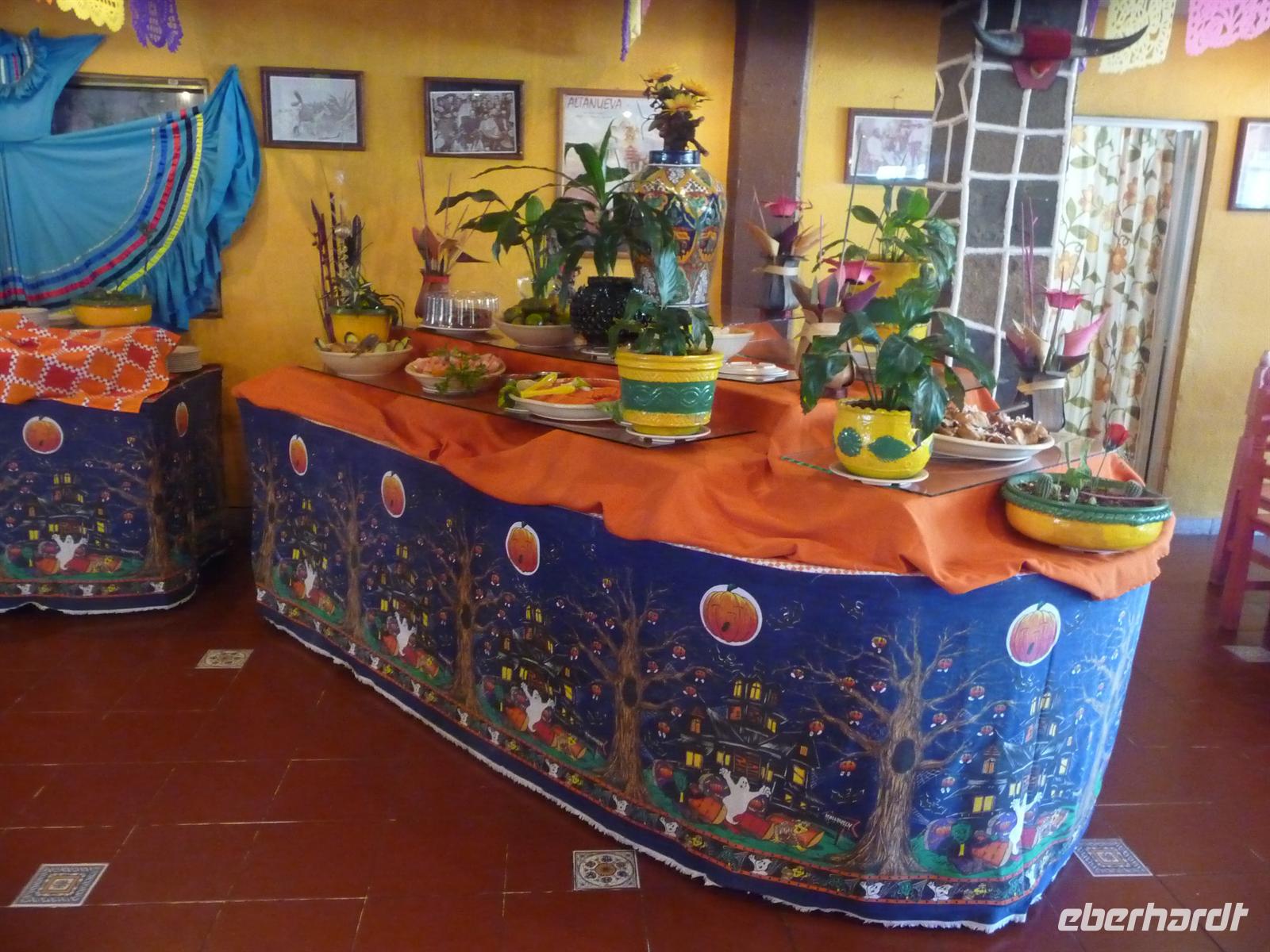 Pyramide sind auch alle wieder gesund unten angekommen. Nun fuhren wir in ein nahe gelegenes Restaurant - gleich hinter die Pyramiden. Es war eine richtig schöne mexikanische Gaststätte, mit bunten Tischen, bunter Deko und richtig gutem mexikanischem Essen. Nach einer Suppe schlemmten wir alle von dem leckeren Buffet. Und zwei Musiker unterhielten uns mit ihrer tollen Musik - viva Mexico!