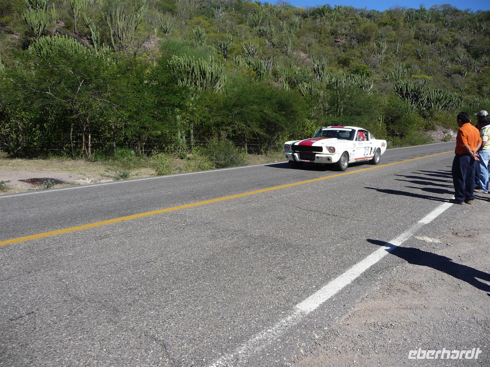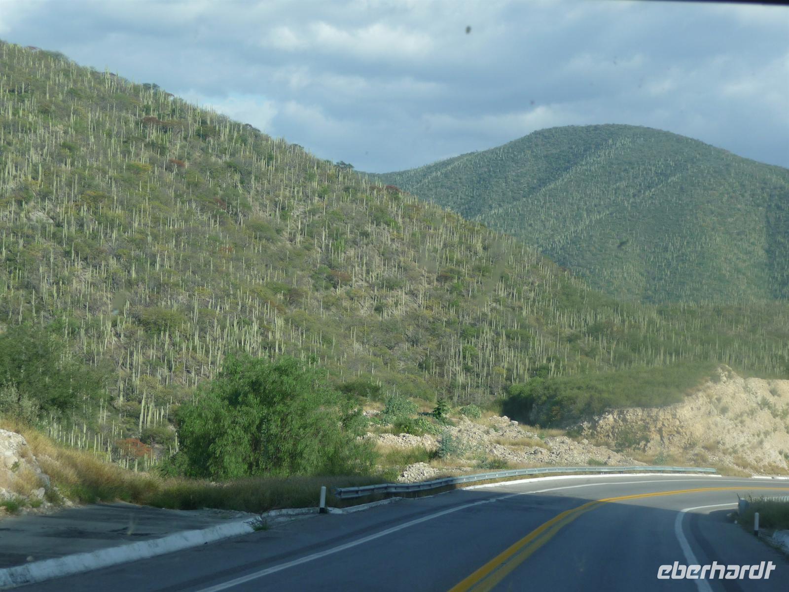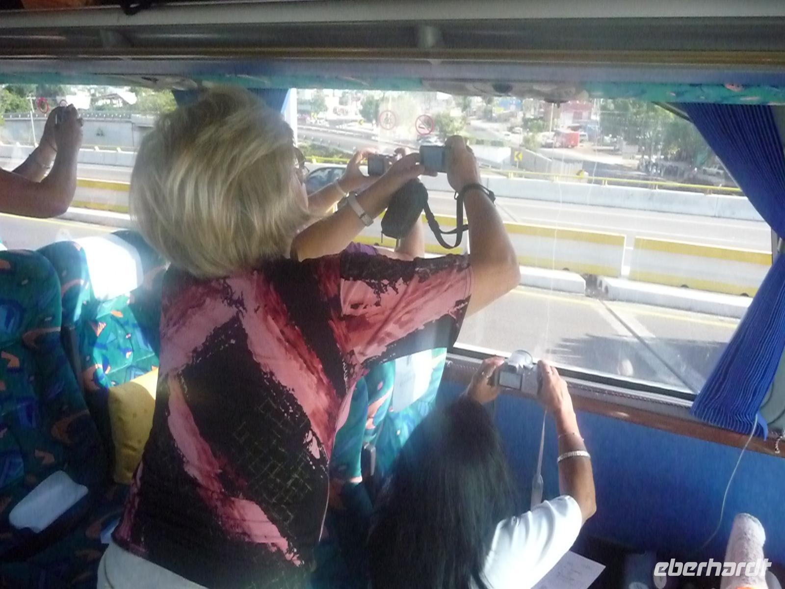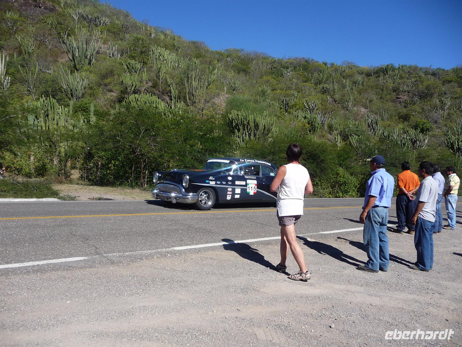 Ja und am Nachmittag stand uns eine lange Fahrt von 250km bevor. Aber es ging durch eine geniale Landschaft inmitten der Sierra Madre und so verging die Zeit dann doch ganz gut. Dann wurden wir von Polizisten gestoppt - eine Art Autorennen findet zur Zeit in Mexiko statt. Das „Panamerikana“ - ein Autorennen von Panama nach Mexiko Stadt auf dem Highway, auf dem wir fuhren. Und so hielten wir schließlich an und beobachteten das Spektakel vom Straßenrand und gönnten uns dabei eine Runde Tequilla aus Plastikbechern - schön war es, auch wenn richtig warm draußen. Um uns herum Kakteen, und die Rennautos waren auch sehr schnell und toll. Dann fuhren wir weiter durchs Gebirge - es war so gewaltig, alles grün und mit vielen Kakteen bewaldet. Und so ging die Fahrt hoch und runter durch die Berge…und schließlich kamen wir abends in Teotihuacan an. Wir bezogen alle unsere Hotelzimmer und aßen noch gemeinsam Abendessen, bevor alle doch ziemlich müde von der langen Busfahrt ins Bett gingen.