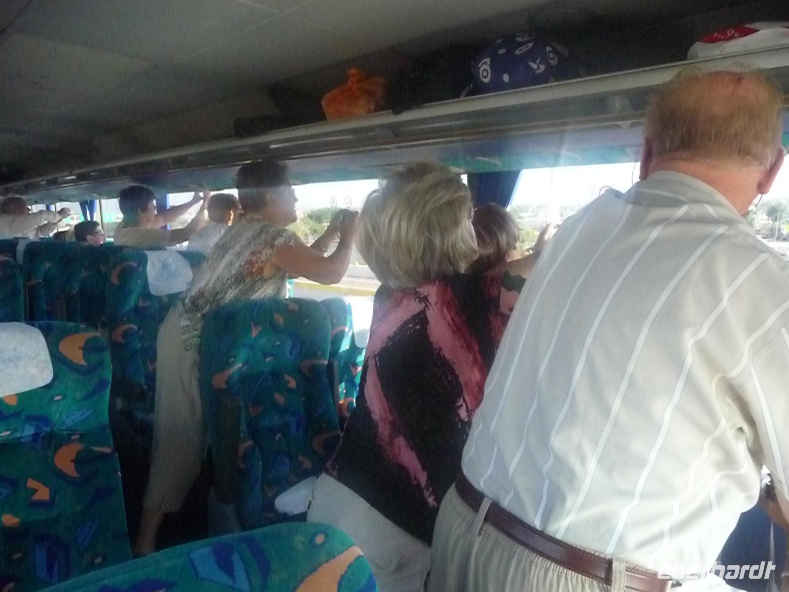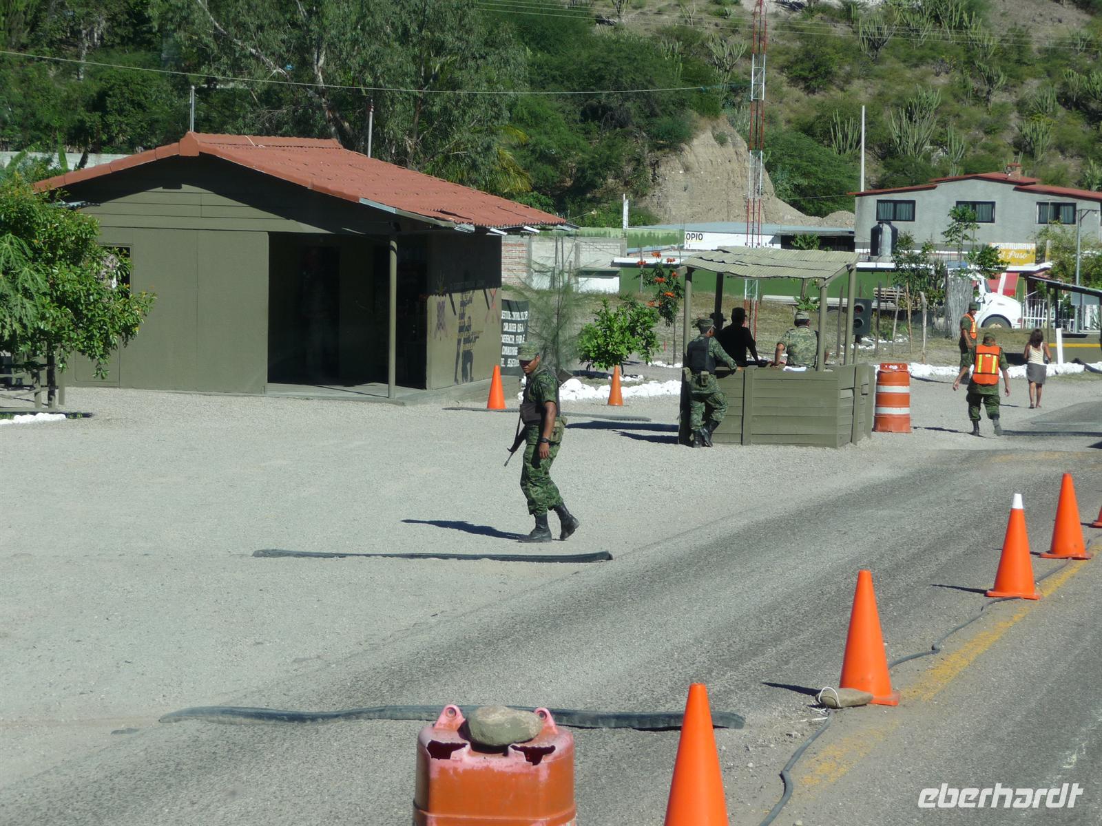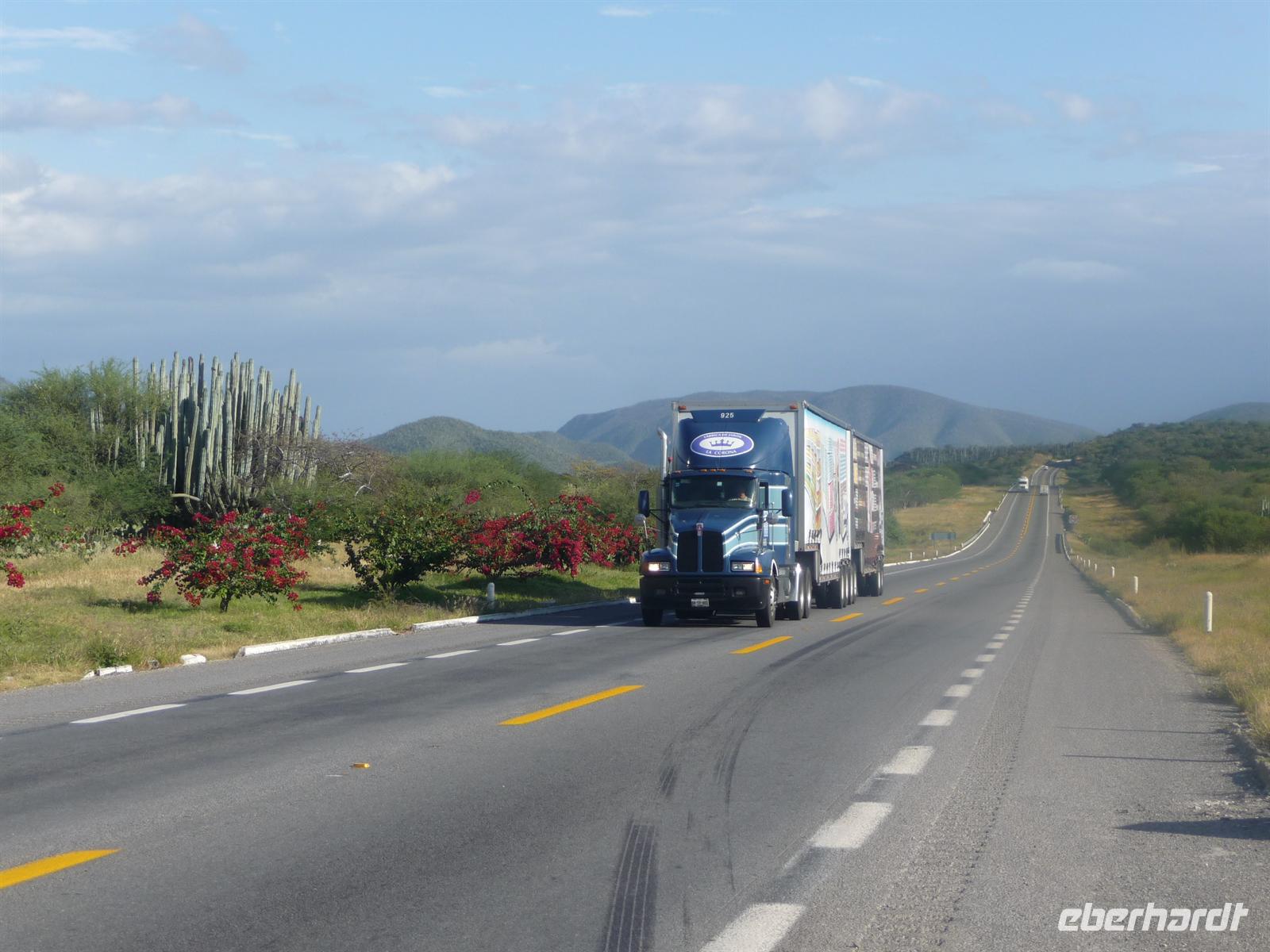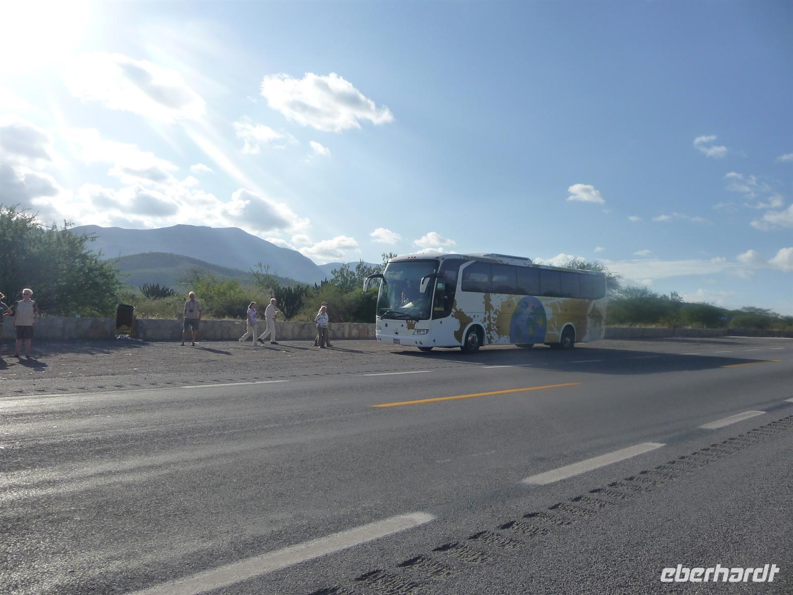 Ja und am Nachmittag stand uns eine lange Fahrt von 250km bevor. Aber es ging durch eine geniale Landschaft inmitten der Sierra Madre und so verging die Zeit dann doch ganz gut. Dann wurden wir von Polizisten gestoppt - eine Art Autorennen findet zur Zeit in Mexiko statt. Das „Panamerikana“ - ein Autorennen von Panama nach Mexiko Stadt auf dem Highway, auf dem wir fuhren. Und so hielten wir schließlich an und beobachteten das Spektakel vom Straßenrand und gönnten uns dabei eine Runde Tequilla aus Plastikbechern - schön war es, auch wenn richtig warm draußen. Um uns herum Kakteen, und die Rennautos waren auch sehr schnell und toll. Dann fuhren wir weiter durchs Gebirge - es war so gewaltig, alles grün und mit vielen Kakteen bewaldet. Und so ging die Fahrt hoch und runter durch die Berge…und schließlich kamen wir abends in Teotihuacan an. Wir bezogen alle unsere Hotelzimmer und aßen noch gemeinsam Abendessen, bevor alle doch ziemlich müde von der langen Busfahrt ins Bett gingen.