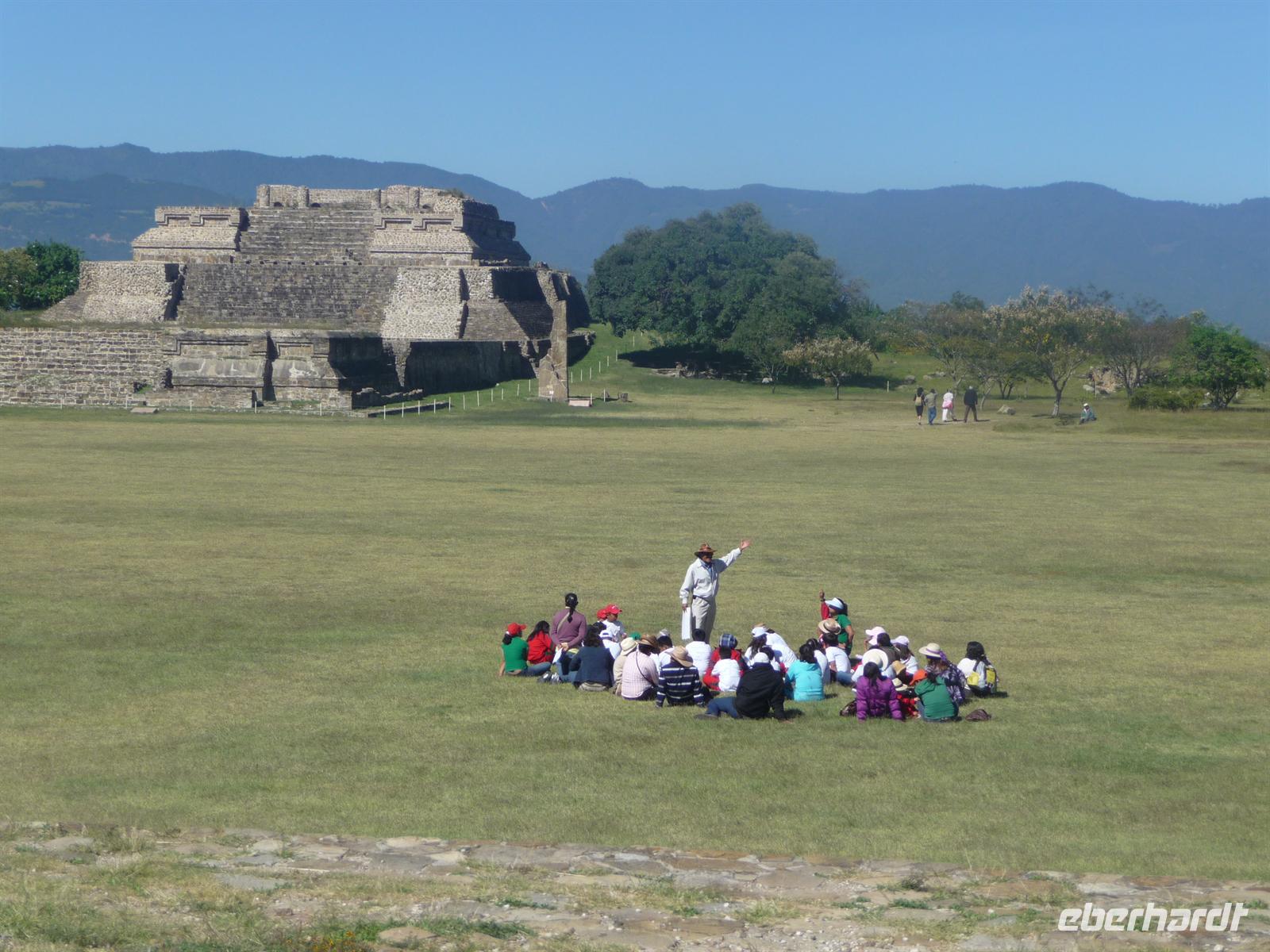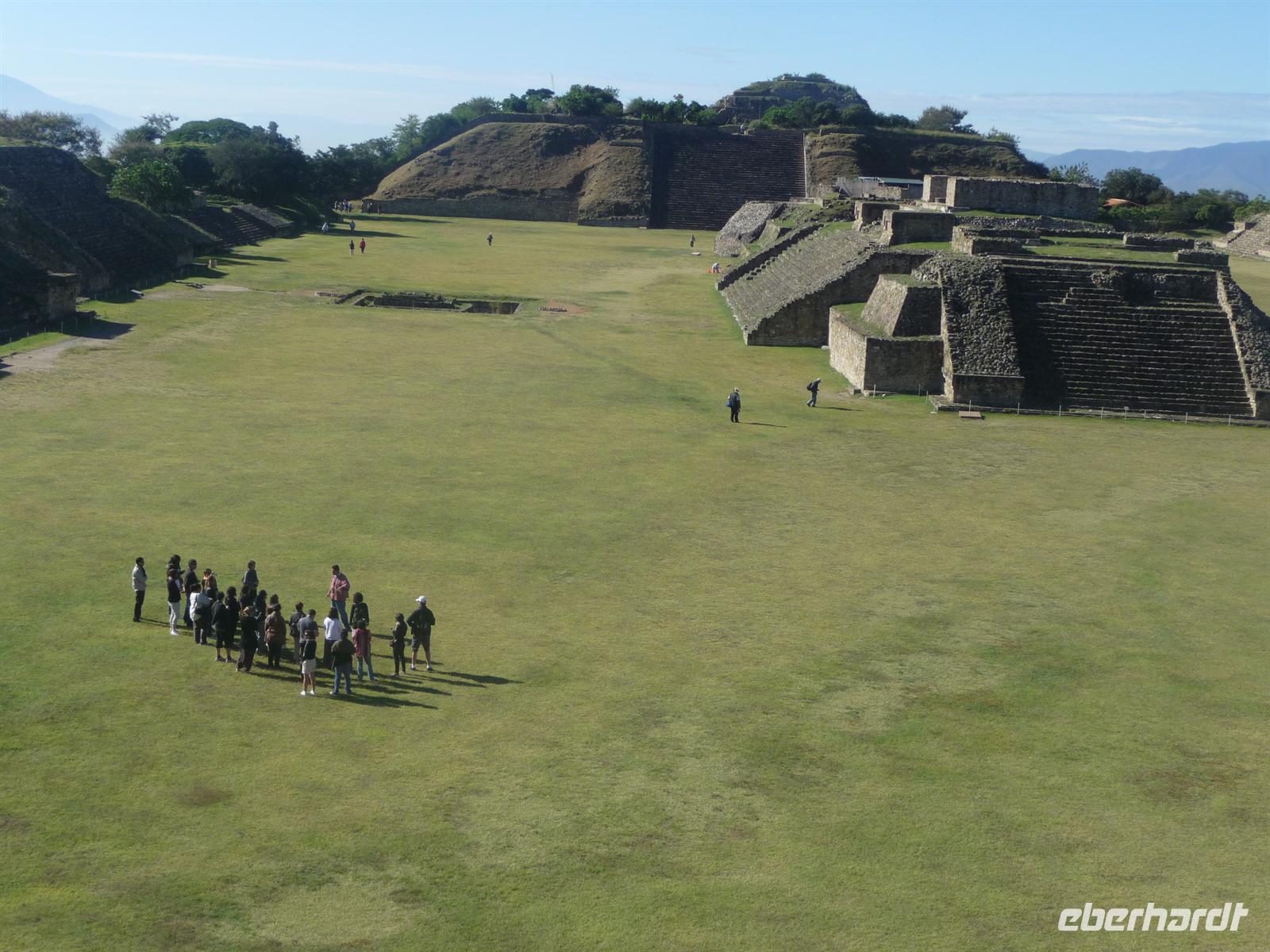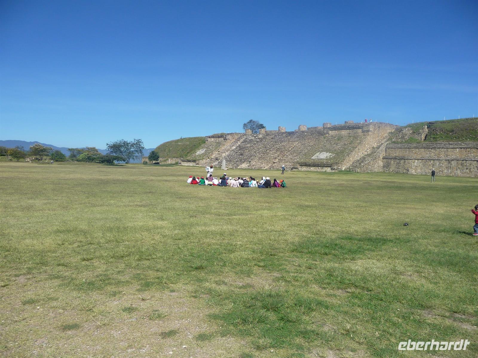 Heute Morgen waren alle schön ausgeschlafen und fit beim Frühstück. Und das Schöne war, wir sollten noch eine Nacht in dem Hotel bleiben und so konnten wir unsere Koffer im Hotel lassen. Es ging los zur Ausgrabungsstätte Monte Alban, gleich außerhalb von Oaxaca. Wir alle haben nicht so etwas erwartet! Auf einem Berg fanden wir eine gigantisch große und richtig beeindruckende alte Ruinenanlage. Es war wirklich toll: Diese überdimensional große Anlage, hoch oben, mit alten Pyramiden in einer tollen Landschaft - wir waren alle begeistert. Einige kletterten noch auf die Pyramide und genossen den Blick von oben, aber uns allen hat es so gut gefallen - traumhaft. Und dann fuhren wir nach Oaxaca zurück, nur 15km und besuchten die Stadt.