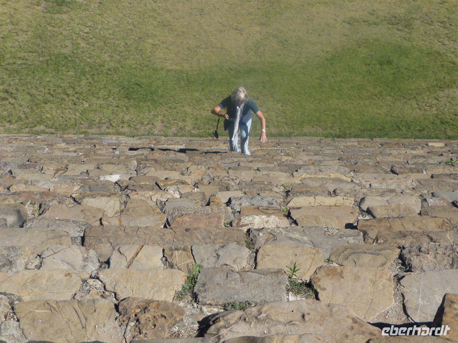 Und das in einem ziemlich großen Gebiet mit vielen weiteren Ruinen. Also die Größe der beiden Pyramiden hat uns wirklich beeindruckt. Und das haben die Menschen vor soooo vielen Jahren mit Hand gebaut, fast unglaublich. Also wir haben uns erstmal vor die Sonnenpyramide gesetzt und Laura hat uns die Geschichte zu diesen Bauwerken erklärt. Wirklich interessant. Und dann sind einige Mutige hoch hinauf auf die Sonnenpyramide „geklettert“, einige haben diese tollen Anlagen von unten entdeckt und bestaunt. Wir alle hatten eine tolle Zeit, viele Fotos gemacht und die vielen Männer gestaunt, die uns ihre verschiedensten Souvenirs verkaufen wollten. Es war alles sehr mexikanisch. Nach einer guten Stunde haben wir uns wieder getroffen, die „Besteiger“ der