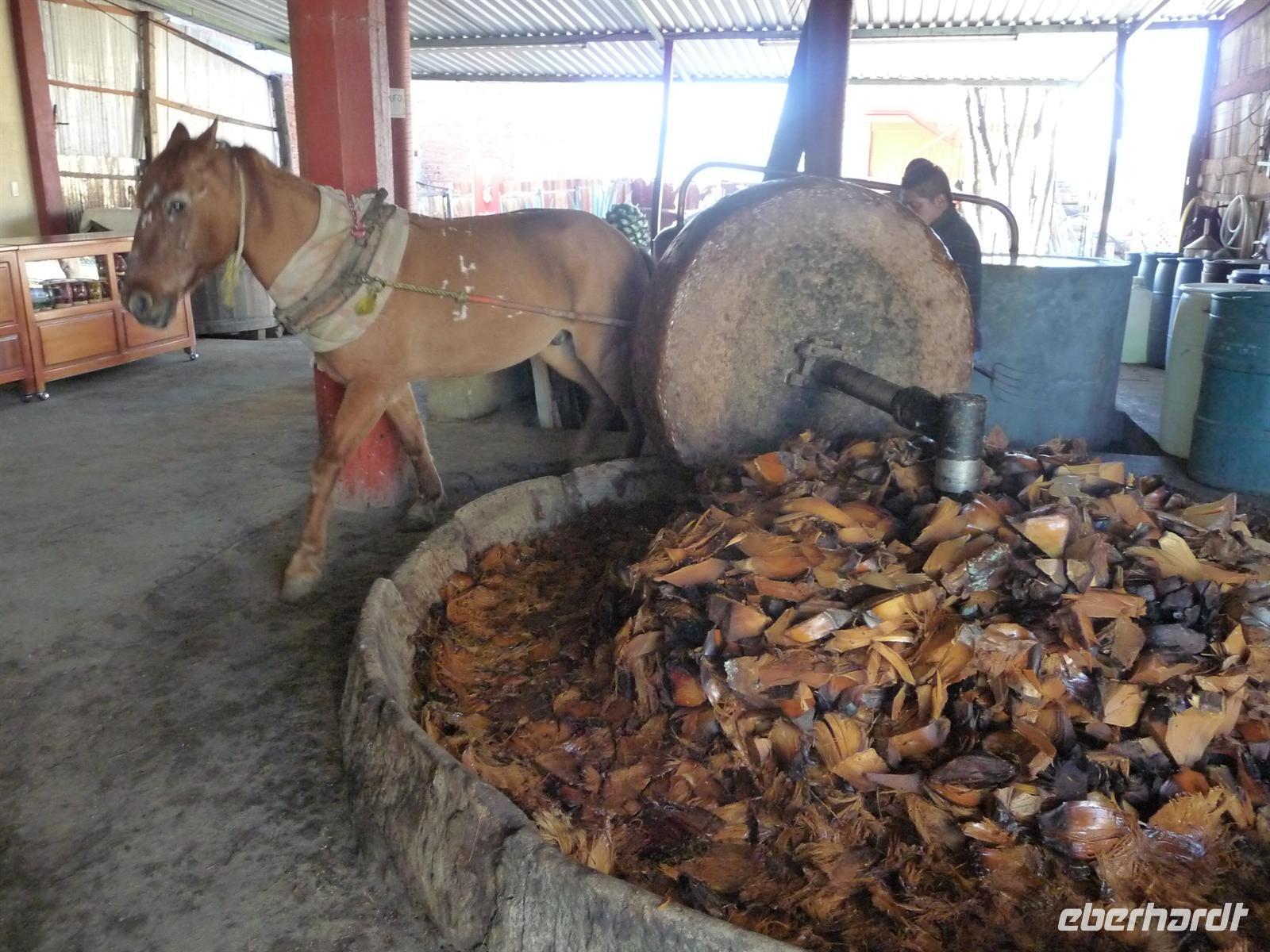 Nun fuhren wir weiter und stoppten bei einer kleinen Mezcal Distilllerie. Und wurde gezeit, wir der typische Agavenschnaps Mezcal hergestellt wird. Man nimmt Agaven und bei einem interessanten Prozess wird dann der Schnaps hergestellt. Dabei muss die Pflanzenmasse verdrückt werden - ein Pferd hat einen schweren Stein im Kreis geschleppt und damit alles zerkleinert. Wir dachten alle das arme Pferd, aber so macht man das nun mal in Mexiko. Und natürlich haben wir ausführlich gekostet. Fruchtige und cremige Liköre, den echten Agavenschnaps - und auch Würmer! Es war sehr lustig und wir haben viele Schnäpschen als kleine Andenken mitgenommen. Weiter ging es in ein altes Weberdorf Toetitlan del Vallee. Wir fanden die kleine Teppichweberei, die wir besuchen wollten erst gar nicht, aber dann fuhren wir über eine unbefestigte Straße und waren auf einmal da! Die Mexikanerin zeigte uns wir sie Schafwolle gewinnt und diese dann mit allerlei Naturmitteln in den tollsten Farben einfärbte. Die Leute in diesem Dorf stellen aus dieser Wolle weltbekannte wunderschöne Teppiche her. Wir fanden die bunten Teppiche richtig schön.