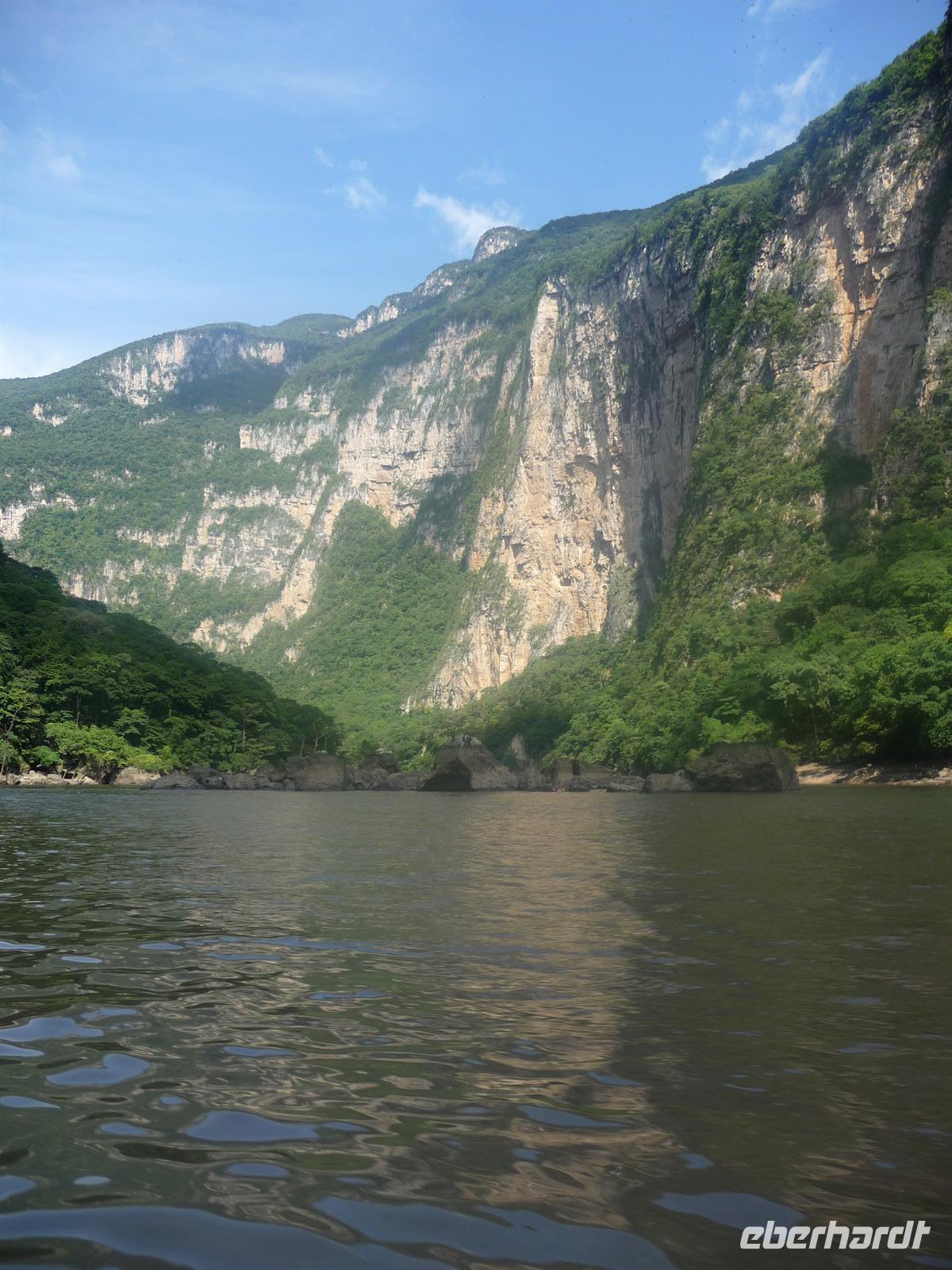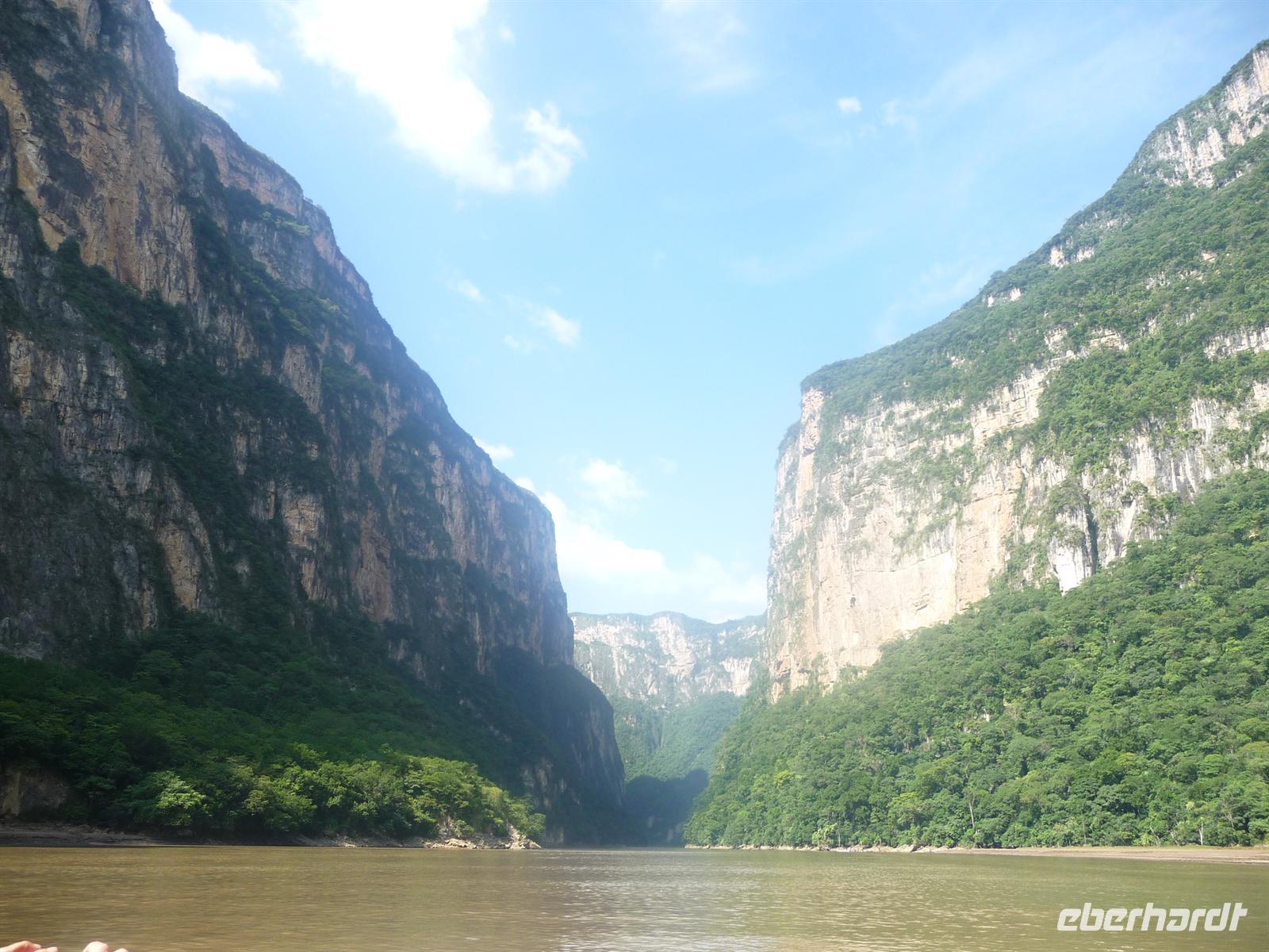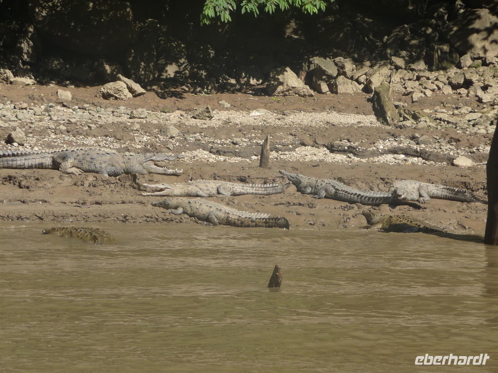 Nach dem Frühstück im Hotel Calli begutachteten wir erstmal die Hotelanlage, denn gestern sind wir spät abends angekommen und es war schon dunkel. Und dann starteten wir pünktlich um 8 Uhr unsere heutige Fahrt. Als erstes stoppten wir in einem Dorf und deckten uns wieder mal mit Wasser ein, bei den Temperaturen auch dringend notwendig. Die Busfahrten waren für uns sehr interessant, denn es gab links und rechts so viel zu sehen - tolle Landschaften, Kinder am Straßenrand und viele kleine Dörfer. Mittags sind wir schließlich in Chiapa de Corzo angekommen, wo wir am Dorfplatz ausstiegen und zu einem Restaurant liefen, wo unser Mittagessen auf uns wartete. Hier sollten wir eigentlich Buffet bekommen, jedoch wurde uns Essen serviert. Es gab auch Live-Musik und das Essen war auch gut, aber hier war es das erste Mal dass es uns irgendwie nicht so gut gefallen hat. Der Service war nicht so toll wie wir es von andern Lokalen in Mexiko nun schon gewöhnt waren. Aber gut, das Essen war lecker… Dafür wurde der Nachmittag um so besser, denn wir begaben uns alle auf ein besonderes Abenteuer. Eine Schnellboot-Fahrt in der Sumidero Schlucht in Chiapa de Corzo. Wir wurden von kleinen Tranfer-Fahrzeugen vom Dorfplatz abgeholt und zum kleinen Hafen chauffiert. Und dann gings los: Schwimmwesten an und ab ins Boot. Es war ein ganz normales Schnellboot, welches wir nur für uns hatten. Wir fuhren los, ab in die Schlucht, Es war ganz schön schnell, und daher auch echt windig - aber ein warmer Wind. Wir fuhren auf „Schokoladenwasser“ wie es Laura nannte - das braune Wasser des Flusses. Aber es war traumhaft schön, wahnsinnig hohe Klippen, bewachsen mit Bäumen und Sträuchern und viele Flussbetten. Apropo Flussbetten: dort machten es sich welche bequem!!! KROKODIELE, KROKODIELE, KROKODIELE. Wir haben ja schon damit gerechnet, diese Kreaturen zu treffen. Aber so viele. Wir haben 12 von den eindrucksvollen Urzeit-Tieren gesehen und sind ganz nahe rangefahren. Und ein ganz großes war auch dabei, viele kleine und mittlere. Einer unserer Gäste sagte: sind die echt? Ja und dann sahen wir den Beweis: Einige bewegten sich, krochen ins Wasser und verschwanden in dem brauen Wasser, einige rissen ihr Maul auf und andere kamen aus dem Wasser an Land. Es war für uns alle ein Erlebnis. Dann ging es weiter durch die Schlucht, vorbei an wunderschönen Landschaften zu einem Wasserfall, unter den wir fast drunter gefahren sind und vom Wassernebel erfrischt wurden. Nun ging es zurück durch die Schlucht, zurück in die Sonne und noch mal vorbei an den Kroks!