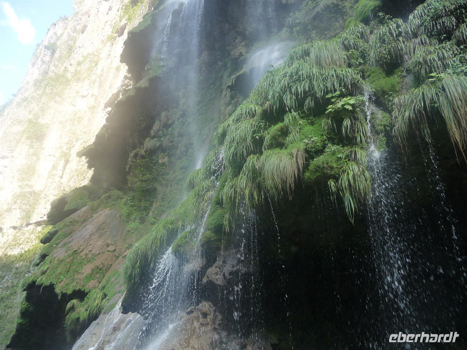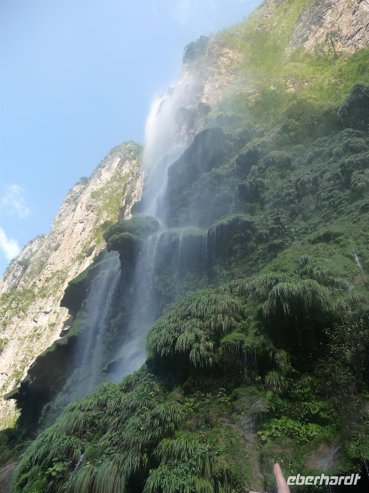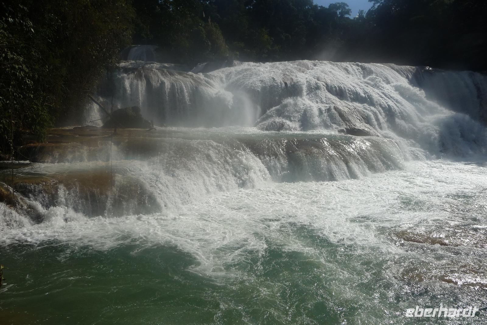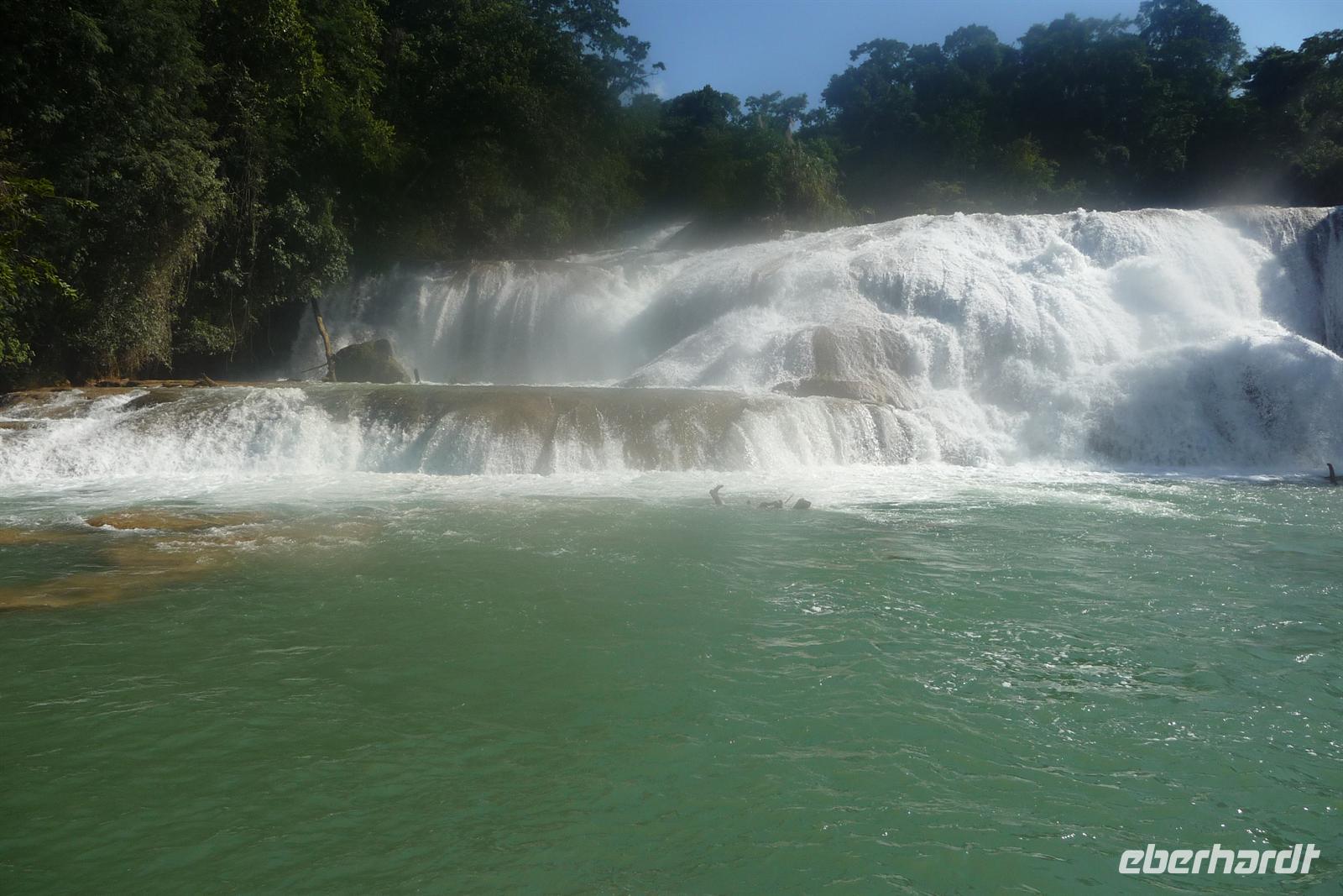 Hotel, holten unser Handgepäck aus den Zimmern und liefen zum Bus. Zwei Gäste sind mit dem Taxi gefahren, da sich einer der beiden leider nicht so gesund fühlte. Die haben haben auch ein Abenteuer mitgemacht, denn der Taxifahrer wusste nicht wo der Bus steht. Nach einem Kreuz und Quer durch die Stadt haben sie Gott sei Dank den Bus gefunden und warteten schon auf uns. Und so fuhren wir weiter durch die Sierra Richtung Agua Azul - den „Wasserfällen des blauen Wassers“, die sich über eine Distanz von 6km erstrecken. Auf dem Weg dorthin stoppten wir an einem kleinen Lokal, wo es leckeren Kaffee aus der Gegend zu kaufen gab. Die meisten kauften sich den Kaffee, um ihn zuhause zu kochen und zu genießen. Außerdem gab es leckere Macademia Nüsse, welche wir probierten. Mmmhhh lecker.