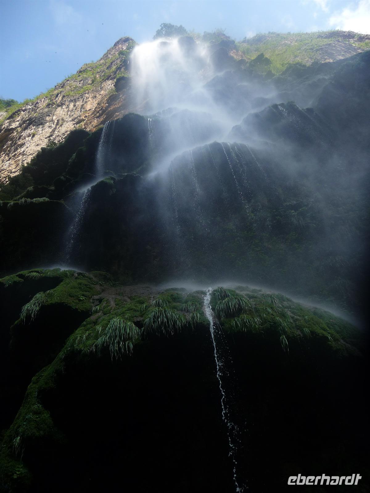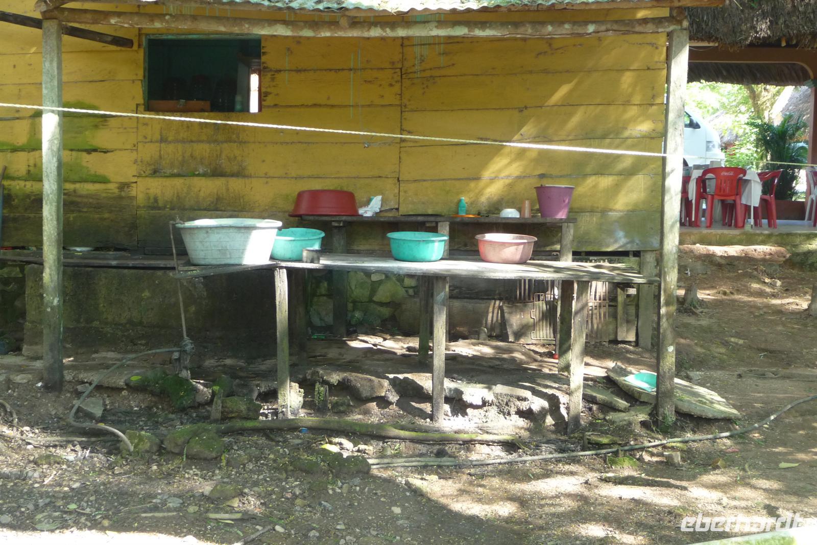 Nun ging es weiter zu den Wasserfällen, vorbei an kleinen Dörfern an der Bergstraße mit verschieden Trachten, die die Frauen auch alle trugen und wir es vom Bus aus bestaunen konnten. Die Leute leben in diesen Dörfern oft noch in Holzhütten, und wir konnten oft Kinder vor den Hütten spielen sehen, Frauen durchs Dorf laufen und Männer unter den Palmen sitzend sehen. Aber diese Leute sind auch sehr fleißig, denn überall haben sie viele kleine Läden in ihren Hütten und verkaufen Essen und Trinken an Vorbeireisende. Nun sind wir aber an den Wasserfällen angekommen, dort aßen wir erstmal unter einem Palmendach leckeren Fisch zum Mittag, bevor wir an den wunderschönen Wasserfällen entlang spazierten. Der Wasserfall hatte durch die Regenzeit so viel Wasser, dass dieses Naturschauspiel wirklich beeindruckend war. Wir machten viele Fotos vom der tollen Farbe des Wassers, wenn es die Steine runter fließt.