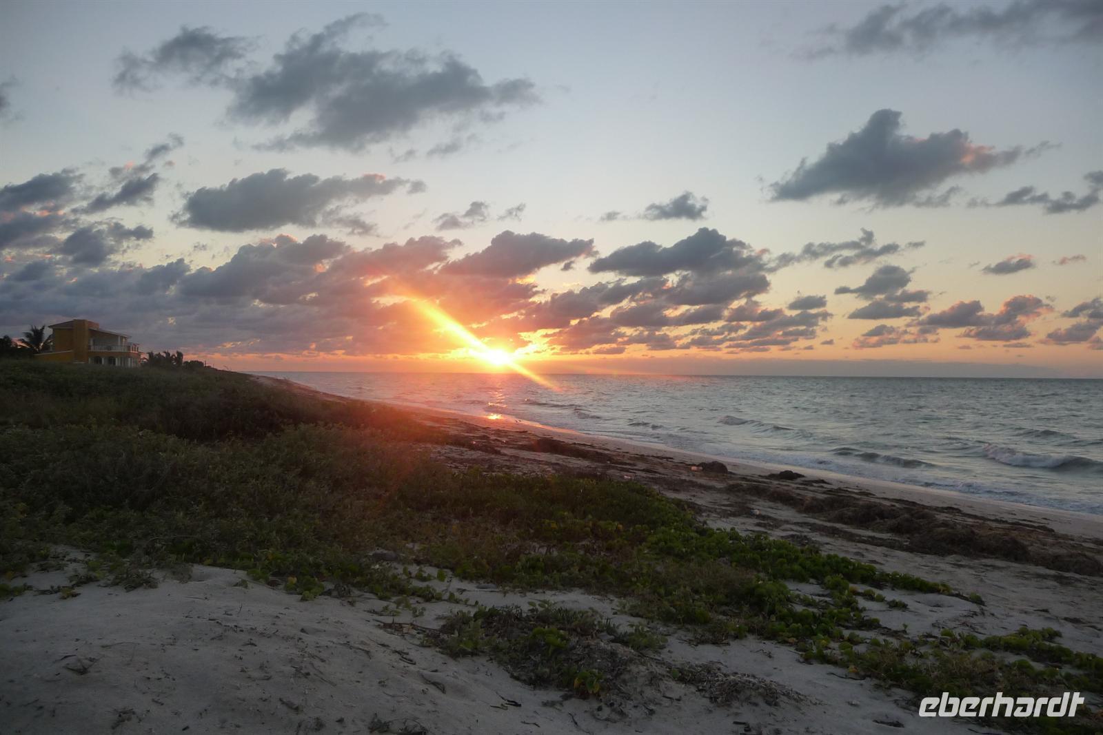 Nun fuhren wir am Mittag noch mal in unser Hotel und konnten uns im Pool oder Dusche erfrischen, denn im Urwald kamen einige ins Schwitzen! Es erwartete uns noch ein leckeres Mittagessen bevor wir uns auf den langen Weg nach Campeche machten. Es lagen 6 Stunden Busfahrt vor uns - jedoch haben wir die Berge verlassen und nun ging es immer geradeaus, fast ohne Kurven. Aber frisch geduscht und gestärkt vom Mittagsbuffet war die Fahrt nicht schlimm - im Gegenteil, mit dem einem oder anderen leckeren Agavenschnäpschen hatten wir Spaß im Bus. Und endlich: wir erreichten den Golf von Mexiko und sahen das endlose Meer!!! Die Straße ging dann für den letzten langen Rest der Fahrt entlang des Strandes - Palmen, weißer Sand und kleine Hütten oder endloser Strand. Als es Zeit für den Sonnenuntergang war, stoppten wir und machten wunderschöne Fotos von der untergehenden Sonne über dem Wasser. Das Wasser war übrigens sehr warm, wir haben es mit unseren Füßen getestet.