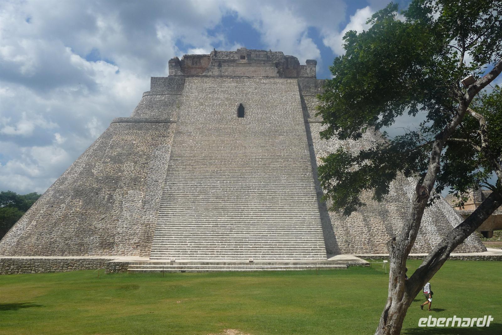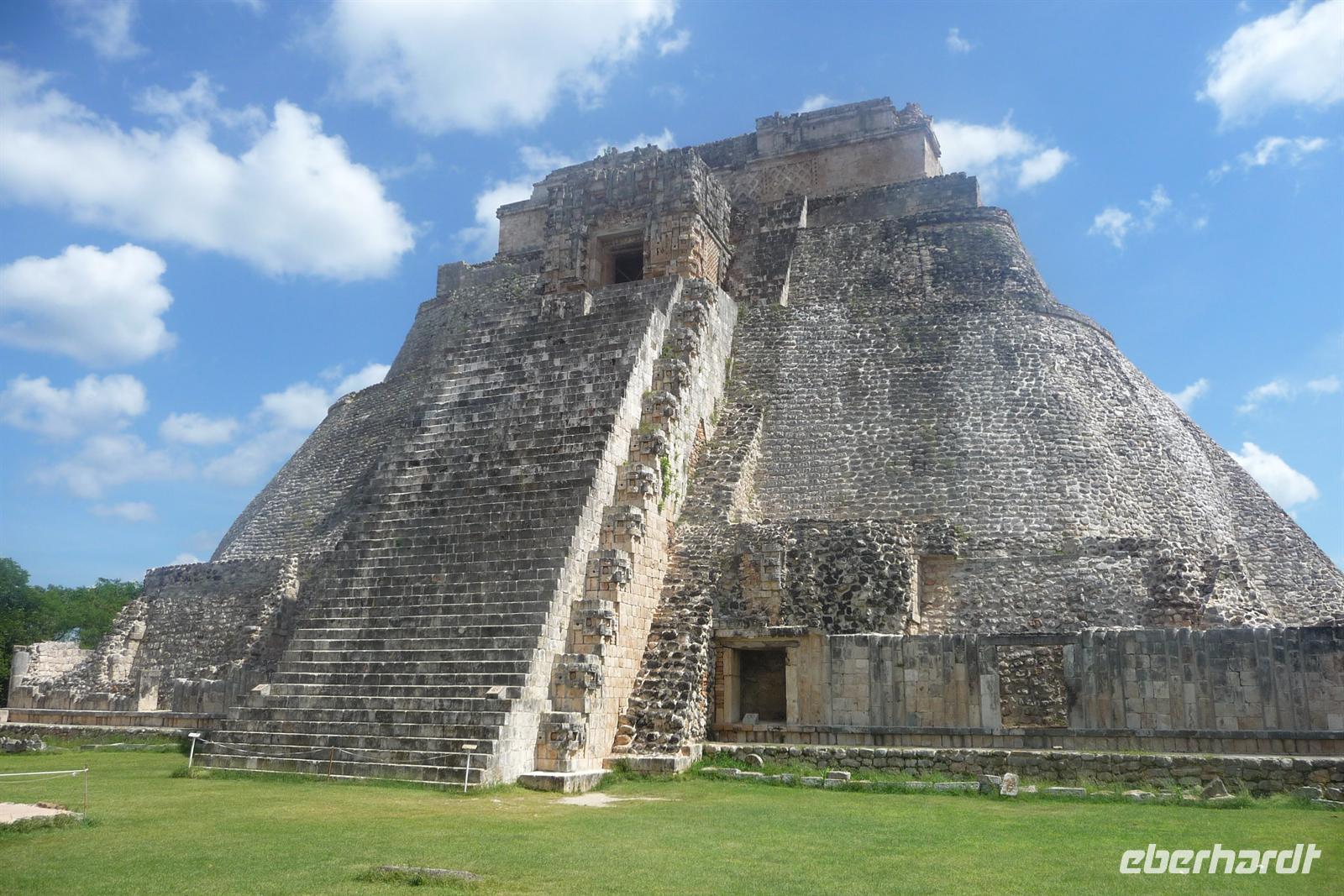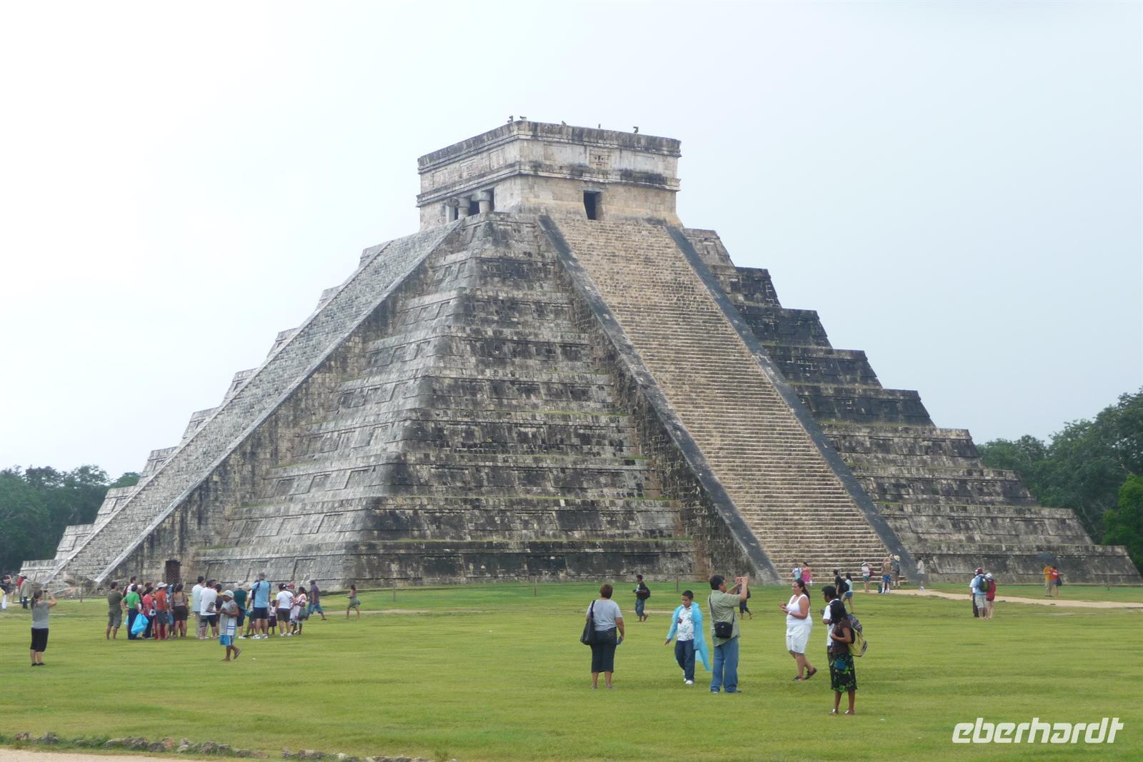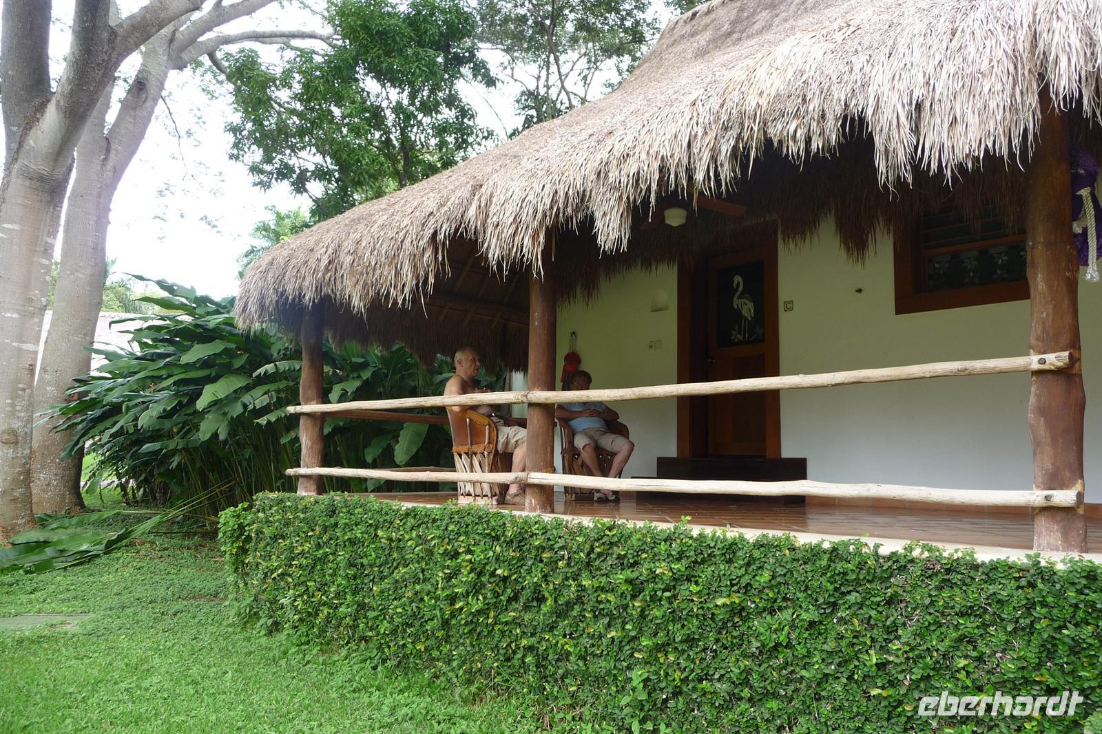 Wir genossen ein tolles Frühstück im Hotel und fuhren dann los in Richtung Chichen Itza, zu dem Höhepunkt von vielen auf der Reise. Wir blieben erst auf dem Highway, verließen ihn jedoch dann und fuhren erstmal zu einem kleinen Mayafriedhof, welcher uns mit seinen bunten und fröhlichen Grabbemalungen erfreute. Dann fuhren wir weiter in ein Mayadorf, wo wir auf dem Zocolo eine Runde bummeln gingen, und dann wieder einmal leckere Bananen vom Markt verspeisten. Schließlich kamen wir in Chichen Itza an, nachdem wir kleine Straßen mit üppiger Vegetation an den Straßenrändern befahren haben. Bevor wir die weitläufigen Ruinenanlagen besuchen sollten, genossen die meisten von uns noch ein Buffet mit Maya-Livemusik in einer tollen Restaurant-Anlage. Einige spazierten in der Zeit durchs Dorf. Schließlich waren wir da: in Chichen Itza - genau wie hunderte weitere Touristen und Einheimische. Gott sei Dank ist eine sehr weitläufige Anlage, so dass sich die Touristenströme verliefen. Wir waren auf ein neues überwältigt von der gewaltigen Anlage, die die Maya erschaffen haben. Aber dann: ohh nein, dicke Regenwolken zogen über uns her. Aber das war auch kein Wunder, denn wir wussten schon seit 2 Tagen dass ein starker Hurrikan nach Mexiko kommen wird. Wir waren diesbezüglich auch im ständigen Kontakt mit Eberhardt TRAVEL in Deutschland und beobachteten den Verlauf des Hurrikans. Und dann öffnete sich der Himmel und es goss wie aus Kannen. Aber unsere tolle Gruppe war ja einfallsreich und baute sich aus Styroporplatten, Planen oder Spannplatten „Unterschlüpfe“, um nicht komplett im Regen zu stehen. So wurde es wenigstens noch lustig und wir konnten über uns selber lächeln, wie wir da neben der Pyramide unter den selbst gebauten Häusern standen. Dann zogen die Wolken weg und machten uns bald auf den Weg ins Hotel, denn die nächsten Wolken kamen schon. Wir liefen nur 10min, schon waren wir da. Und dann ging es weiter - wirklich starke Regenfälle kamen nun runter. So kamen alle durchgeweicht in ihren „karibischen“ Mayabungalows an und waren erstmal froh, ein Dach über dem Kopf zu haben - auch wenn es aus Palmenblättern gebaut war, hielt es uns in den tollen Bungalows trocken.