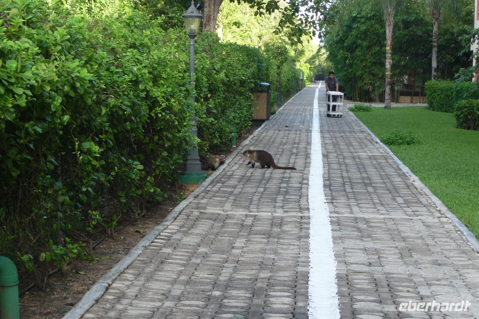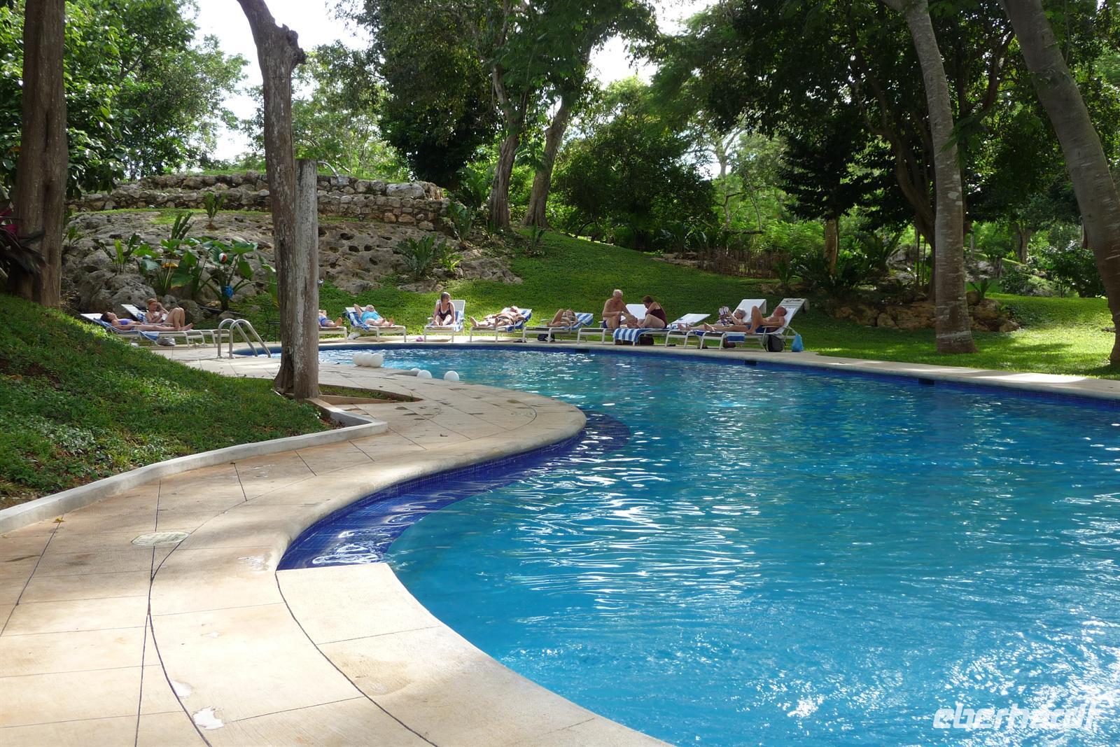 Alle waren beim Frühstück gespannt auf die Neuigkeiten wegen des Hurrikans Rina: und es gab auch Neuigkeiten. Und zwar blieben wir heute für eine weitere Nacht hier im Bungalowresort, weil es am Strand zu gefährlich zuging. Der Hurrikan sollte zwar von Stufe 3 auf Stufe 1 abschwächen, jedoch sollten heute Nachmittag sinnflutartige Regengüsse und hohe Wellen mit dem Auge des Hurrikans auf die Play del Carmen treffen. Und so genossen wir lieber noch einen weiteren Tag in dieser tollen Anlage, anstatt in den hurrikansicheren Betonhäusern des Hotels am Strand untergebracht zu werden und so den Hurrikan zu überdauern. Viele der Gäste besuchten noch mal die Ruinenanlage, nachdem es gestern im Schnelldurchgang doch etwas knapp für viele Fotos wurde. Andere verbrachten Zeit am Pool - alles in allem hatten wir einen schönen sonnigen Tag und merkten von den Stürmen an der 250km entfernten Küste überhaupt nichts. Eberhardt TRAVEL lud alle Gäste zu einem Mittagsbuffet ein und am Nachmittag sah ich viele Gäste am Pool entspannen oder mit unserem Maskottchen, dem „Delfin“ im Wasser planschen.