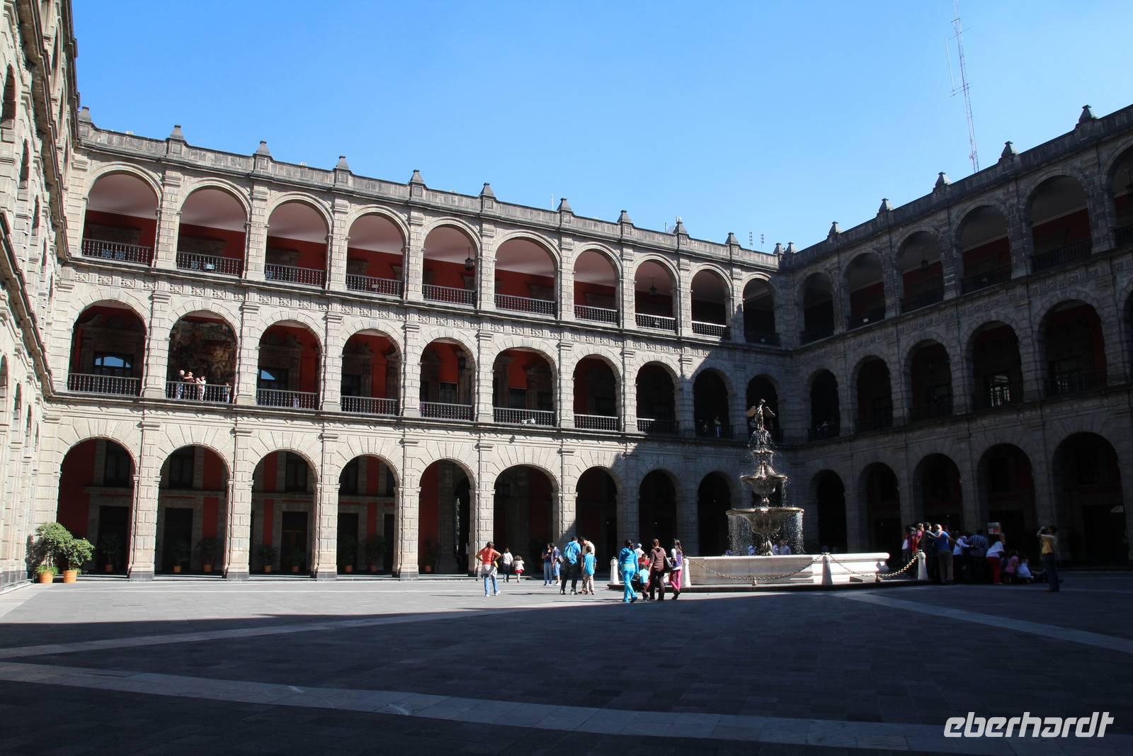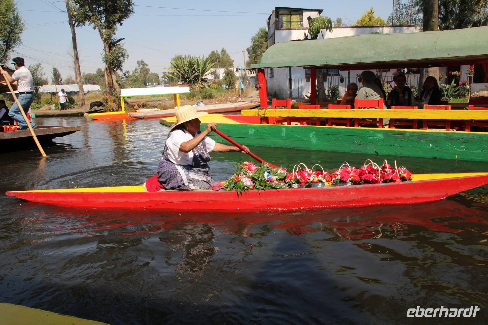 Nachdem der Kopf gesättigt war, sollten nun auch die Mägen mit den ersten mexikanischen Genüssen gesättigt werden. Dazu fuhren wir nach Xochimilco, wo wir auf Booten durch die Kanäle der „Schwimmenden Gärten" schipperten. Aufgrund des Sonntags waren auch viele Familien unterwegs, so dass es zwar recht voll war, aber wir auch eine angenehme Stimmung einfangen konnten. Am Nachmittag ging es dann noch zum Zócalo, wo wir den Nationalpalast und die Kathedrale besichtigten.