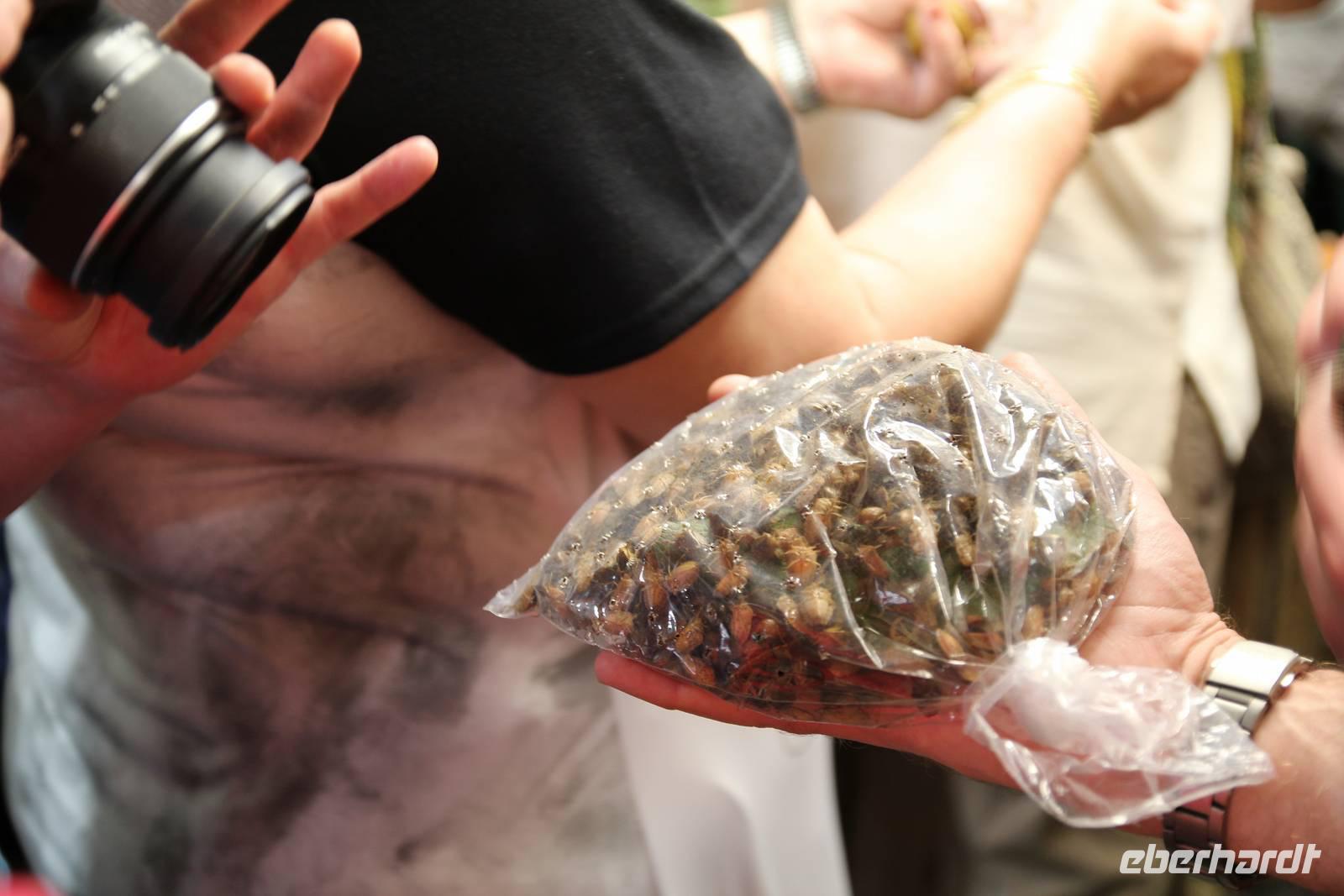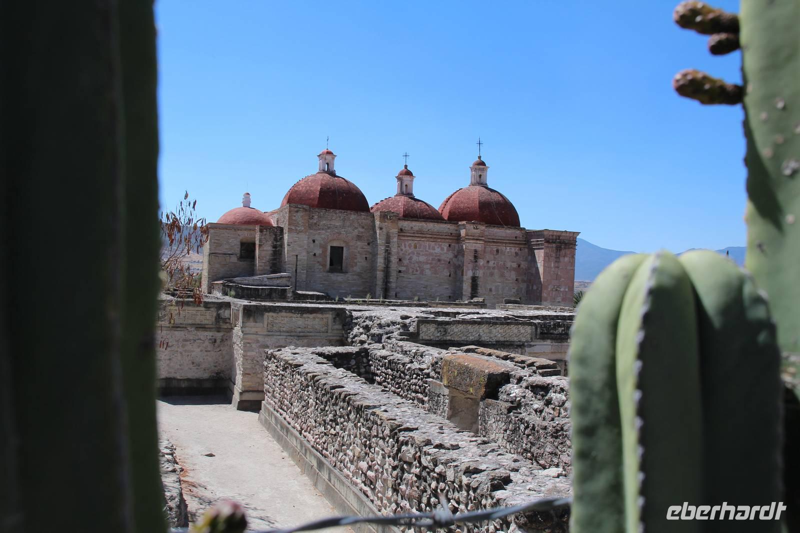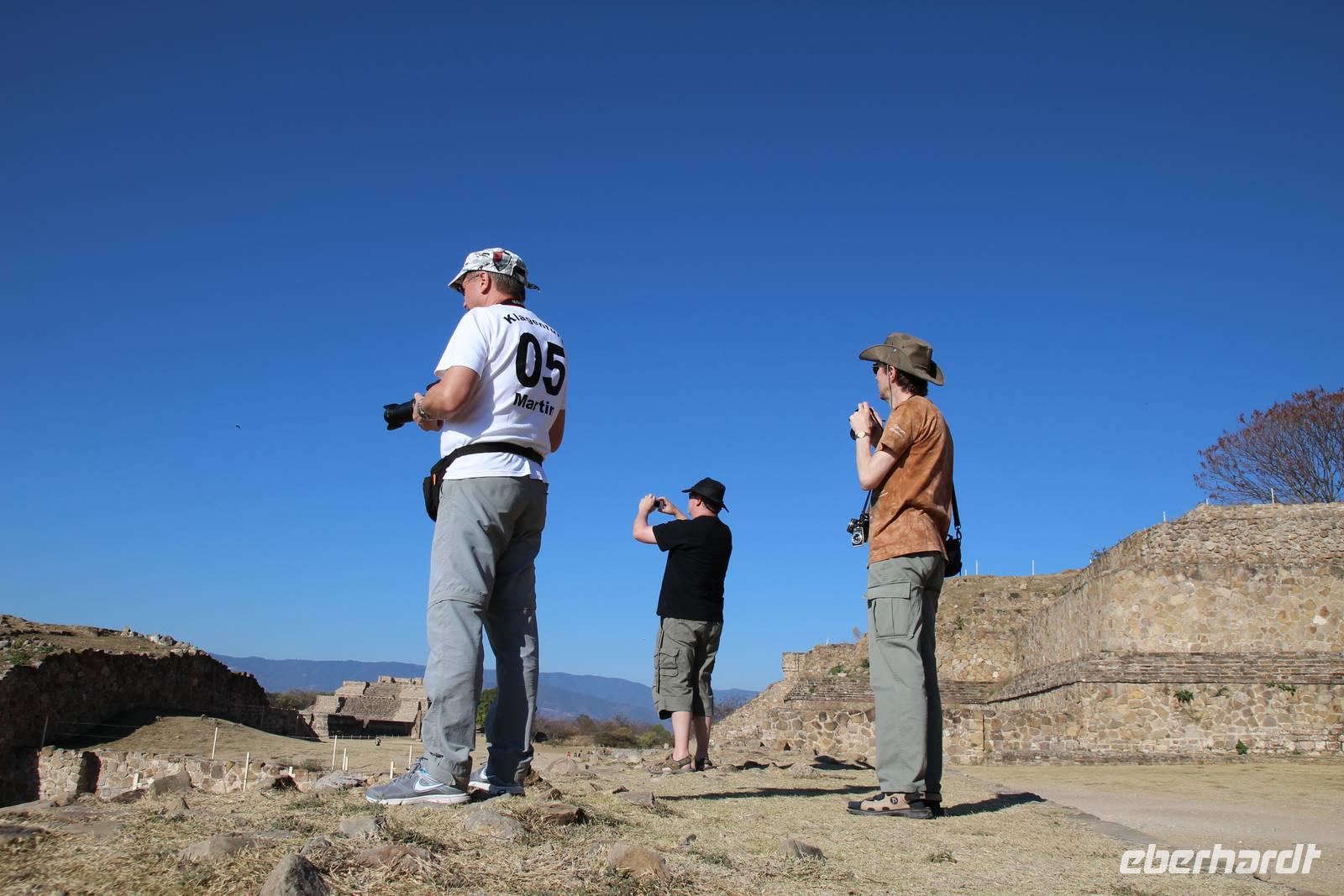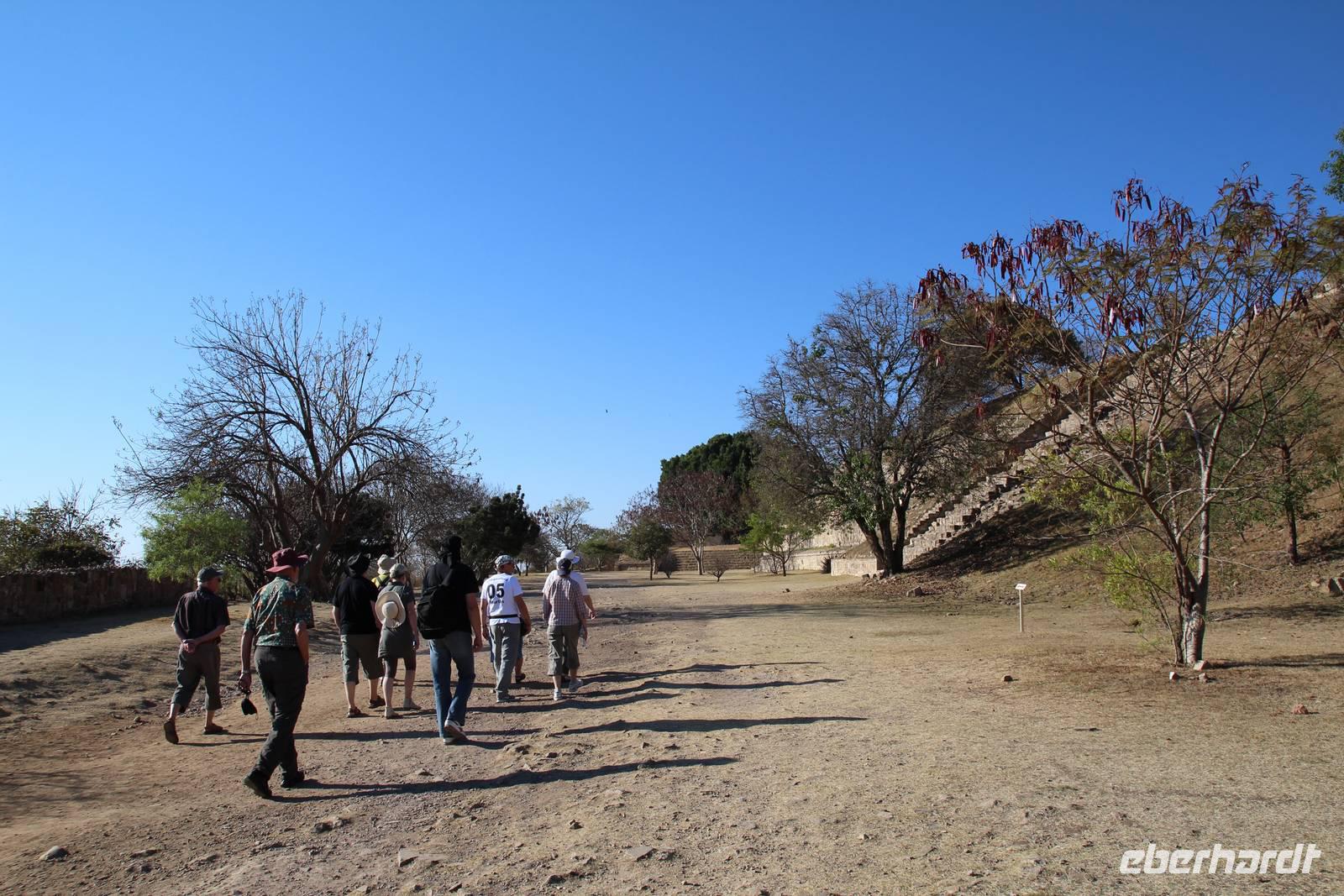 Auf der Weiterfahrt nach Mitla stoppten wir an einer Teppichweberei, wo wir das Handwerk miterleben konnten. In Mitla angekommen erkundeten wir die dortigen Ruinen der ehemaligen Palaststadt, anschließend hatten wir Zeit, auf eigene Faust über den Markt zu schlendern. Als kleine Mittagsüberraschung gab es einen kleinen Snack von Eberhardt - wir mussten ja alle etwas im Magen haben, denn nun ging es zur Mezcal-Verkostung nach Santiago Matatlán. Mezcal unterschiedlichen Alters oder auch als Likör konnten wir hier ausgiebig probieren und natürlich wurden die am besten schmeckenden Sorten für daheim mitgenommen.