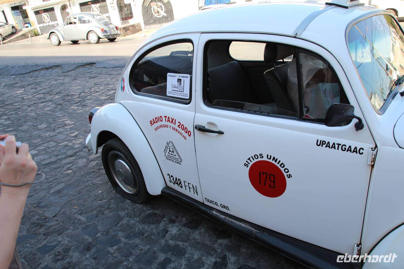 Kurz vor dem als Silberstadt bekannten Taxco ein kurzer Halt und ein erster Blick auf die Stadt, bevor wir dann im unteren Stadtgebiete aus dem Bus aussteigen mussten. Denn bis zum Zócalo würden wir mit dem Bus nicht kommen, die Gassen hinauf sind schmal und verwinkelt. Hier wurde uns bei einer leckeren Magarita erklärt, auf was wir beim Silberkauf achten müssen. Als Alternativen für den folgenden Weg standen uns die eigenen Füße oder die Käfertaxis zur Verfügung. Wir entschieden uns für ersteres und Ruth konnte uns so auf dem Weg zur Kathedrale noch so manches erklären. Nach deren Besichtigung noch ein erlebnisreicher Gang über den Markt, bevor unsere Mittagspause eingeläutet wurde. Nach dieser ließen wir uns das Käfererlebnis natürlich nicht entgehen. Zu zweit oder dritt ging es mit diesen wieder hinab zum Bus, welch ein Spaß.