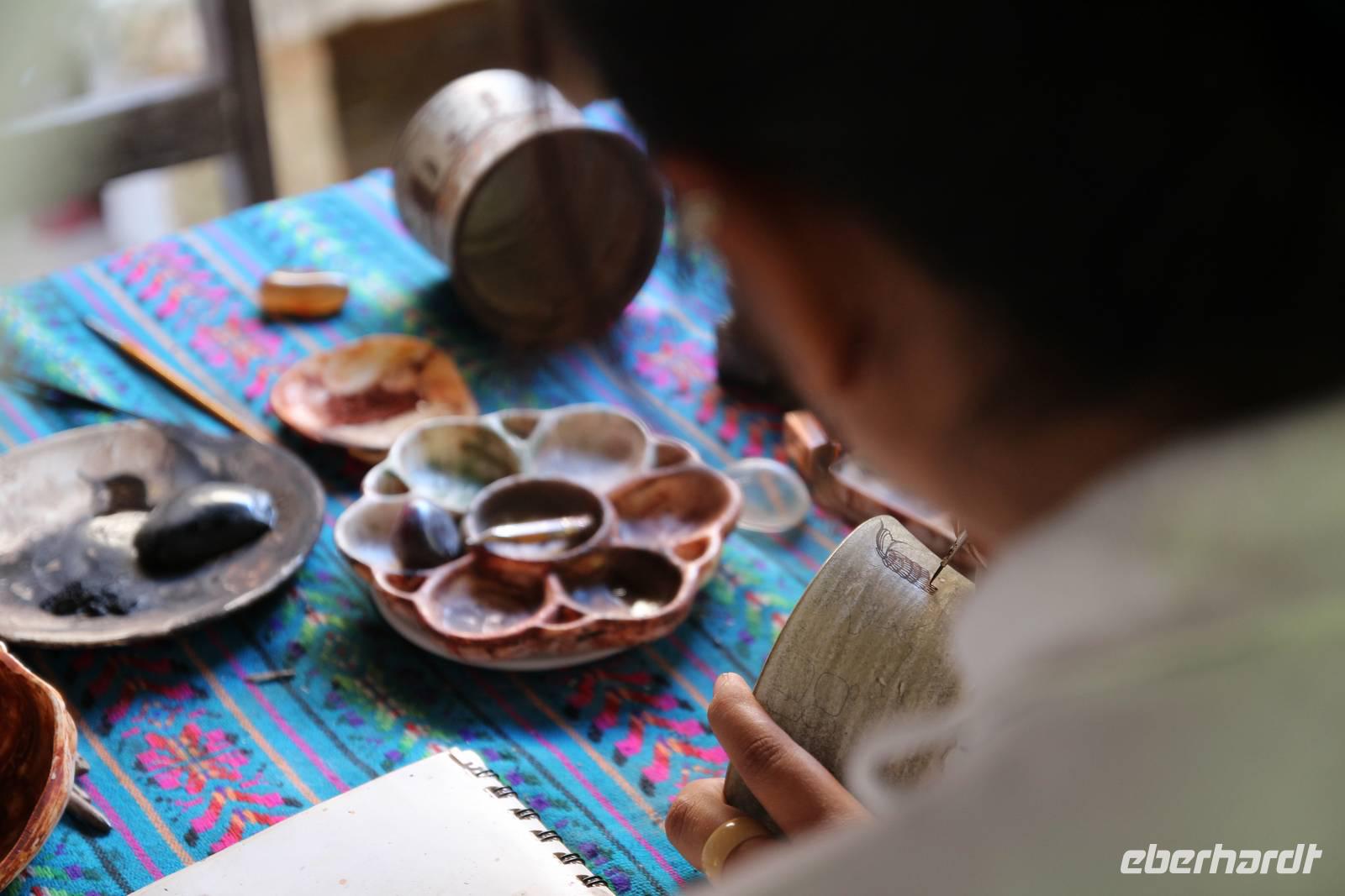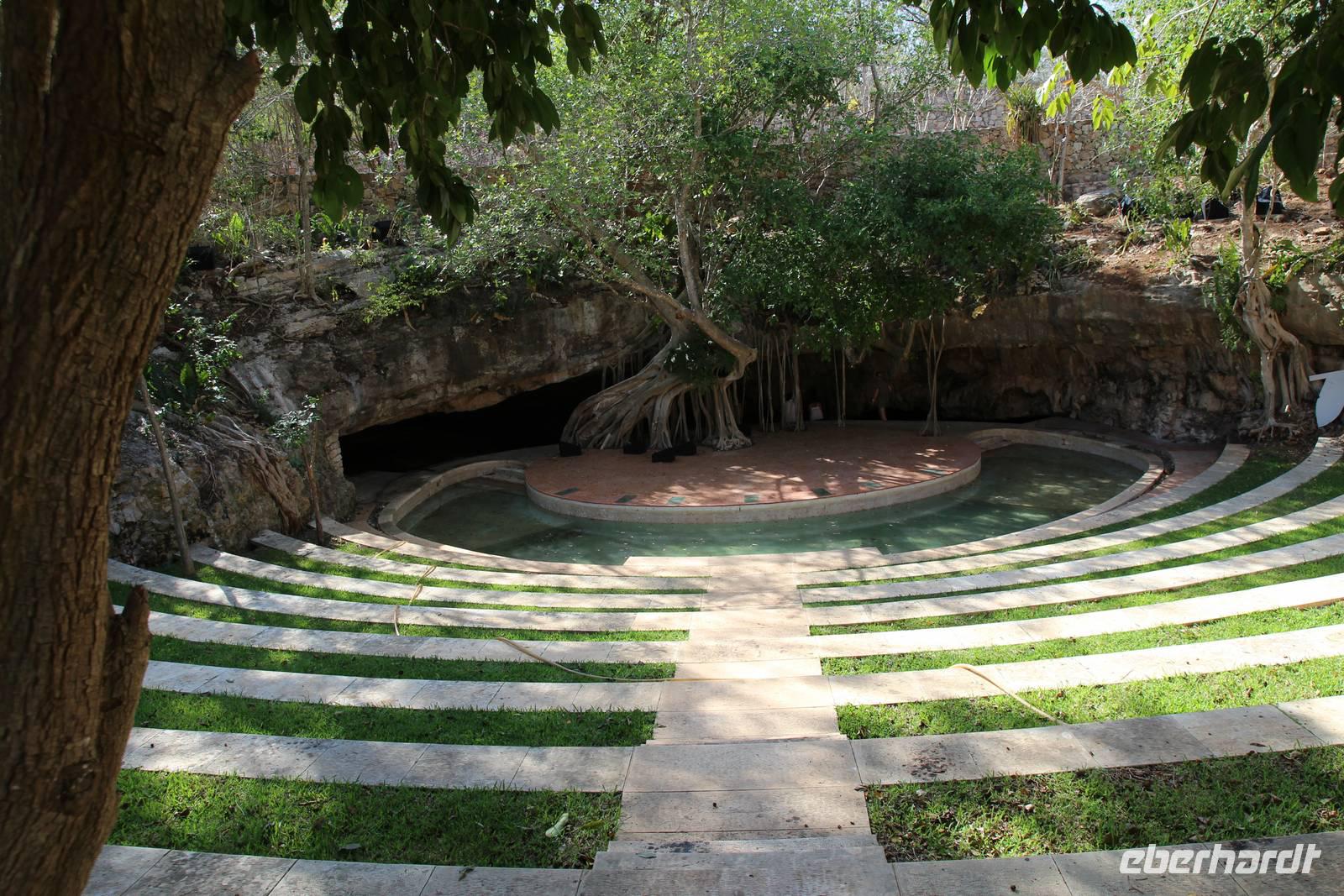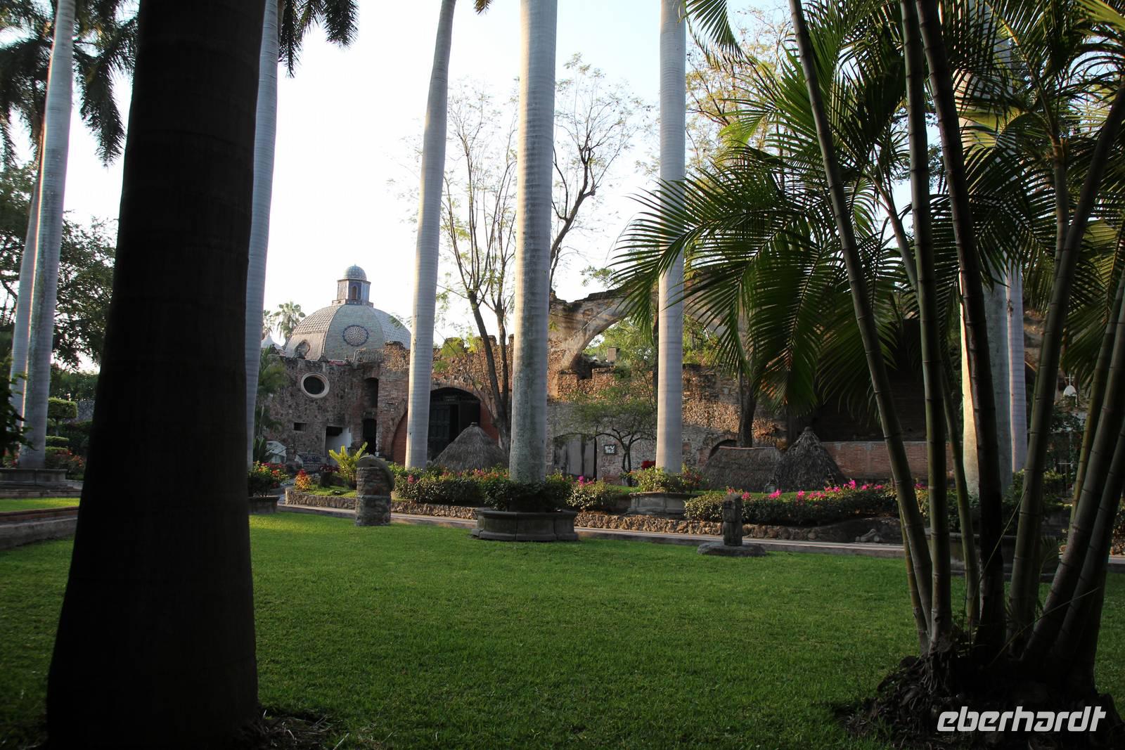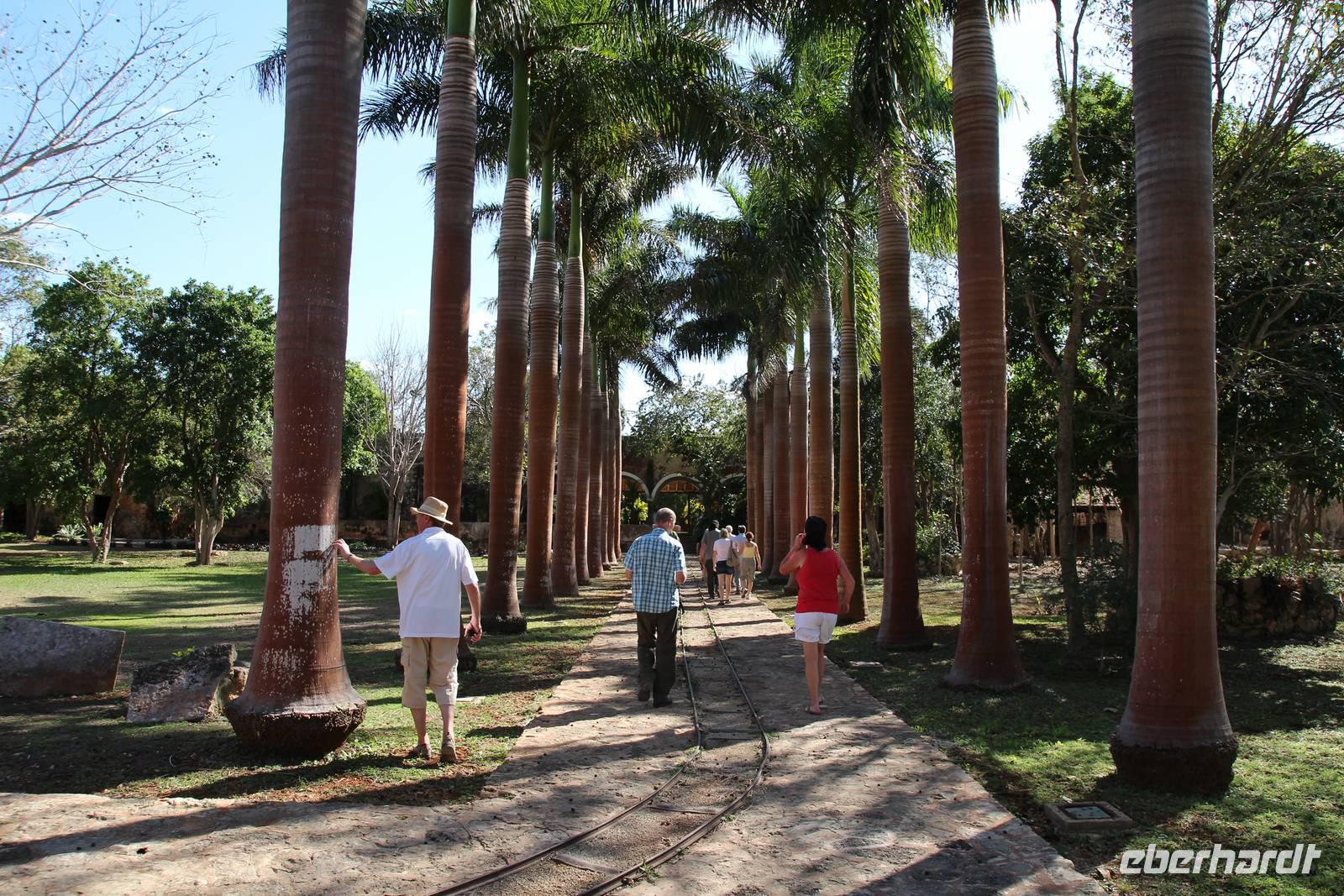 Auch wenn die ersten Hungerserscheinungen langsam zum Vorschein kamen, einen kurzen Halt in Muna mussten wir noch einlegen. Hier besuchten wir die Töpfereikünstlerin Patricia, die alte Maya-Schriften mit feinsten Pinselstrichen auf Tonkrügen nachmalte. Auch den Dresden-Codex hatte sich schon nachgemalt, was uns natürlich an unsere Heimat erinnerte. Nun konnte es zum Essen gehen, welches auf die „Hacienda Ochil" auf uns wartete. Ein wenig verwundert waren wir zunächst beim Eintreffen, denn wir mussten zunächst ein wenig durch den Gärten mit Königspalmen laufen, bis wir die restaurierten Gebäude sehen konnten.
