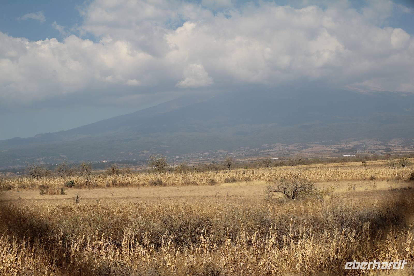 Es standen gute 500 Kilometer auf dem heutigen Programm, entsprechend machten wir es uns im Bus bequem. Mit einem steten Blick auf den wolkenverhangenen Popocatepetl und seine Nachbarvulkane steuerten wir auf Puebla zu. Einen kurzen Stopp nutzten wir für Fotos, der Gipfel blieb aber in den Wolken versteckt.