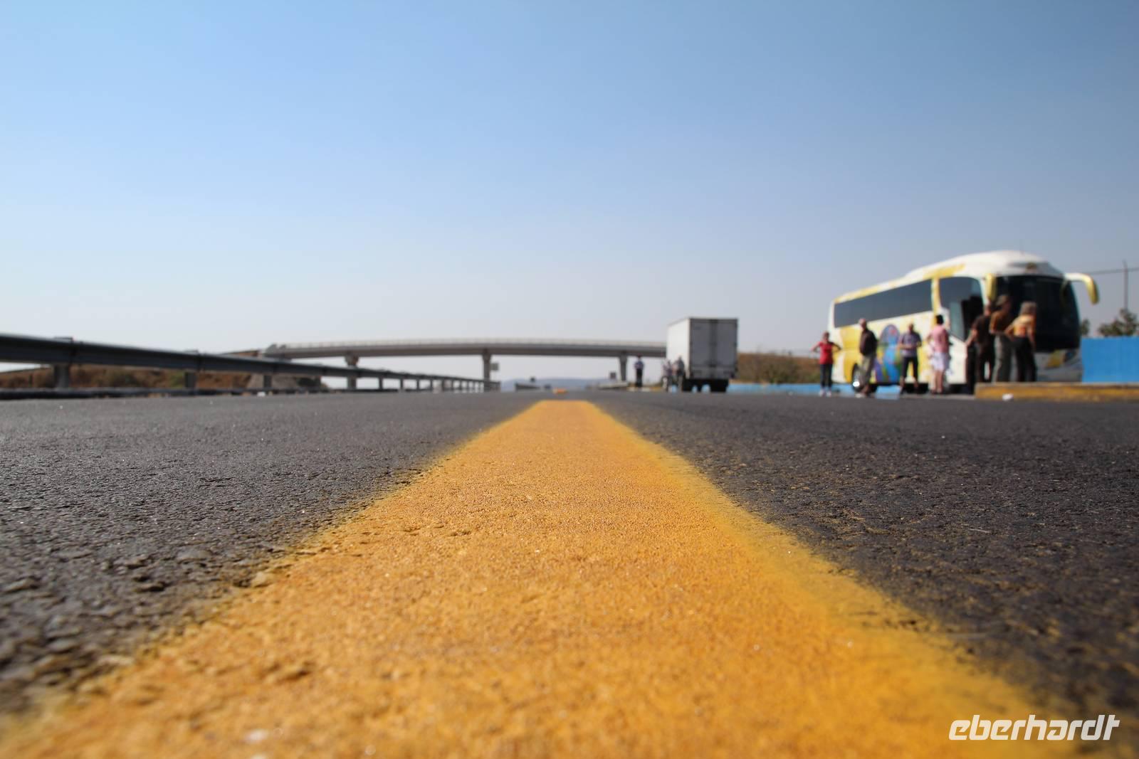 Schon ging es weiter - und führte uns auf der Fahrt nach Cuernavaca noch ein Unfall auf einen kleinen Umweg - so stoppte uns auf unserer Weiterfahrt eine kurze Polizeikontrolle. Und siehe da, wir trafen auf korrupte Polizisten, die unserem Busfahrer direkt Geld abknöpfen wollten, weil das Busunternehmen eine reine Weste hat und wohl sonst nicht zu holen ist. Hiermit sind wir dann endgültig in Mexico angekommen! Unser Busfahrer hat sich leider dieser Staatsmacht ergeben, dafür ging es recht schnell weiter. Auf anderem Wege wäre uns wohl ein Vergehen angedichtet worden.