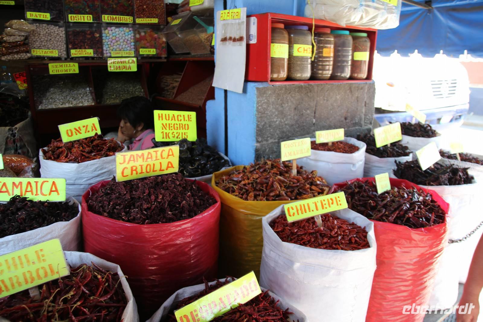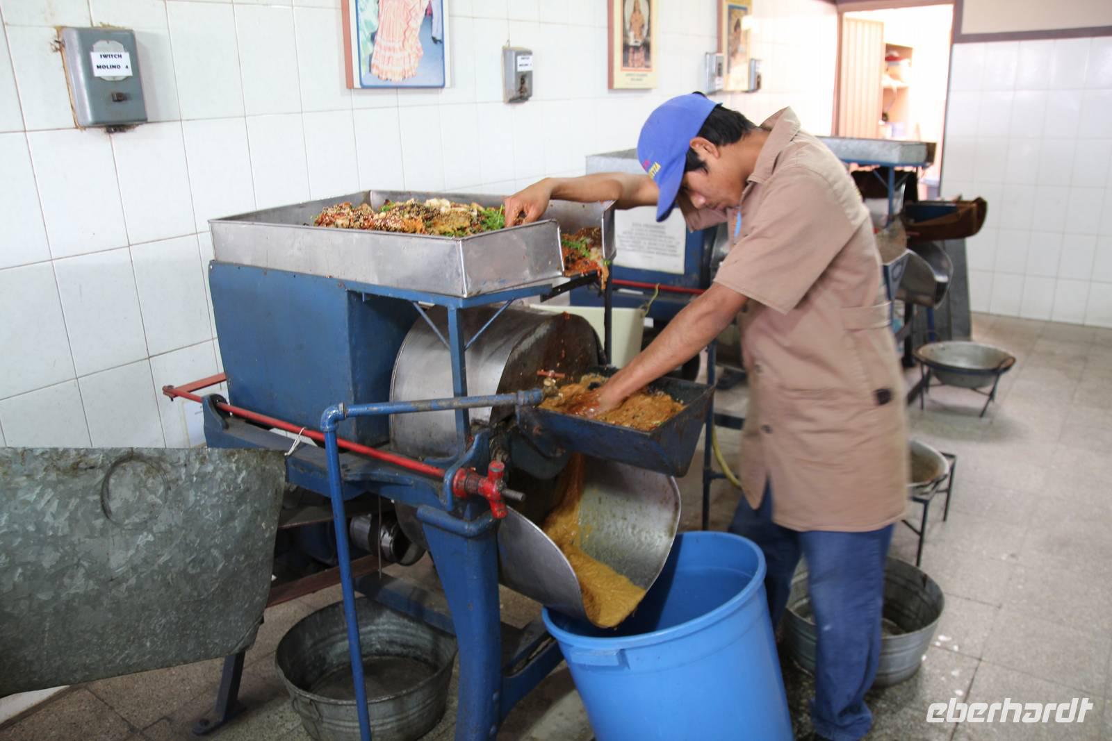 Zurück ging es nach Oaxaca, zunächst in ein Schokoladengeschäft, wo wir zuschauen konnten, wie die Kakaobohnen verarbeitet werden - anschließend durften wir aus dem Resultat frisch hergestellten Kakao probieren und natürlich auch ein wenig Schokolade. Auch über die Zutatenliste der Mole bekamen wir einen gewissen Eindruck, als eine bunte Mischung aus allerlei Essbarem in der Maschine landete. Am Ende sah es tatsächlich aus wie die typische Chili-Schokoladensoße. Gemeinsam besichtigten wir den Markt und gingen über den Zócalo bis zur Kathedrale, nach deren Besichtigung wir uns in unsere Mittagspause verabschiedeten.