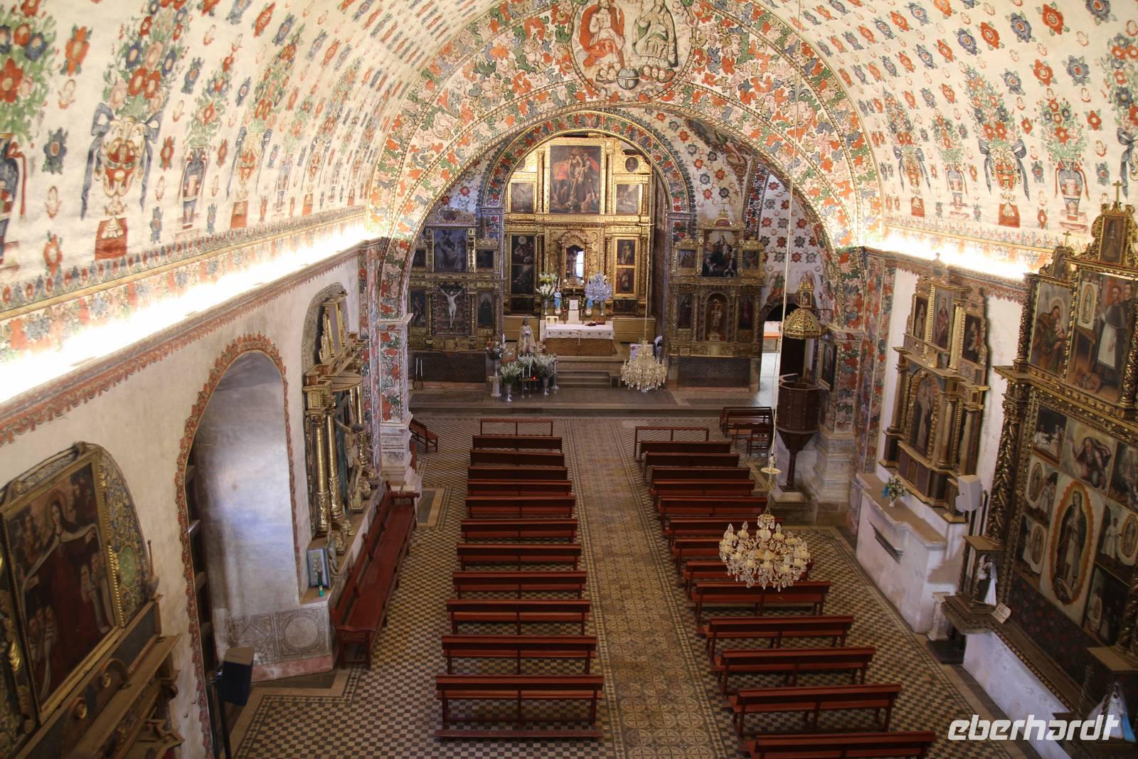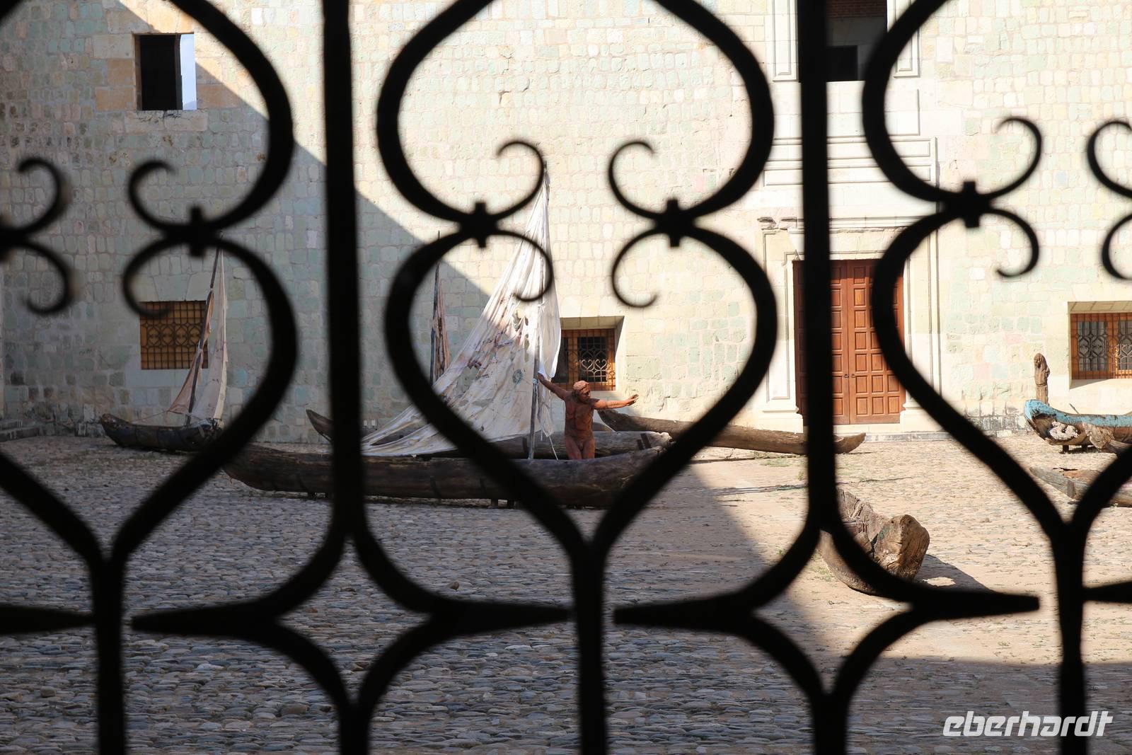 Entlang der Panamerica ging es weiter nach Tlacochahuaya, wo wir das Kloster San Jerónimo aus dem 16. Jahrhundert besuchen wollten. Doch hier waren wir dafür etwas zu früh, denn die Türen waren noch verschlossen. Ruth machte sich aber direkt auf in das Dorf um den Schlüsselbesitzer ausfindig zu machen. Wir warteten geduldig und wenig später traf Ruth auch mit einem Tuk Tuk und froher Kunde bei uns ein. Wenige Minuten später konnten wir das Kloster auch betreten und die hübsche Blasbalgorgel bestaunen.