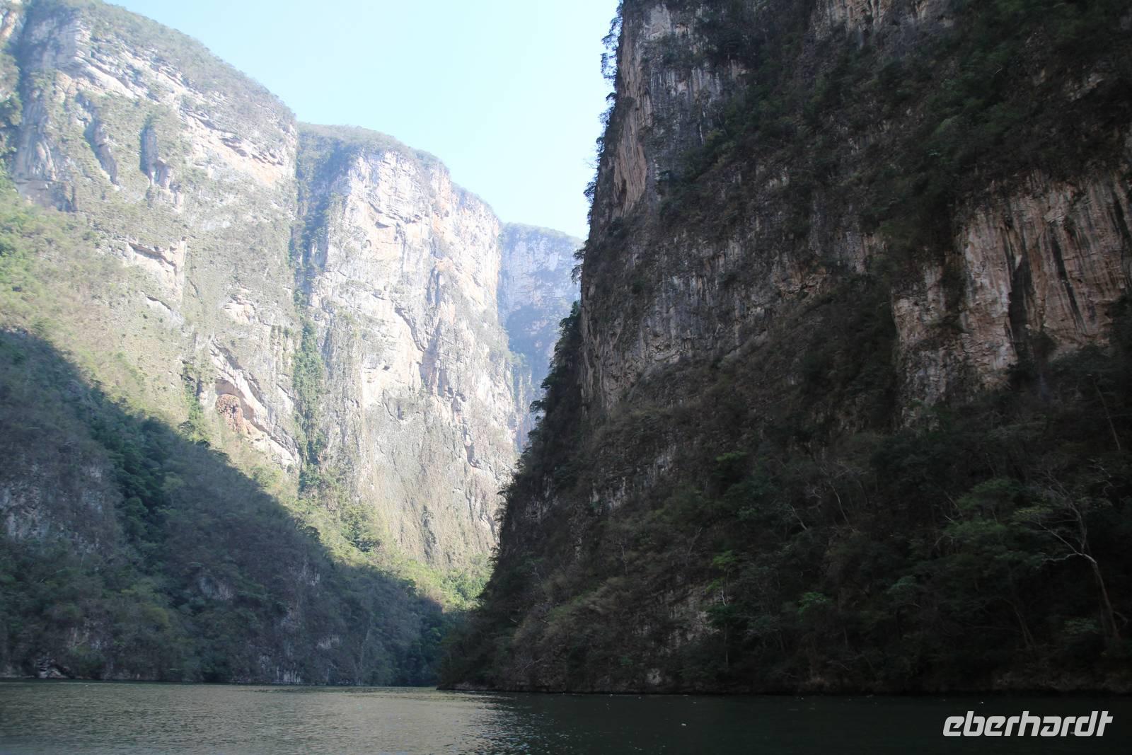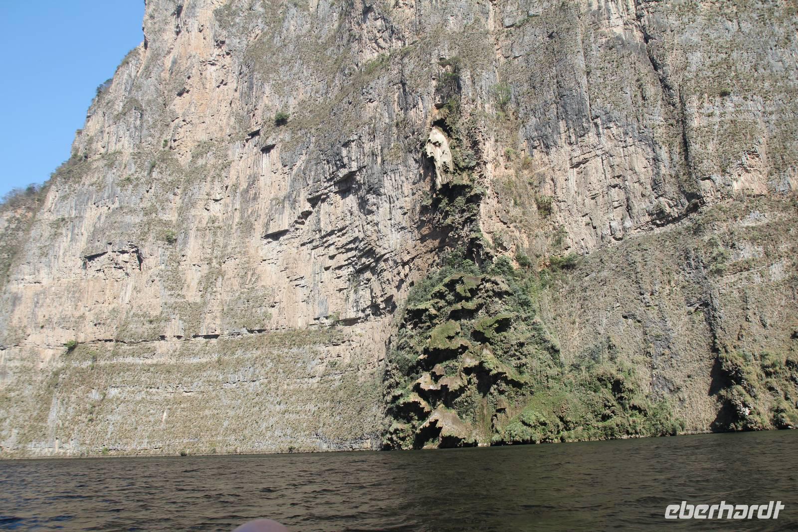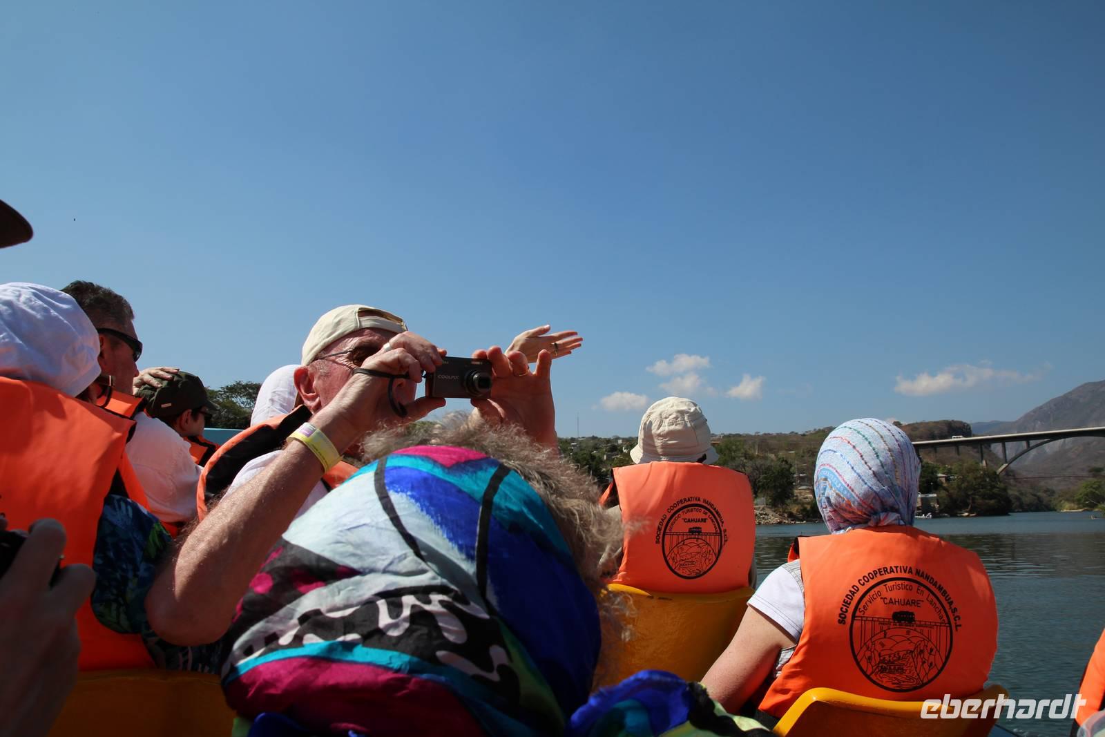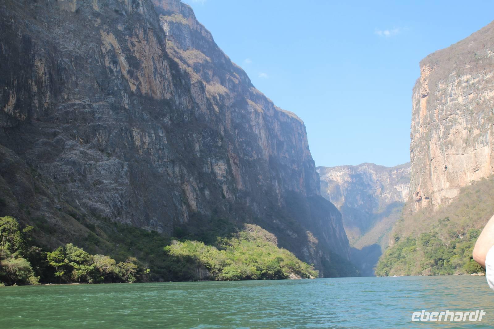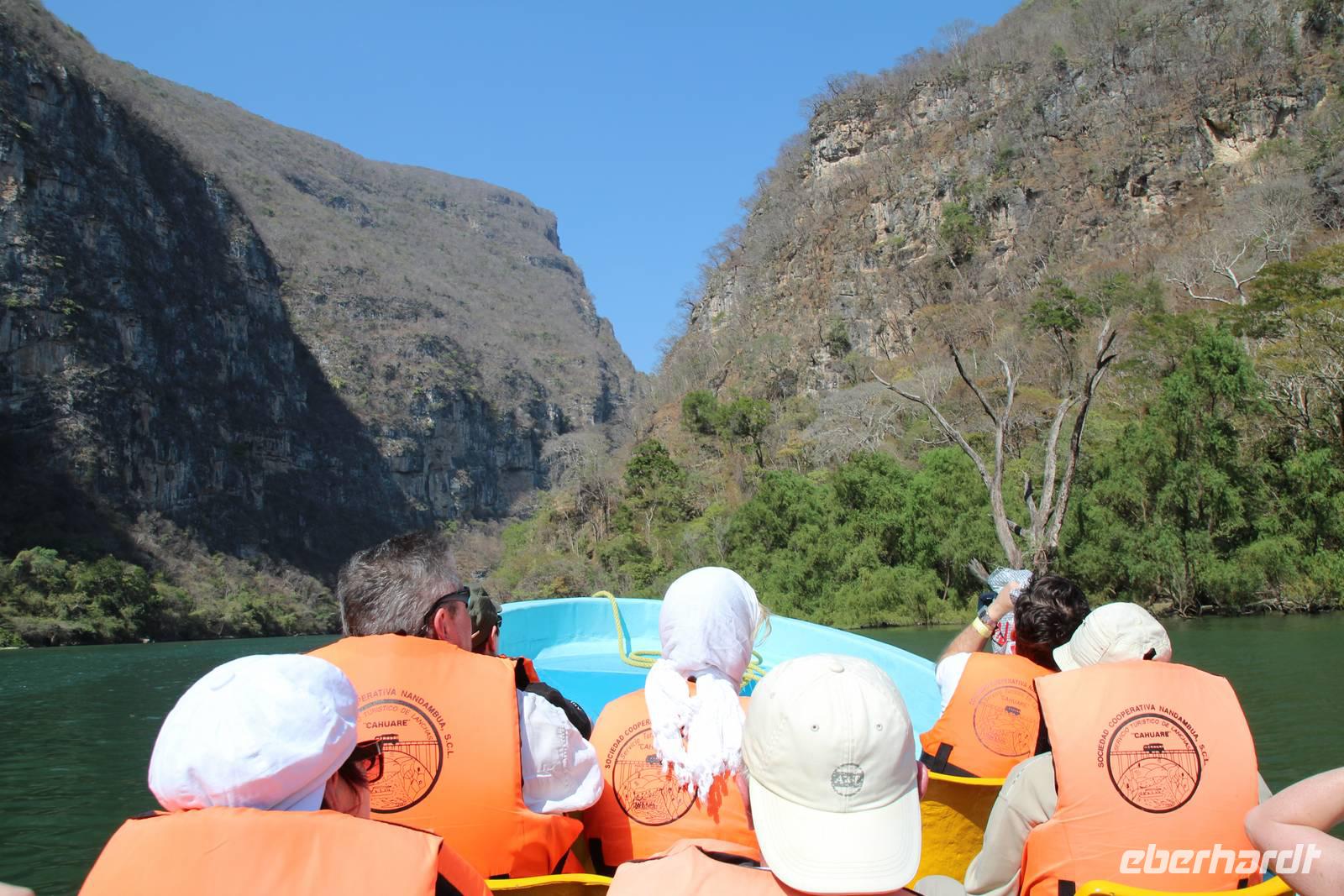 Am Fluss Rio Grijalva wurden wir dann sicher mit Schwimmwesten ausgerüstet und schon konnte die rasante Bootsfahrt durch die Sumidero Schlucht starten. Entlang unseres Weges stoppten wir immer wieder, unser Bootsführer zeigte uns die verschiedenen Vogelarten, die hier lebten. Auch Brüllaffen und Krokodile begegneten uns auf unserem Weg durch den Canyon mit seinen teilweise 1000 Meter hohen Felswänden. Am „Weihnachtsbaum" wendeten wir, nach insgesamt etwa 2 Stunden hatten wir dann wieder festen Boden unter den Füßen und waren um einige Erfahrungen reicher.