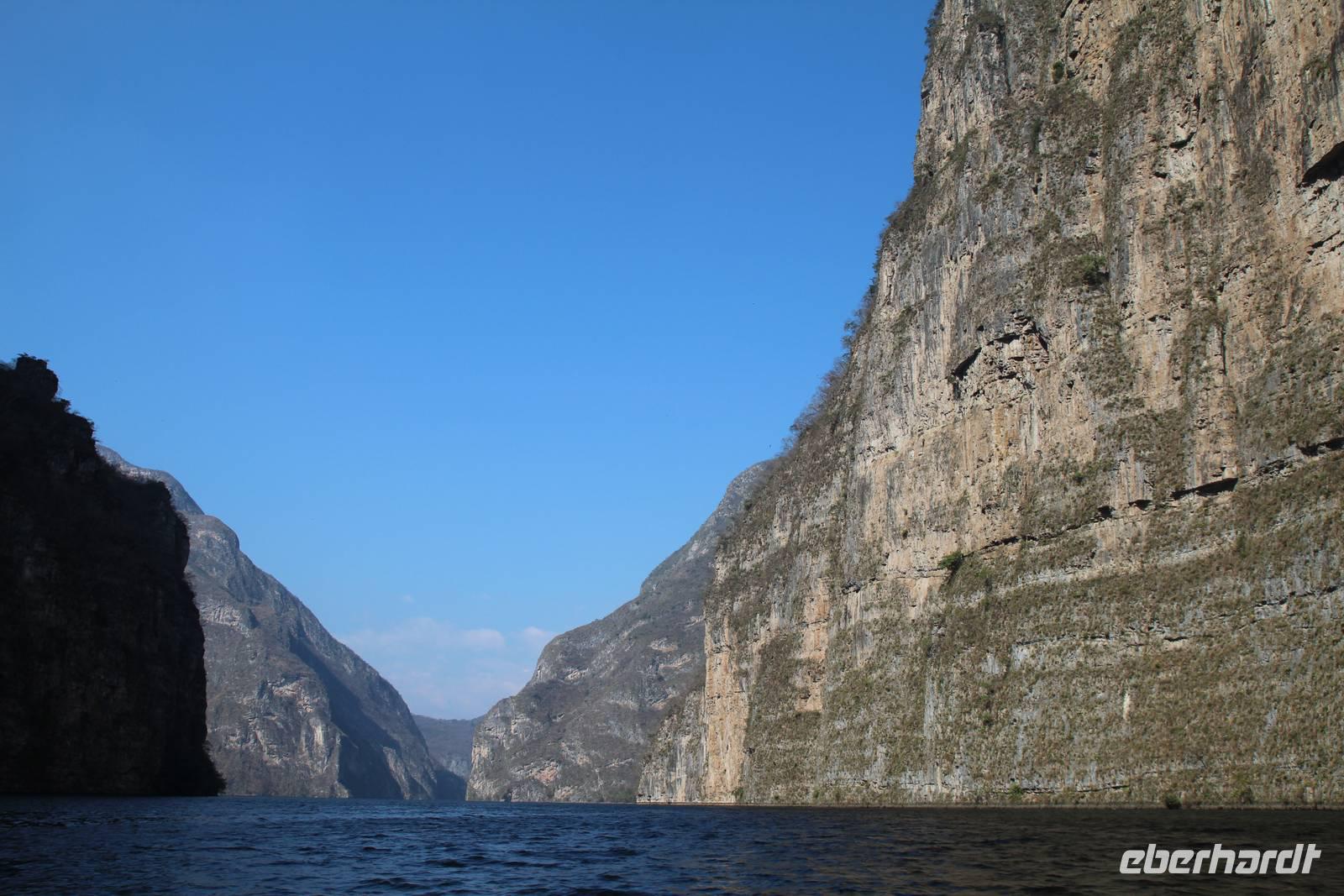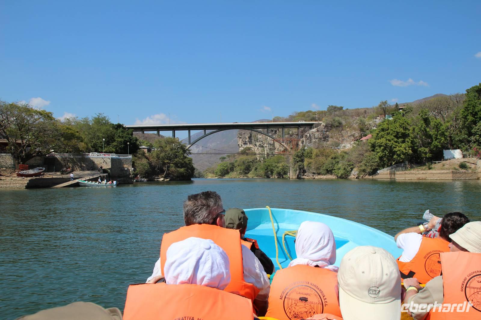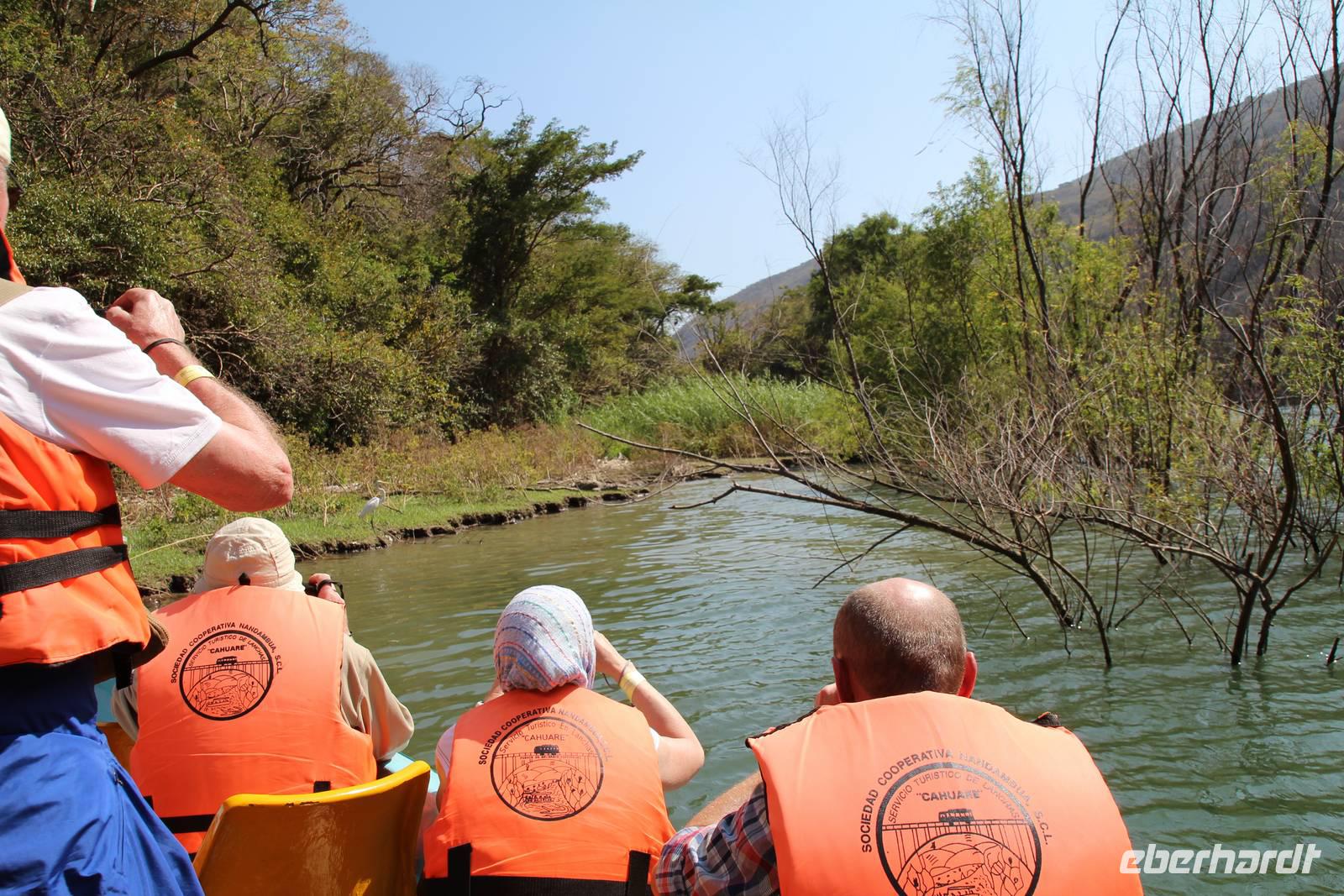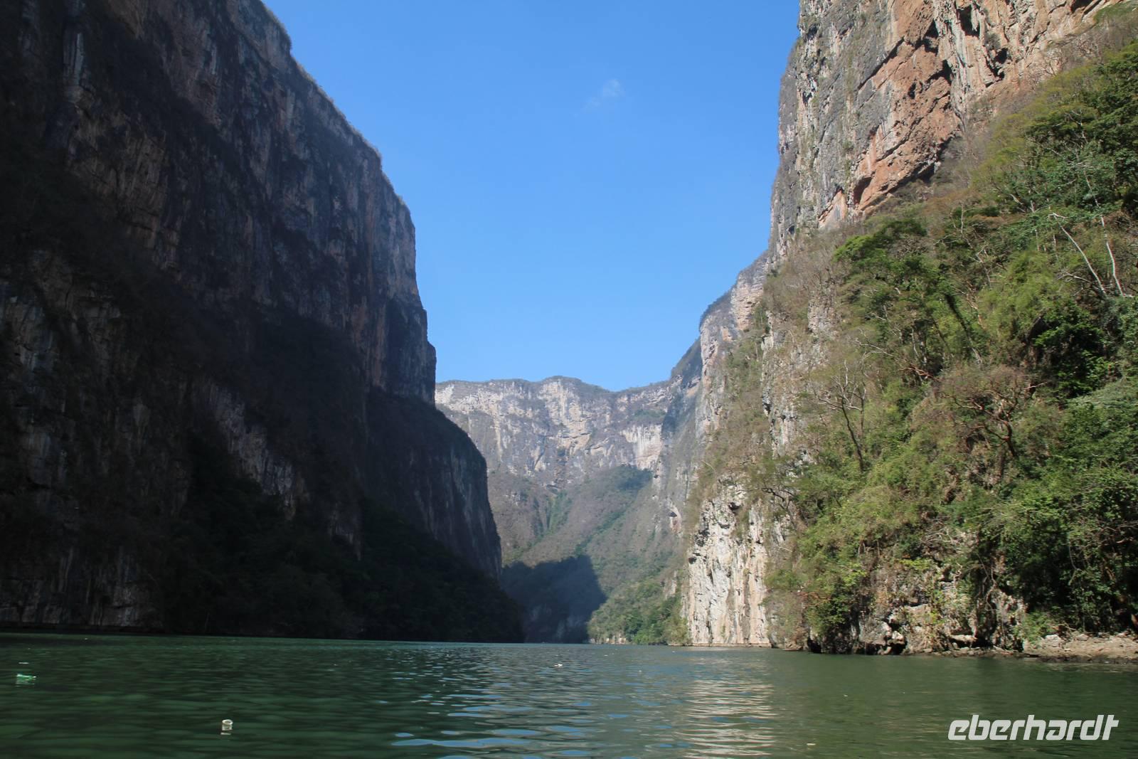 Am Fluss Rio Grijalva wurden wir dann sicher mit Schwimmwesten ausgerüstet und schon konnte die rasante Bootsfahrt durch die Sumidero Schlucht starten. Entlang unseres Weges stoppten wir immer wieder, unser Bootsführer zeigte uns die verschiedenen Vogelarten, die hier lebten. Auch Brüllaffen und Krokodile begegneten uns auf unserem Weg durch den Canyon mit seinen teilweise 1000 Meter hohen Felswänden. Am „Weihnachtsbaum" wendeten wir, nach insgesamt etwa 2 Stunden hatten wir dann wieder festen Boden unter den Füßen und waren um einige Erfahrungen reicher.