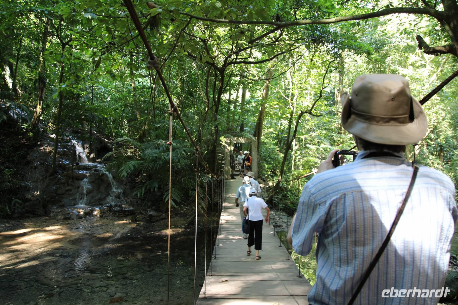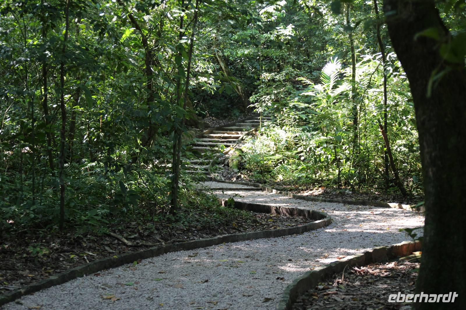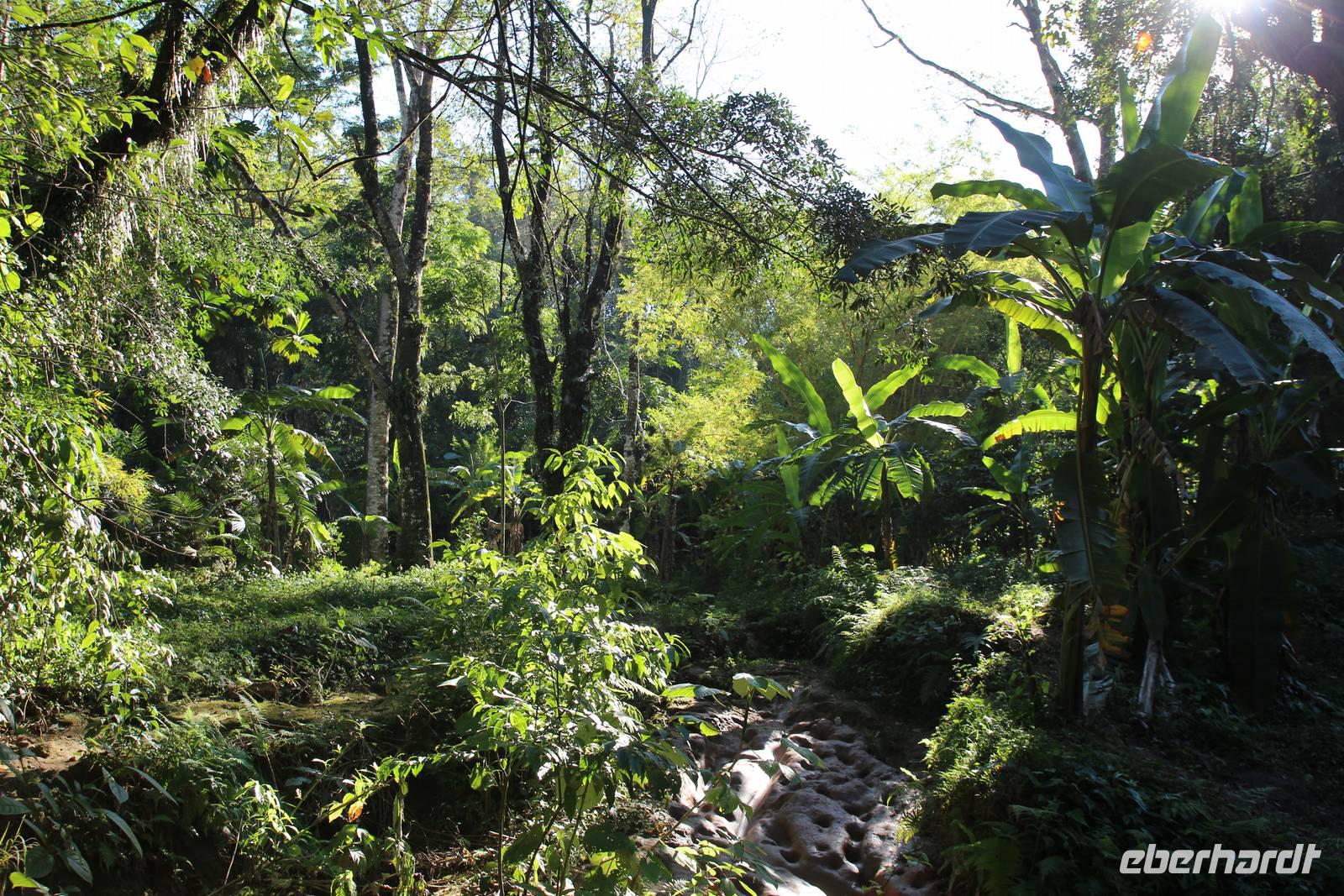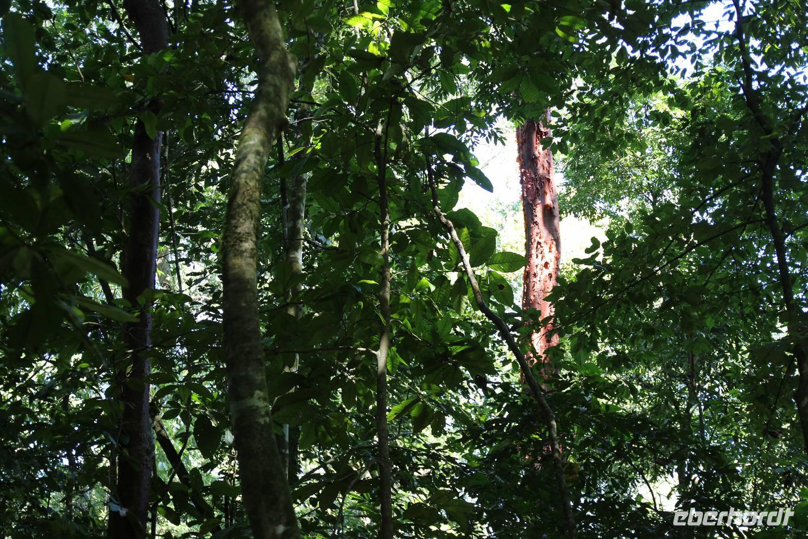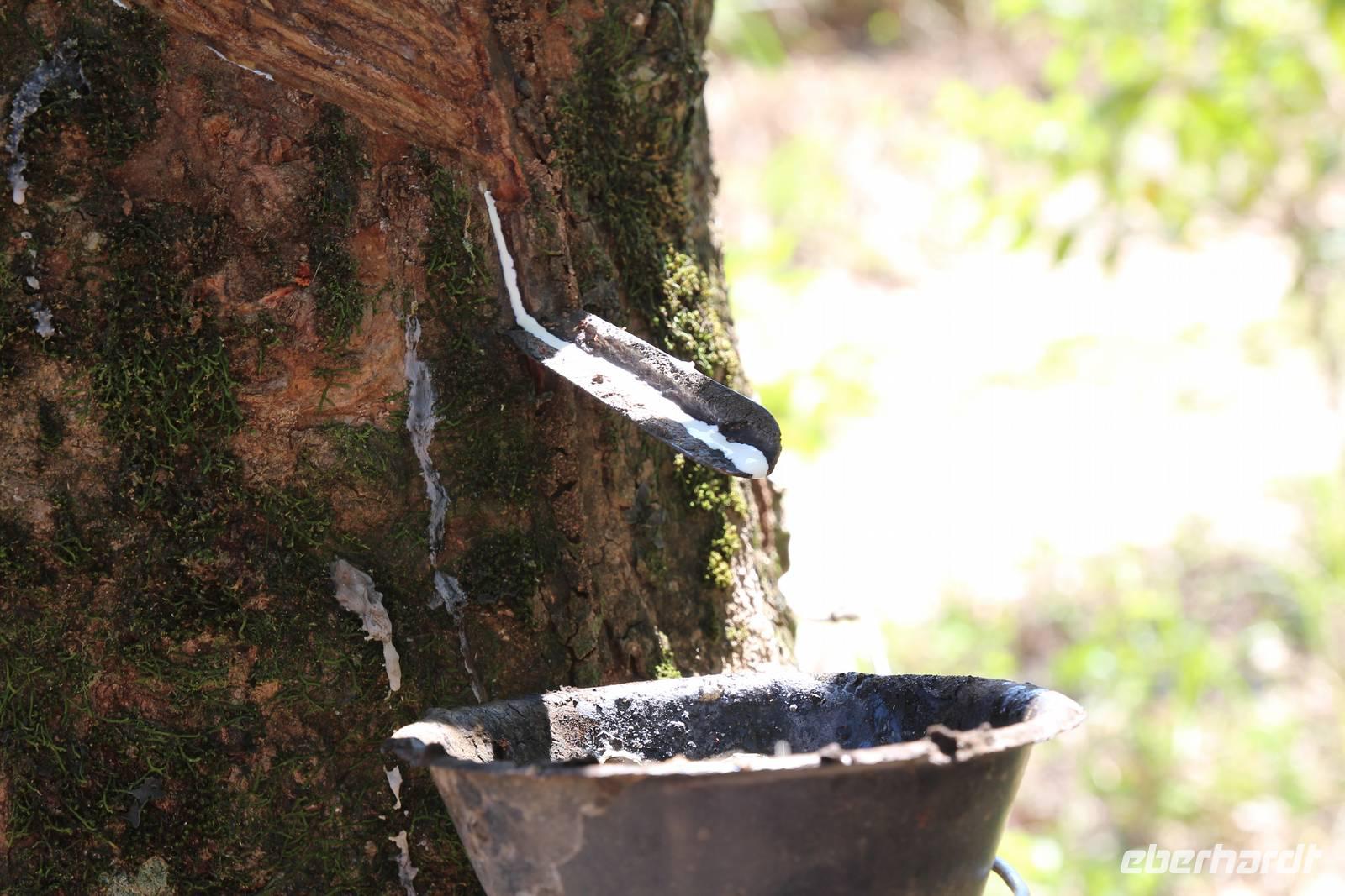 Um unseren Aufenthalt im Dschungelgebiet abzurunden gingen wir noch einen sehr schönen Pfad hinab zum Bus. Mitten durchs Grün ergaben sich hier wieder einige Fotomotive, ebenso waren wir vor der Hitze geschützt, die nun doch schon etwas drückend wurde - es ging ja auch schon wieder dem Mittag zu, wie doch die Zeit vergeht. Doch zuvor hielten wir noch an einer kleinen Kautschukplantage, wo uns die Zucht der Gummibäume, sowie die Ernte und Verarbeitung des Kautschuks näher gebracht wurden.