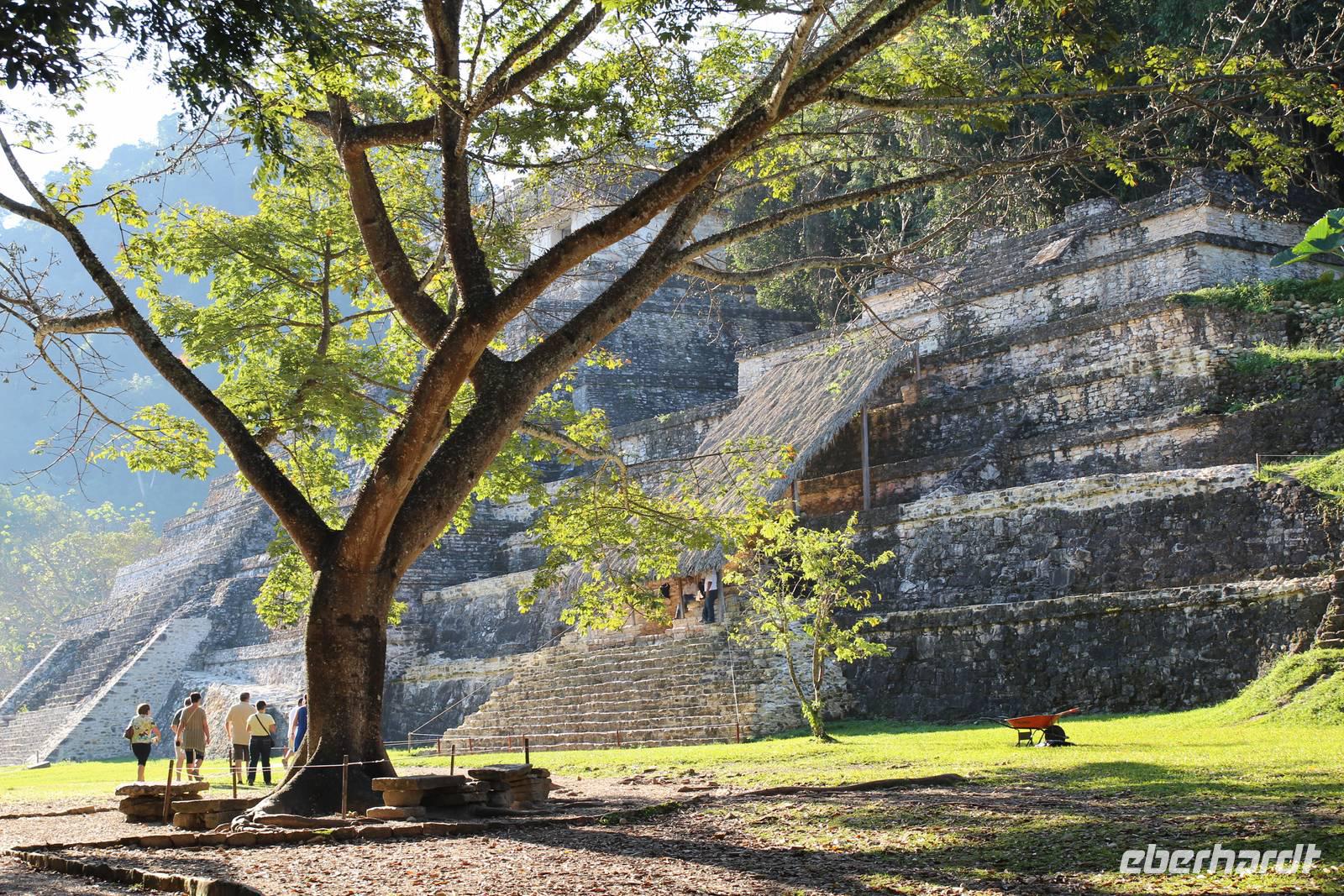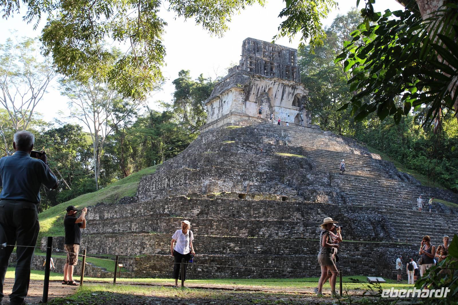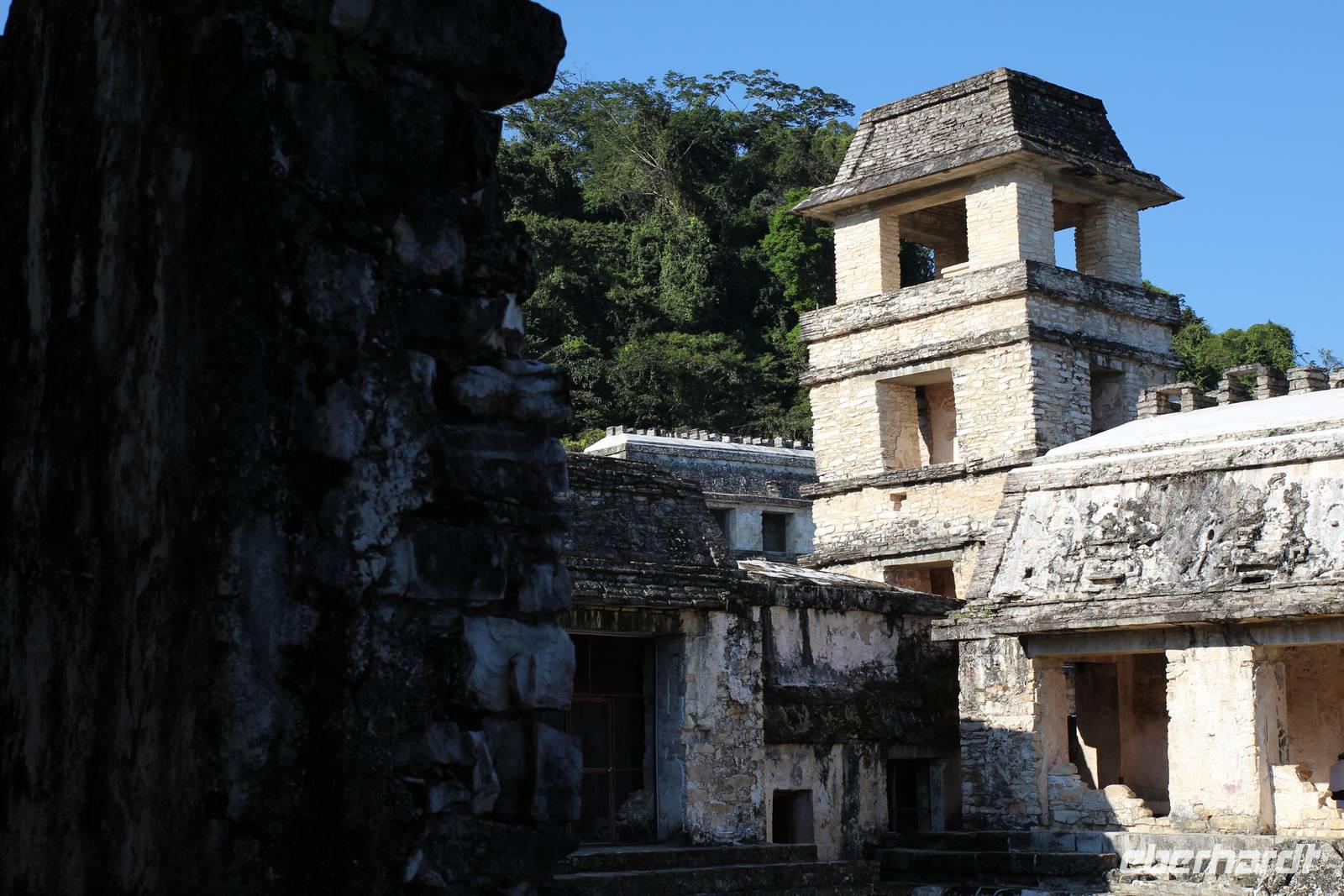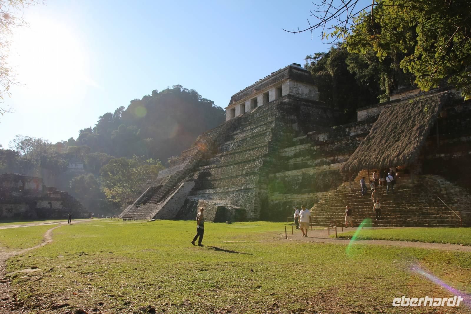 Am frühen Morgen wurden wir durch wunderliche Geräusche geweckt, ein Brüllaffe sehnte die Sonne herbei und nahm dabei auf uns keine Rücksicht. Doch wir wollten sowieso wieder zeitig aus den Betten. Nach einem Frühstück auf der Terrasse ging es auch schon los in den Nationalpark von Palenque. Hier waren wir so ziemlich die ersten, selbst die Hitze war noch nicht da, so dass wir die Anlage in Ruhe erkunden und die alten Gemäuer zum Teil auch noch besteigen konnten.