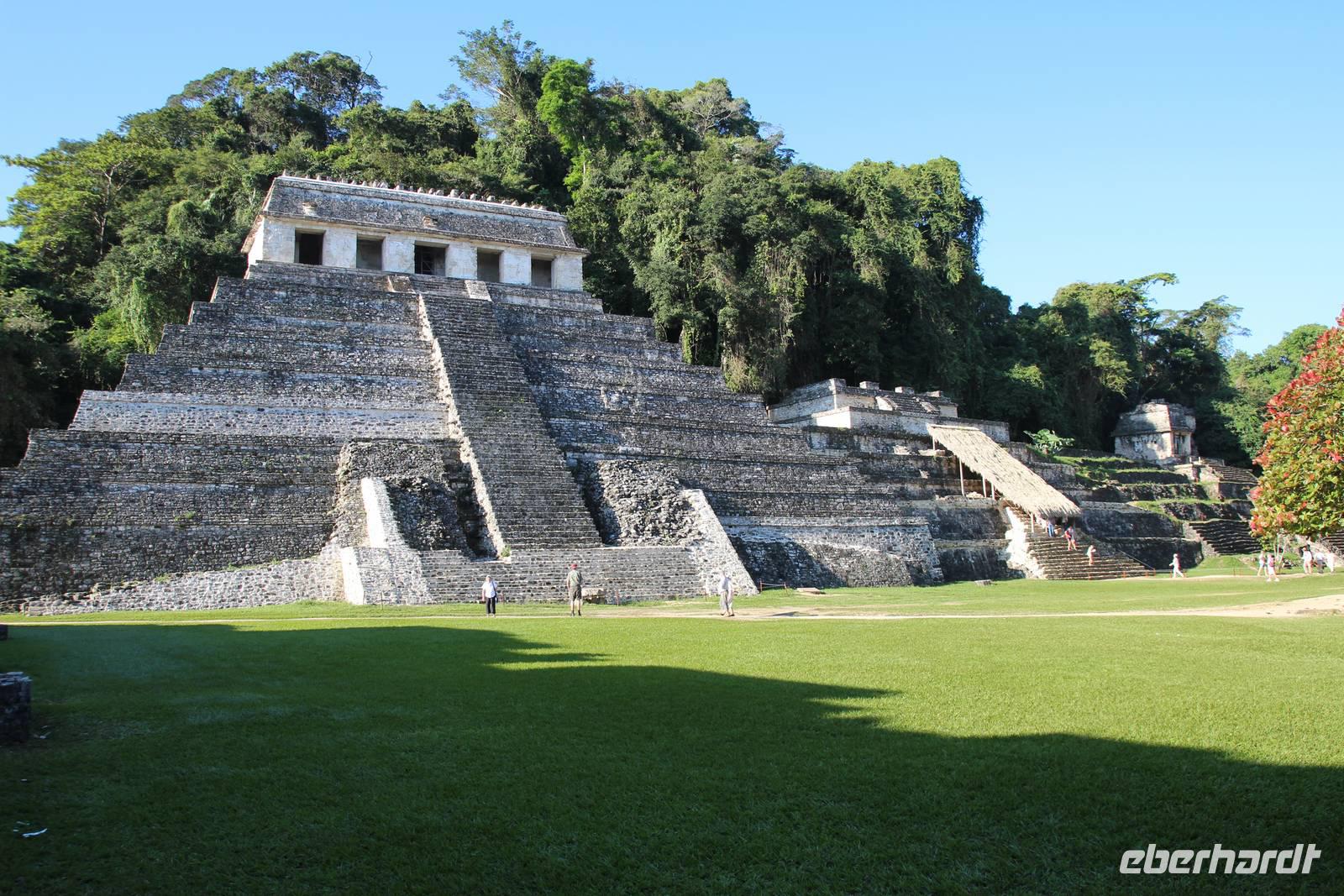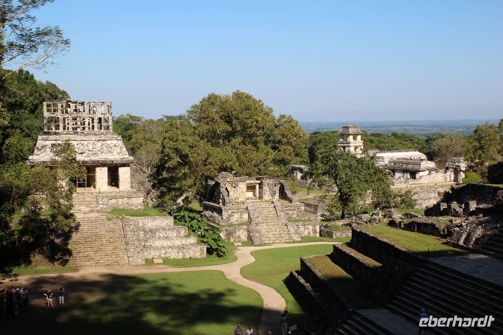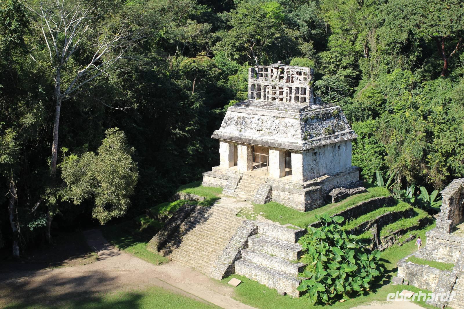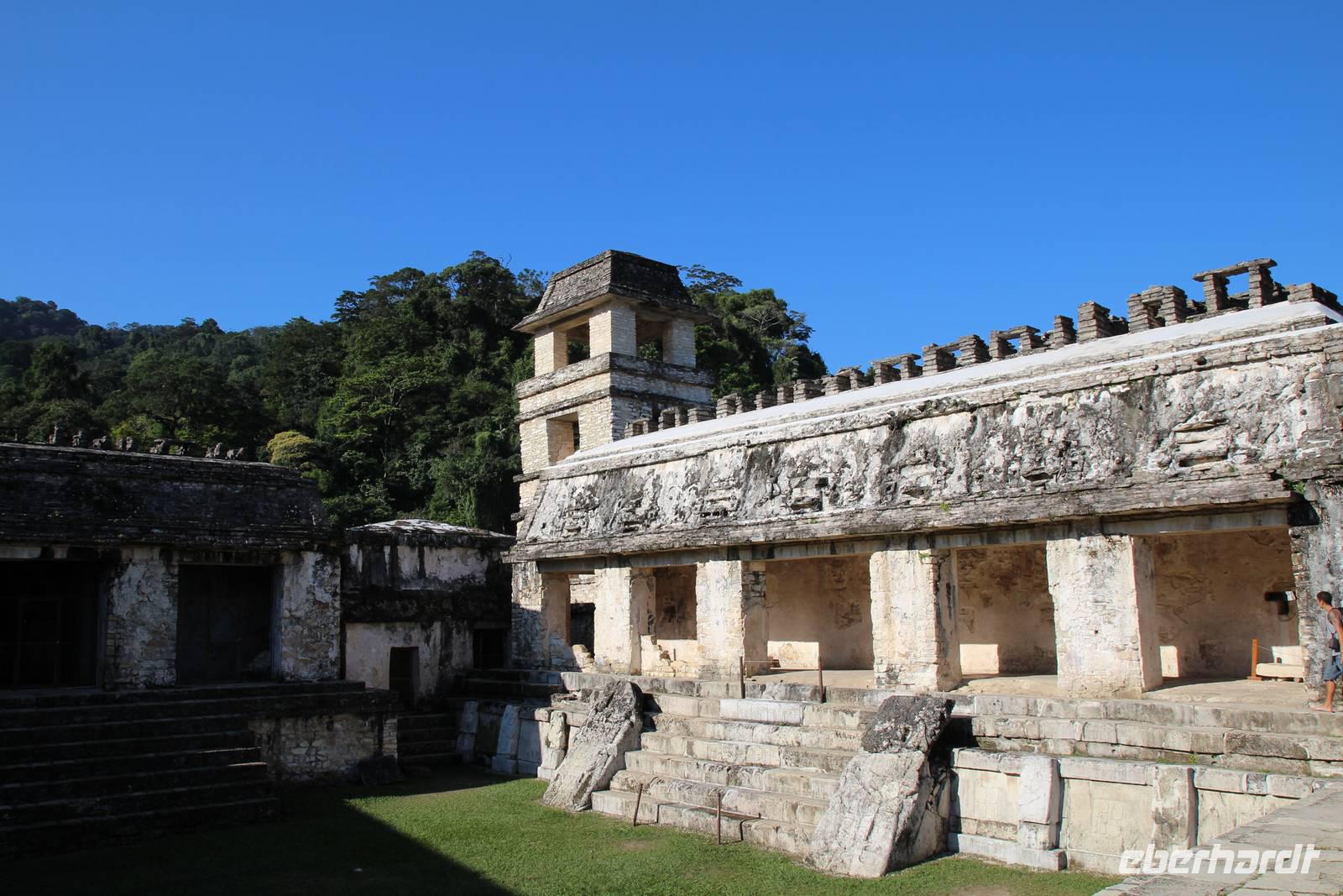 Am frühen Morgen wurden wir durch wunderliche Geräusche geweckt, ein Brüllaffe sehnte die Sonne herbei und nahm dabei auf uns keine Rücksicht. Doch wir wollten sowieso wieder zeitig aus den Betten. Nach einem Frühstück auf der Terrasse ging es auch schon los in den Nationalpark von Palenque. Hier waren wir so ziemlich die ersten, selbst die Hitze war noch nicht da, so dass wir die Anlage in Ruhe erkunden und die alten Gemäuer zum Teil auch noch besteigen konnten.