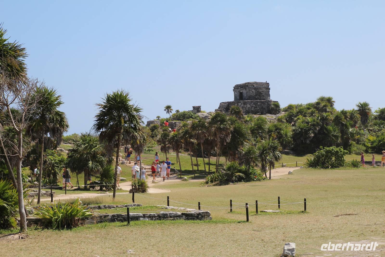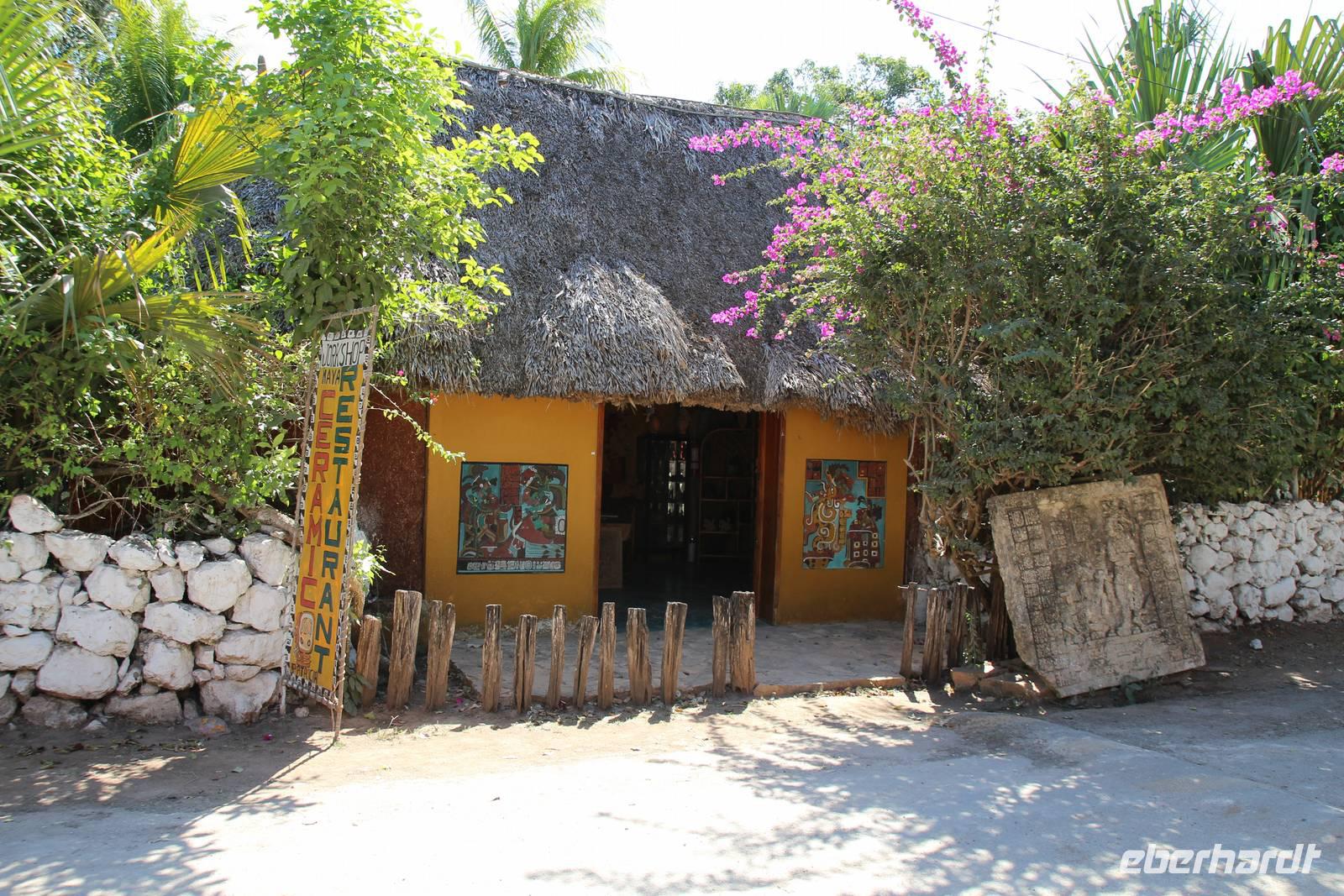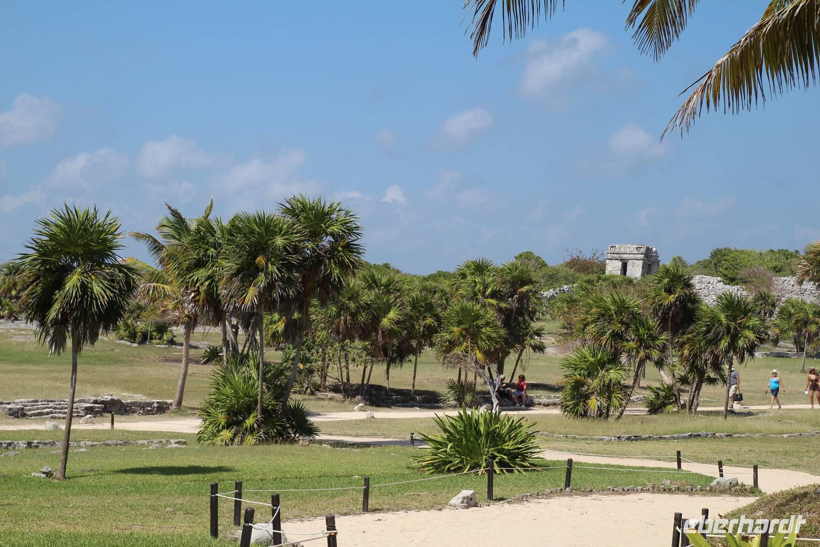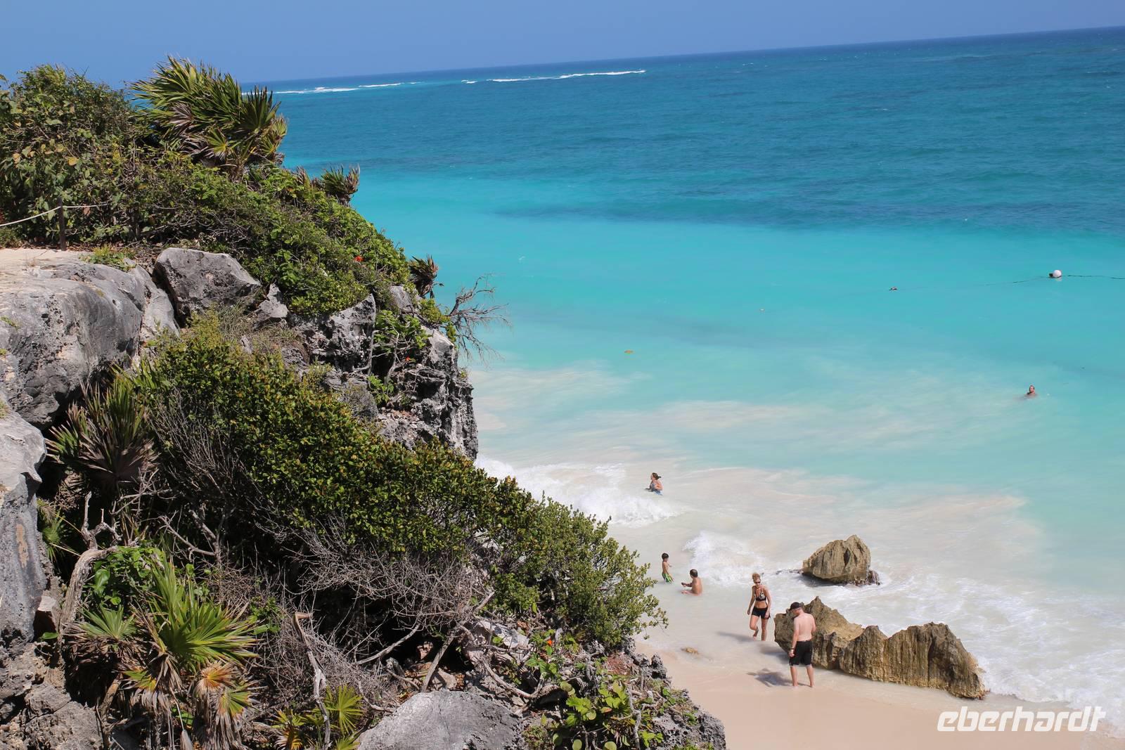 Unser letzter Tag der Rundreise war nun bereits gekommen. Aufgrund der bekannten und steten Pünktlichkeit unserer Gruppe, war es möglich einen weiteren kleinen zusätzlichen Halt zu machen: Wir besuchten den Ort Villadoid bevor es nach Tulum weiter ging. Um die „verlorene" Zeit wieder aufzuholen entschieden wir uns, den Weg vom Busparkplatz bis zur Ausgrabungs-Anlage von Tulum mit der Bimmelbahn zurück zu legen - Eberhardt bezahlte natürlich. In Tulum trafen wir dann auch schon auf die ersten Karibik-Urlauber, die sich wohl weniger an den Bauwerken, sondern vielmehr für das Wasser interessierten. Das blaue Meer bot uns aber wundervolle Motive, einige wären auch gern schon ins Wasser gesprungen, aber das ist hier nicht ganz so ungefährlich. Auch hatten wir ja den späteren und den morgigen Tag ausreichend Zeit das nachzuholen. Auf der Anlage hatten wir uns dann vor lauter Träumerei etwas verloren - wir bildeten nun zwei Grüppchen, fanden uns aber am besprochenen Treffpunkt alle wieder zusammen.